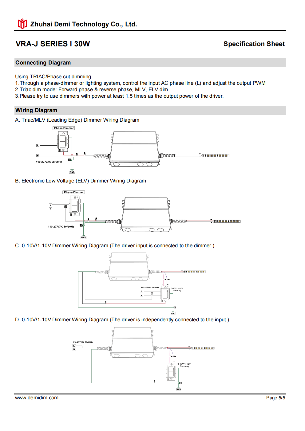 Item number: VRA-H12120J,VRA-H24120J Type : Constant voltage Dimming Mode: Triac/0-10V/1-10V/10V PWM / Potentiometer Output Method: Amplitude Modulation Input Voltage: 110-277V Output Voltage: 12V/24V PF: ≥0.9 Efficiency: ≥85% Warranty: 5 years. Protection: short circuit,overload,over-temperature, Certificate: UL list Brand: DEMI