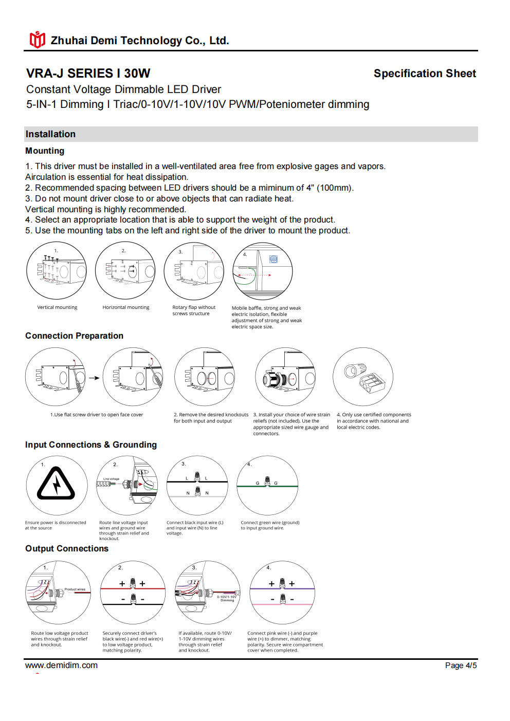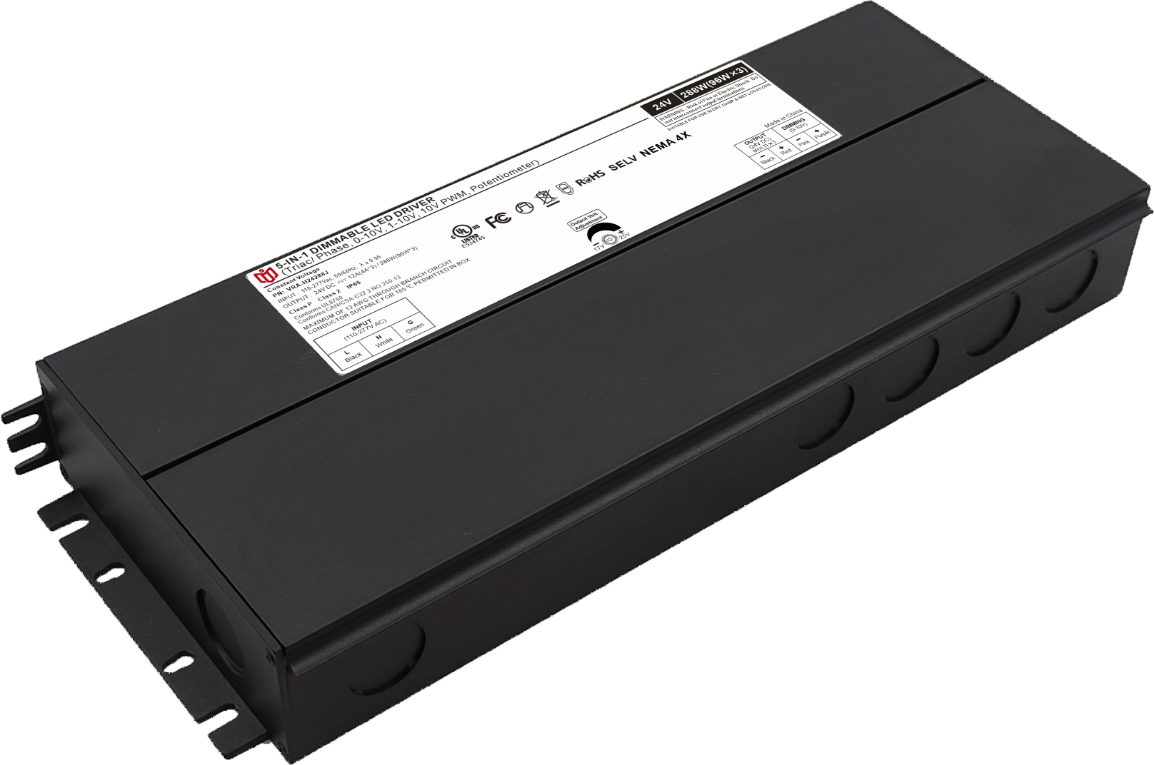 Item number: VRA-12300J,VRA-24300J,VRA-48300J, Type : Constant voltage Dimming Mode: Triac/0-10V/1-10V/10V PWM / Potentiometer Output Method: Amplitude Modulation Input Voltage: 110-277V Output Voltage: 12V/24V/48V PF: ≥0.9 Efficiency: ≥91% Warranty: 5 years. Protection: short circuit,overload,over-temperature, Certificate: UL list Brand: DEMI