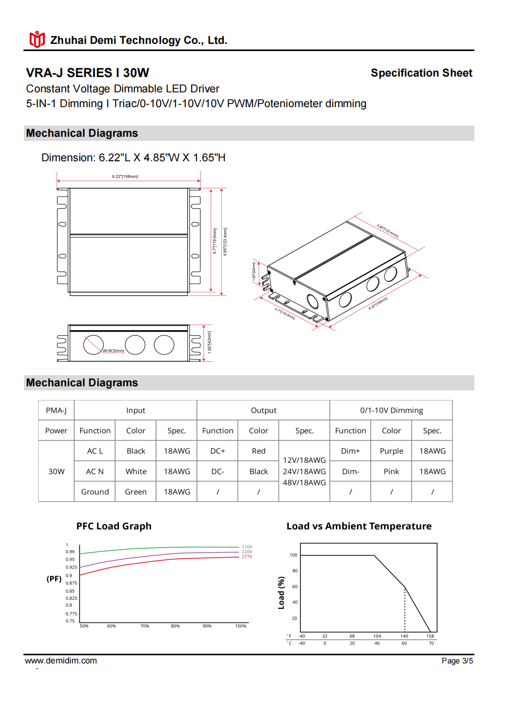 Item number: VRA-12030J,VRA-24030J.VRA-48030J Type : Constant voltage Dimming Mode: Triac/0-10V/1-10V/10V PWM / Potentiometer Output Method: Amplitude Modulation Input Voltage: 110-277V Output Voltage: 12V/24V/48V PF: ≥0.9 Efficiency: ≥85% Warranty: 5 years. Protection: short circuit,overload,over-temperature, Certificate: UL list Brand: DEMII