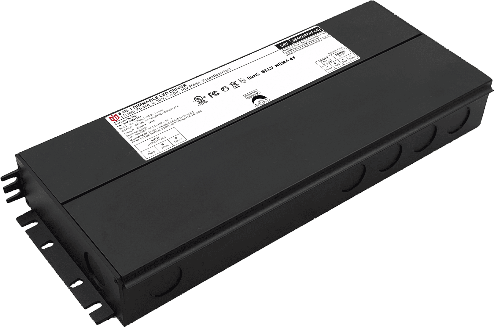 Item number: VRA-H24384J,VRA-H48384J, Dimming Mode: Triac/0-10V/1-10V/10V PWM / Potentiometer Output Method: Amplitude Modulation Input Voltage: 110-277V Output Voltage: 24V/48V PF: ≥0.9 Efficiency: ≥92% Warranty: 5 years. Protection: short circuit,overload,over-temperature, Certificate: UL list Brand: DEMI