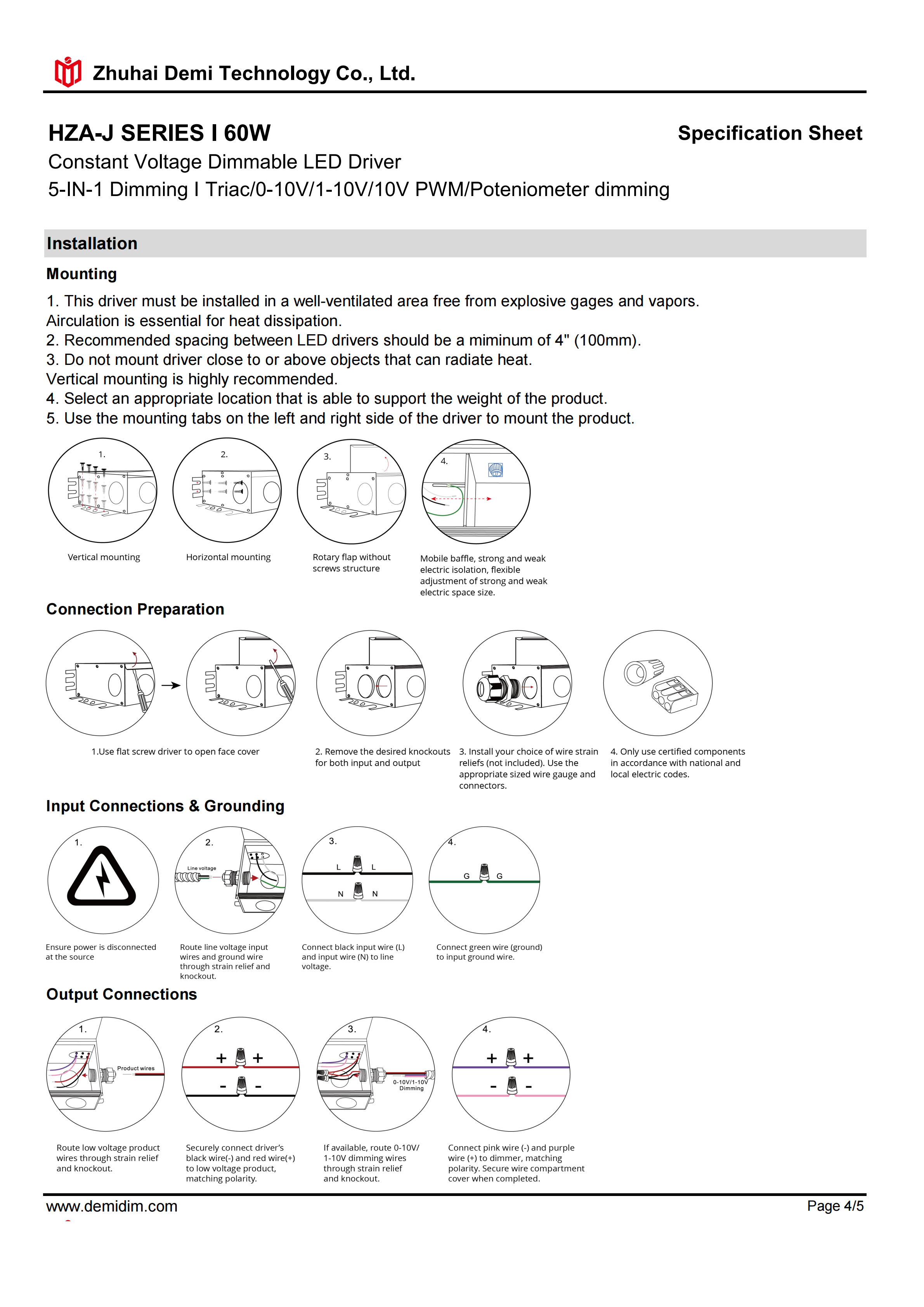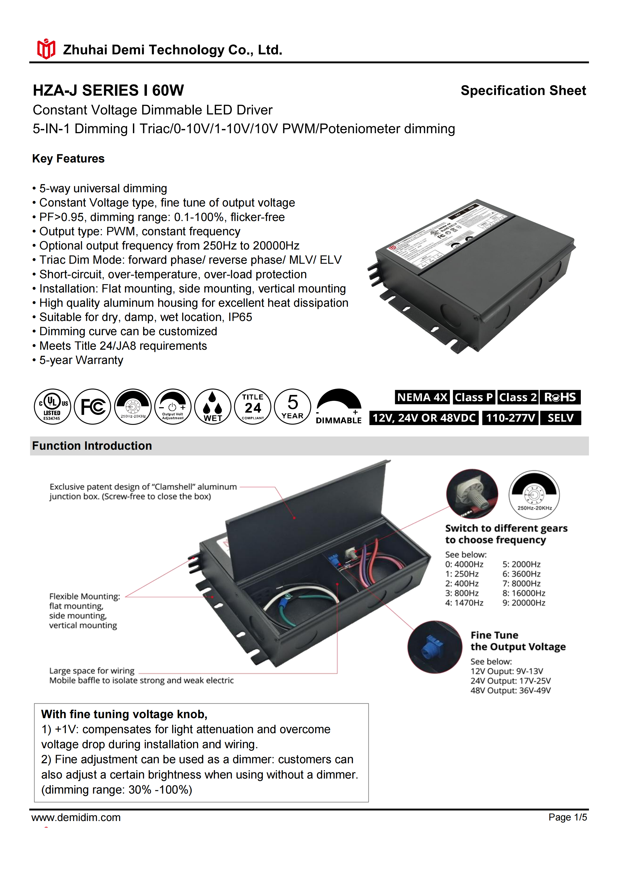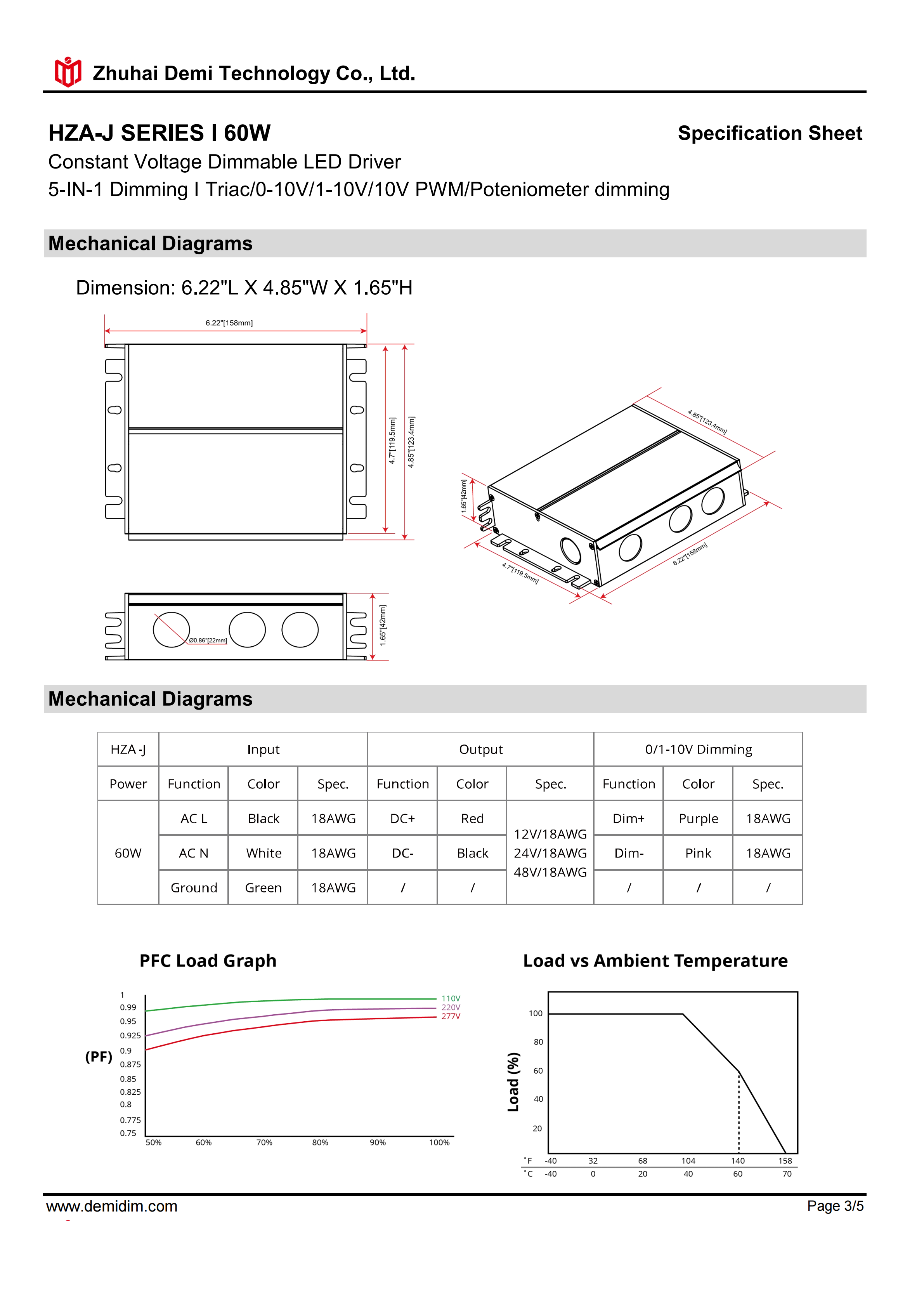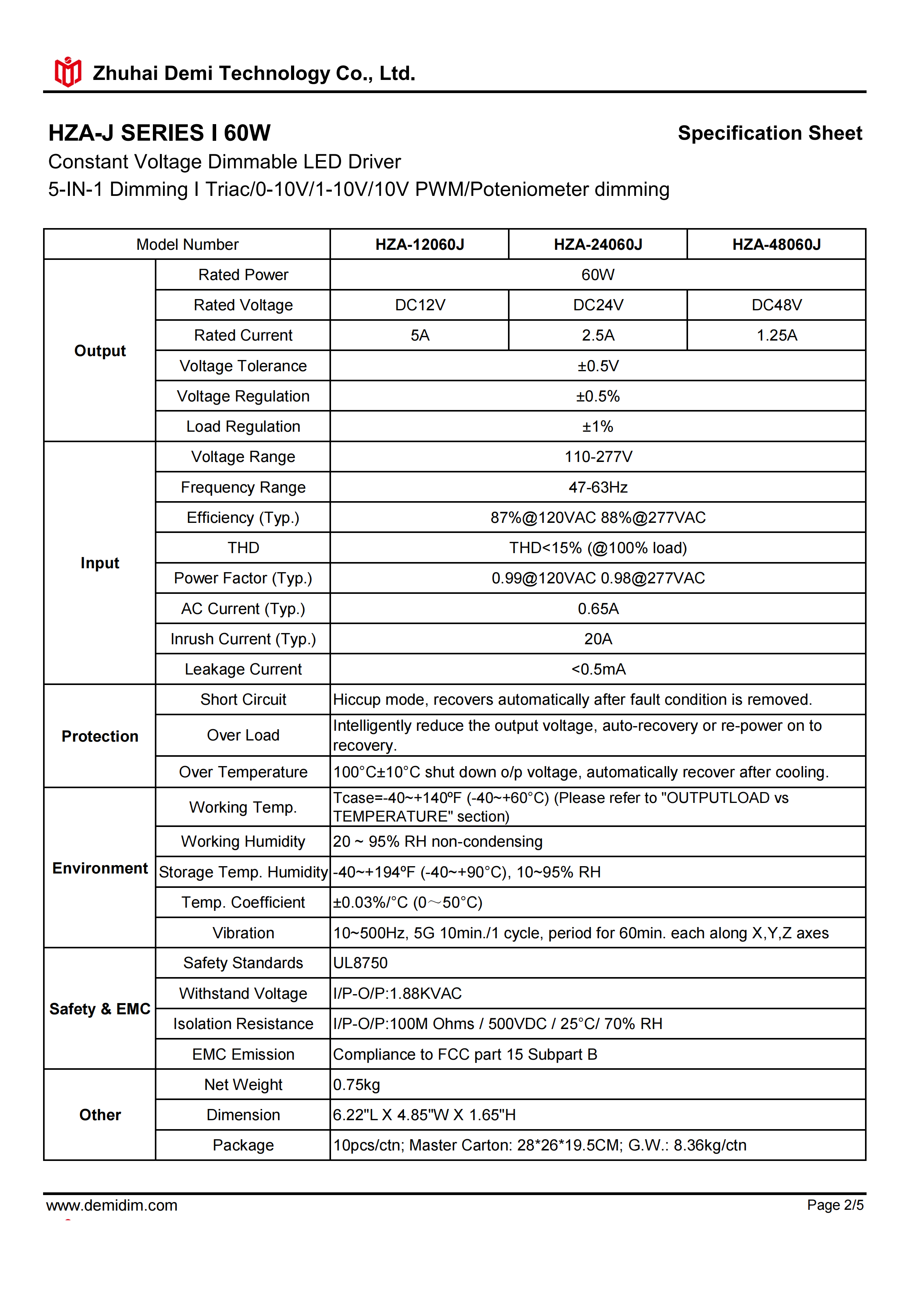 Item number: HZA-12060J,HZA-24060J,HZA-48060J Dim: Triac/0-10V/1-10V/10V PWM / Potentiometer Dimming method: PWM Input Voltage: 110-277V Output Voltage: 12V/24V/48V PF: ≥0.9 Efficiency: ≥87% Protection: short circuit,overload,over-temperature, Certificate: UL list Brand: DEMI