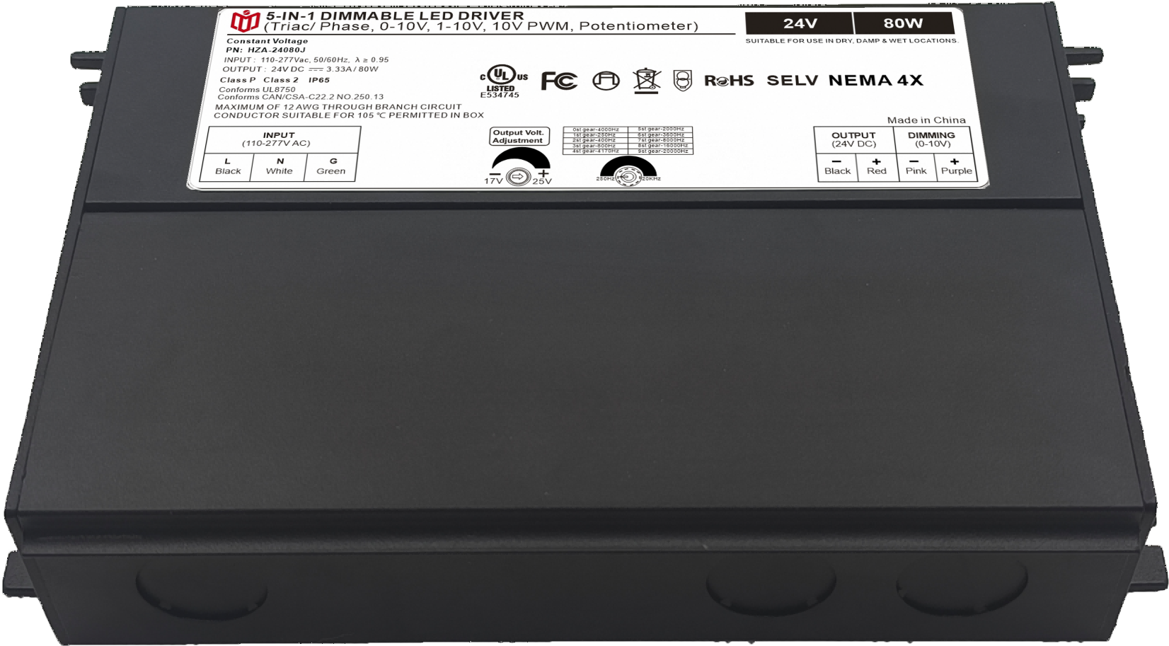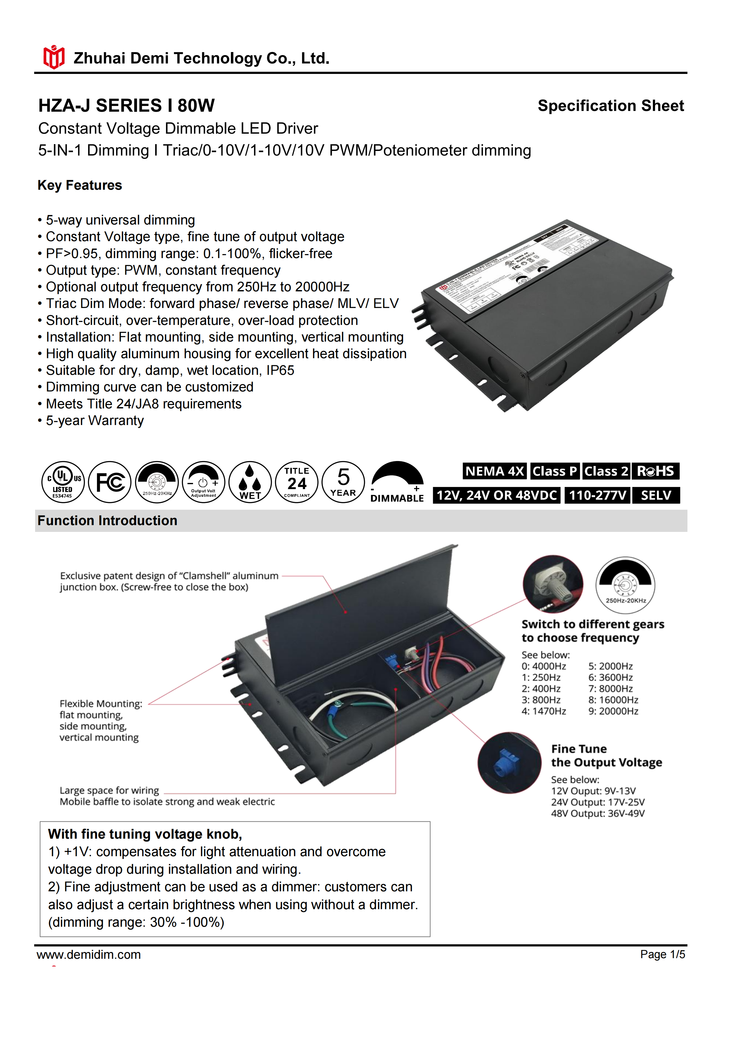 Item number: HZA-12080J,HZA-24080J,HZA-48080J Dim: Triac/0-10V/1-10V/10V PWM / Potentiometer Dimming method: PWM Input Voltage: 110-277V Output Voltage: 12V/24V/48V PF: ≥0.9 Efficiency: ≥88% Protection: short circuit,overload,over-temperature, Certificate: UL list Brand: DEMI