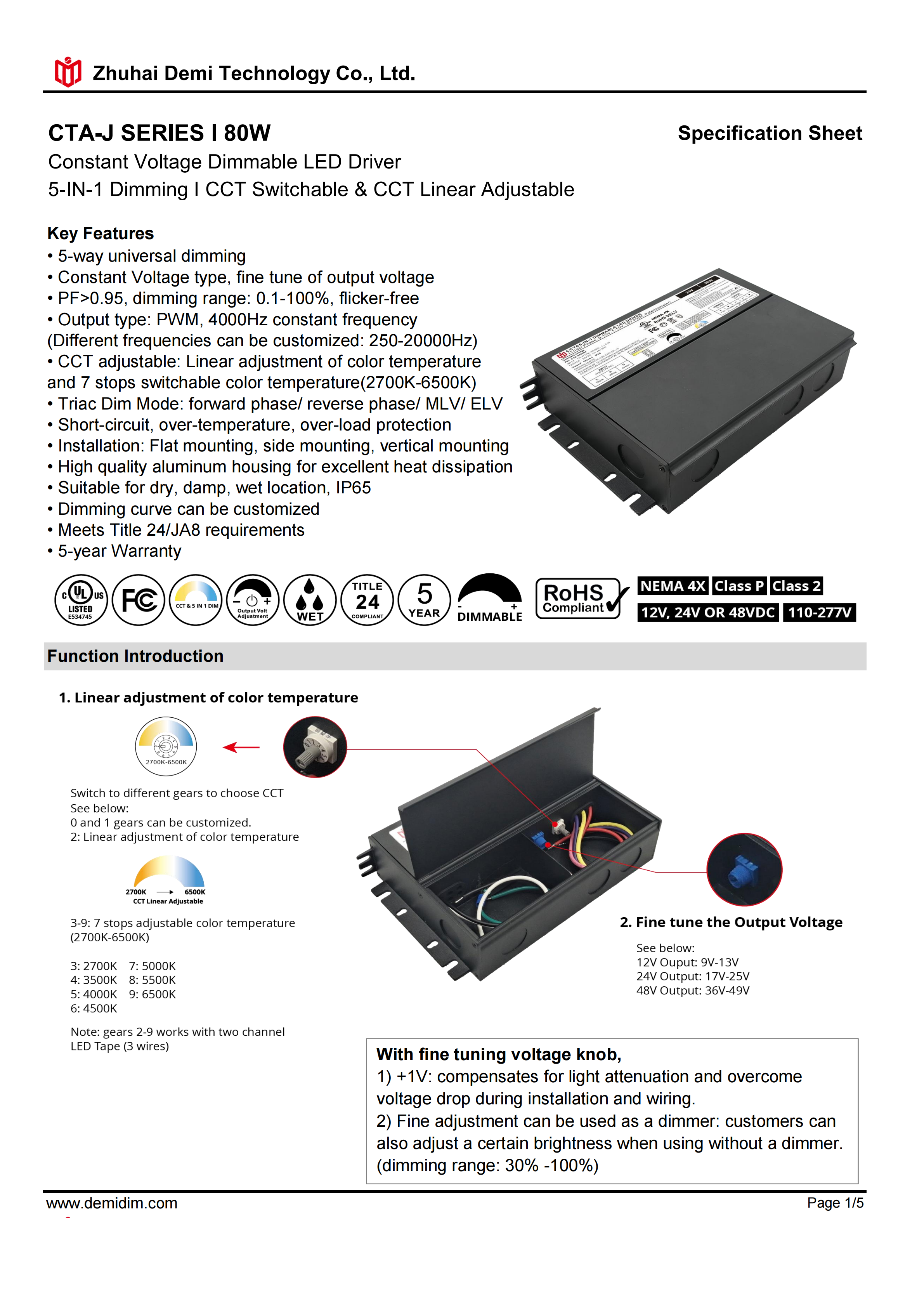 Item number: CTA-12080J,CTA-24080J,CTA-48080J Dim: Triac/0-10V/1-10V/10V PWM / Potentiometer Dimming method: PWM Input Voltage: 110-277V Output Voltage: 12V/24V/48V PF: ≥0.9 Efficiency: ≥88% Protection: short circuit,overload,over-temperature, Certificate: UL list Brand: DEMI