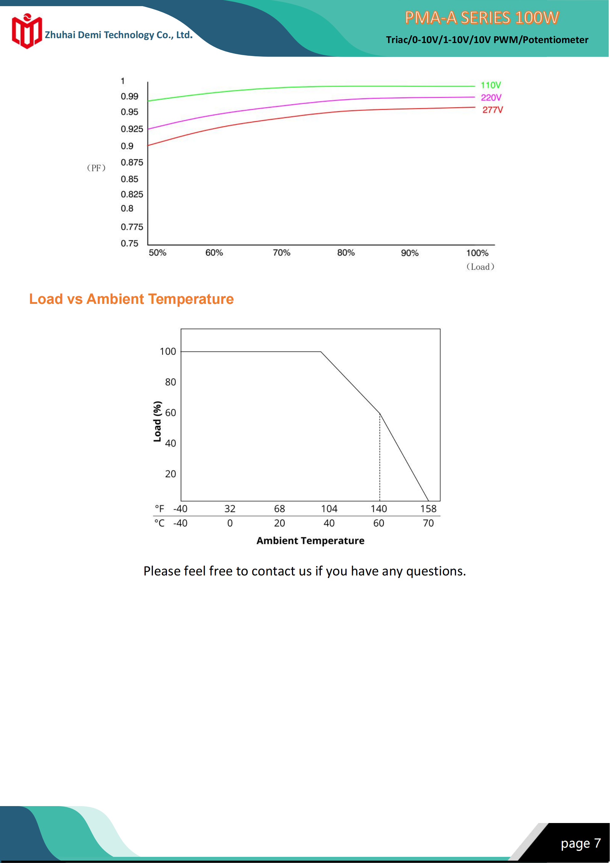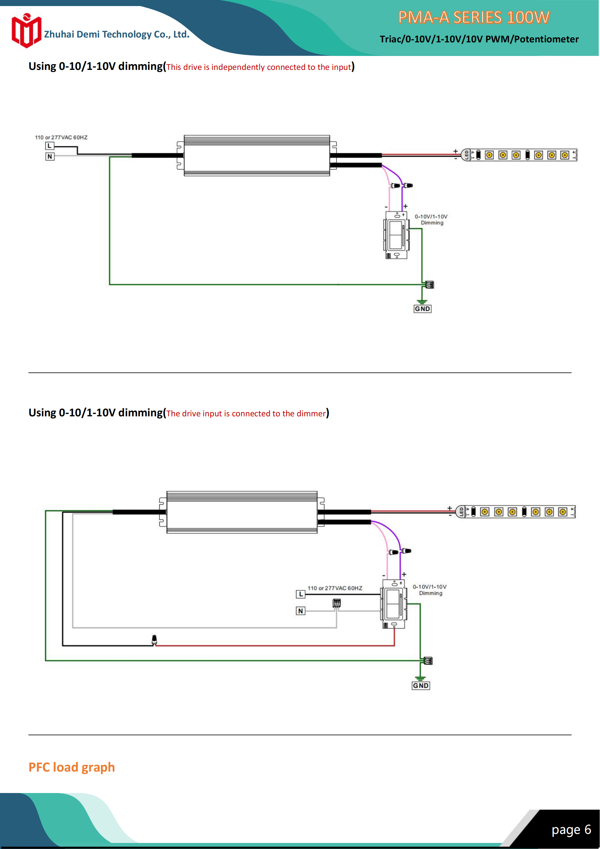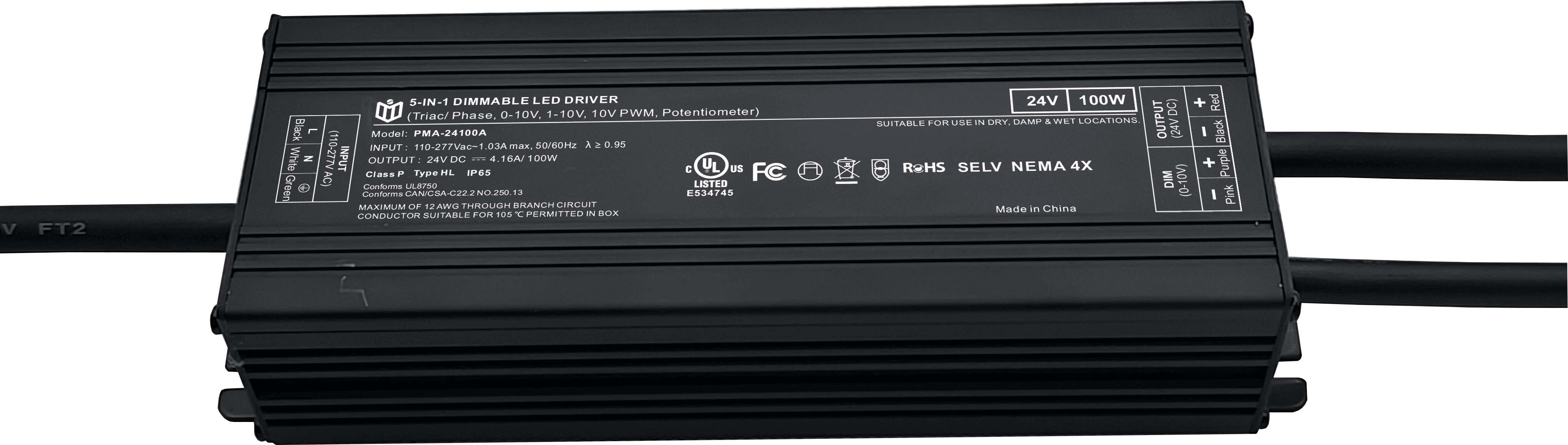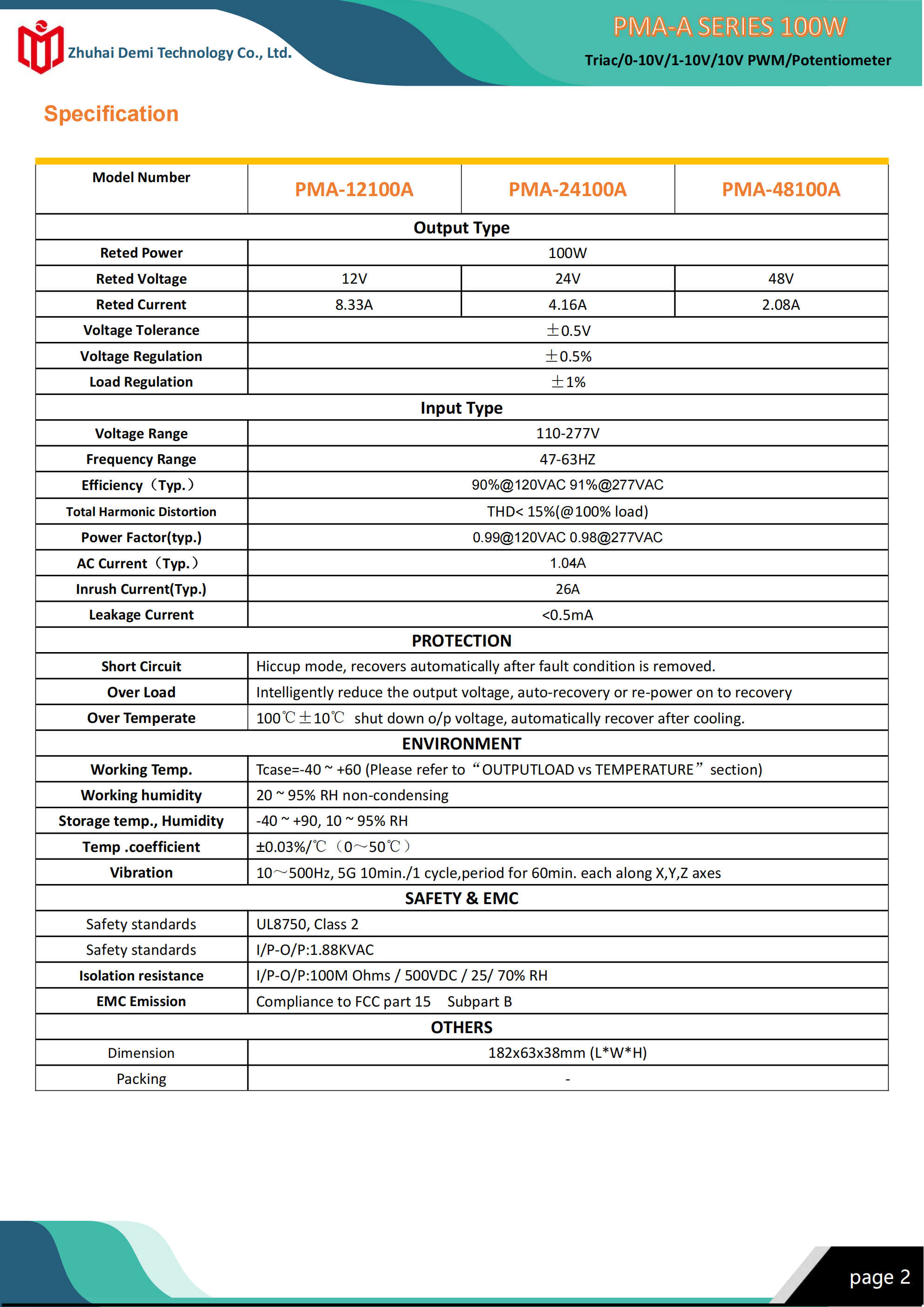 Item number: PMA-12100A PMA-24100A PMA-48100A Dim: Triac/0-10V/1-10V/10V PWM / Potentiometer Output Method: PWM Input Voltage: 110-277V Output Voltage: 12V/24V/48V PF: ≥0.9 Efficiency: ≥85% Warranty: 5 years. Protection: short circuit,overload,over-temperature, Certificate: UL list Brand: DEMI