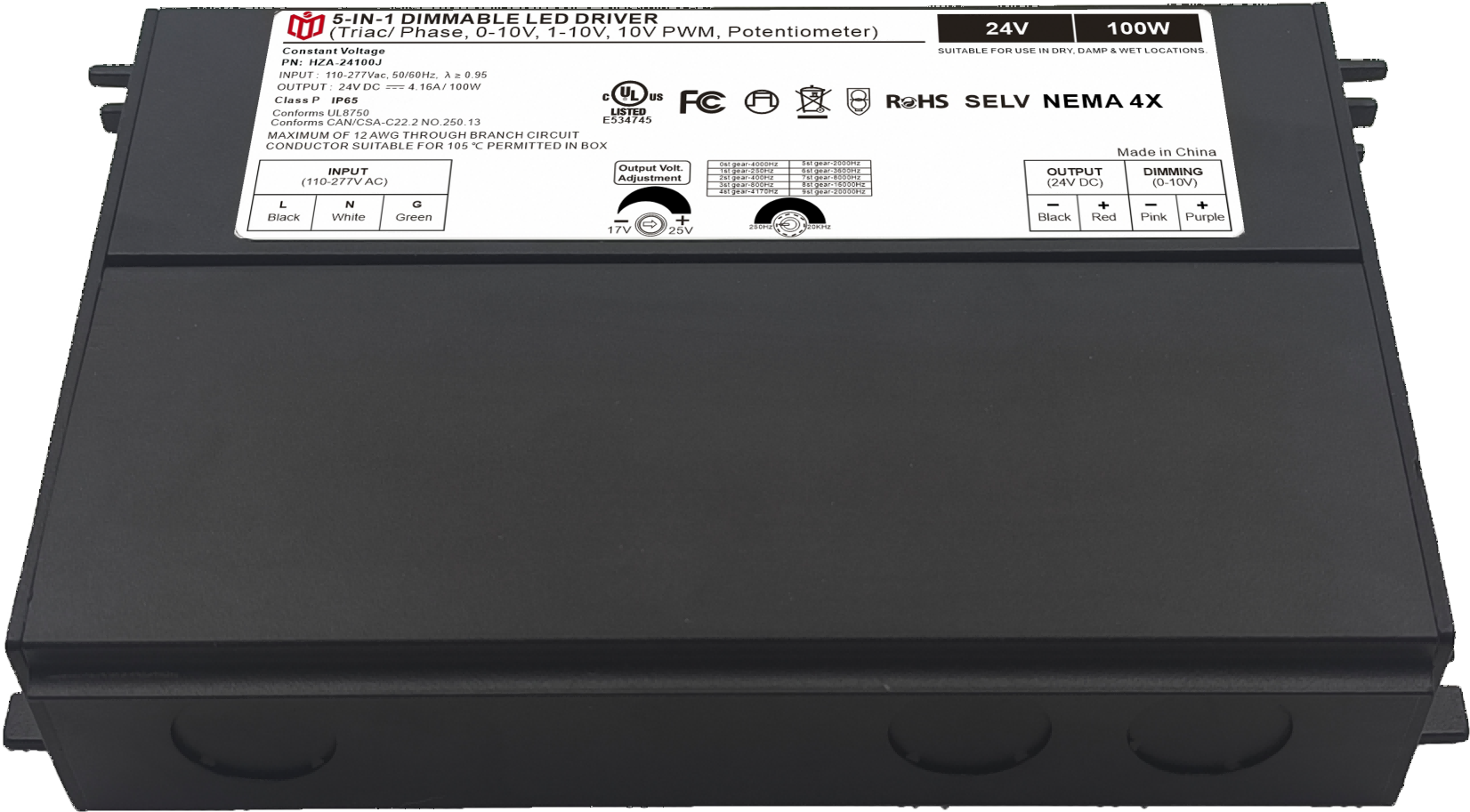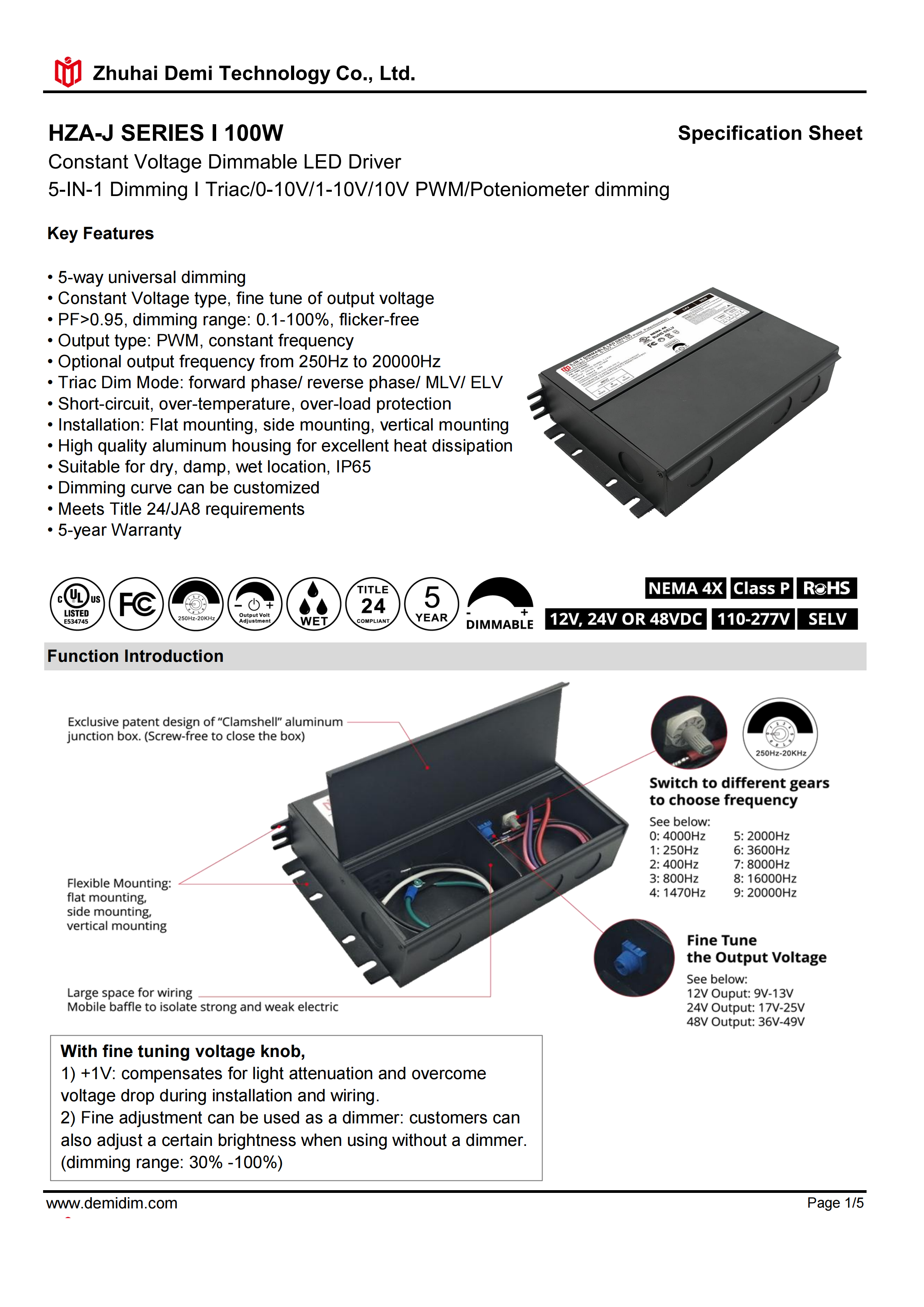 Item number: HZA-12100J,HZA-24100J,HZA-48100J Dim: Triac/0-10V/1-10V/10V PWM / Potentiometer Dimming method: PWM Input Voltage: 110-277V Output Voltage: 12V/24V/48V PF: ≥0.9 Efficiency: ≥90% Protection: short circuit,overload,over-temperature, Certificate: UL list Brand: DEMI