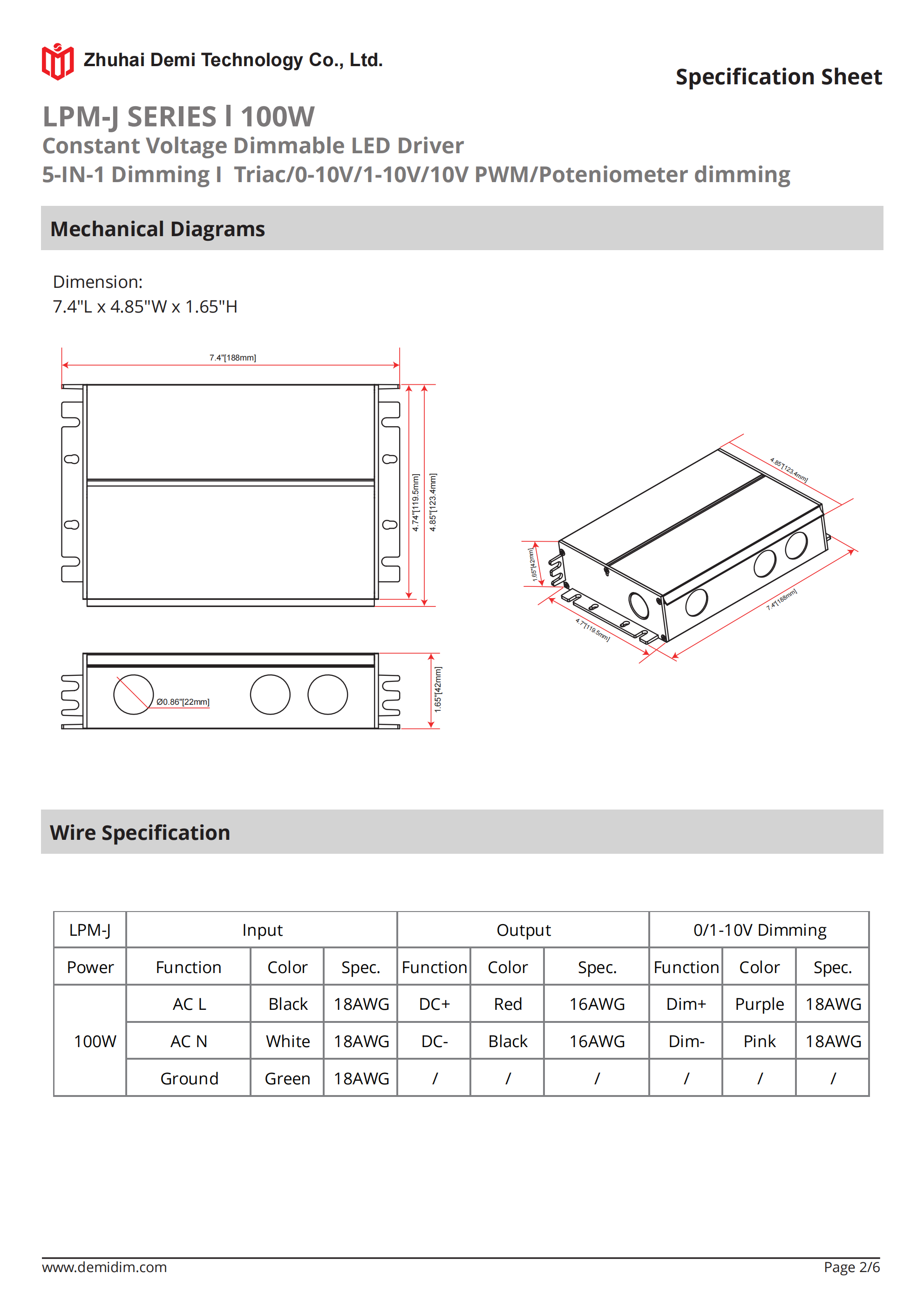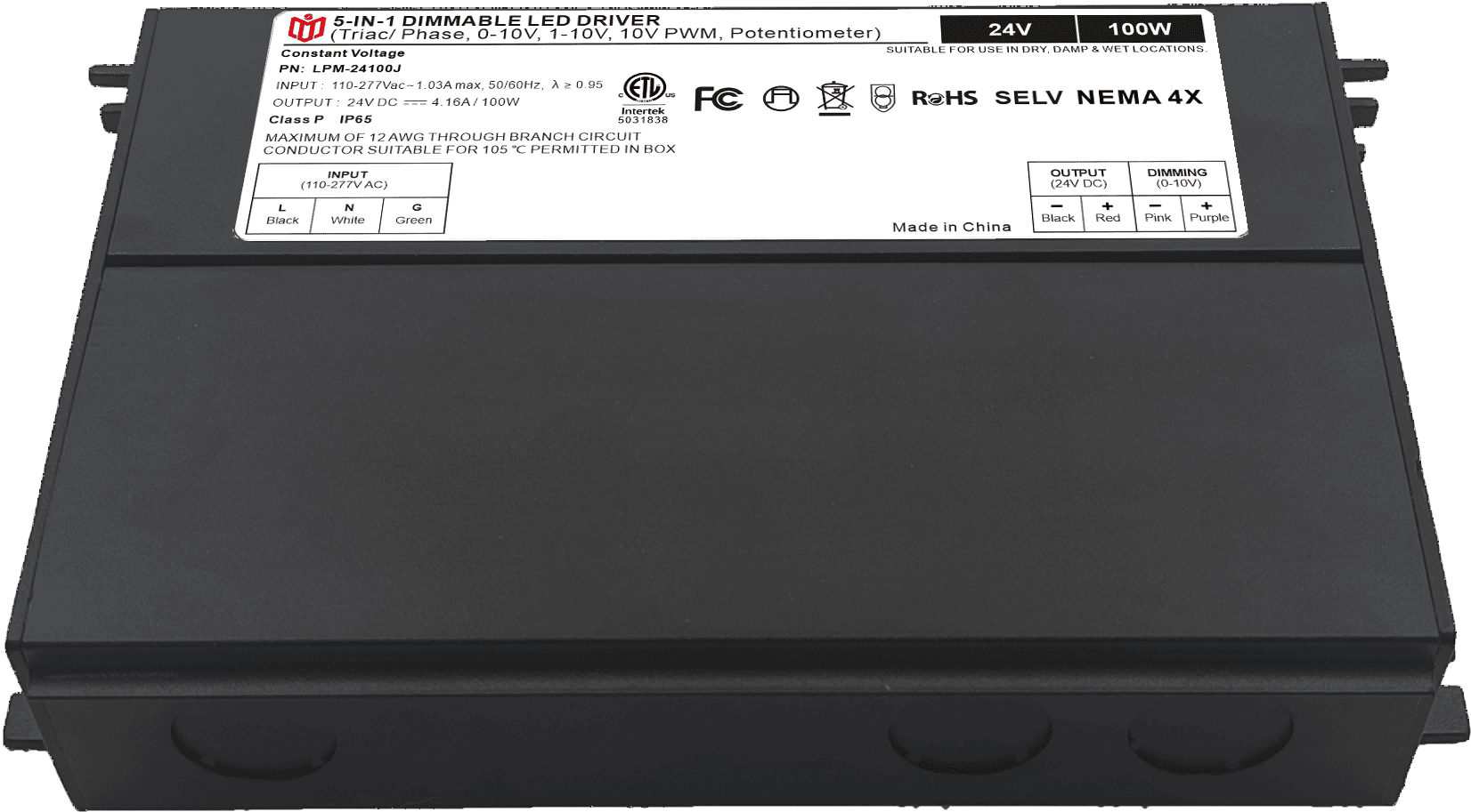 Item number: LPM-12100J.LPM-24100J Dim: Triac/0-10V/1-10V/10V PWM / Potentiometer Dimming method: PWM Input Voltage: 110-277V Output Voltage: 12V/24V PF: ≥0.9 Efficiency: ≥89% Warranty: 5 years. Protection: short circuit,overload,over-temperature, Certificate: ETL list Brand: DEMI