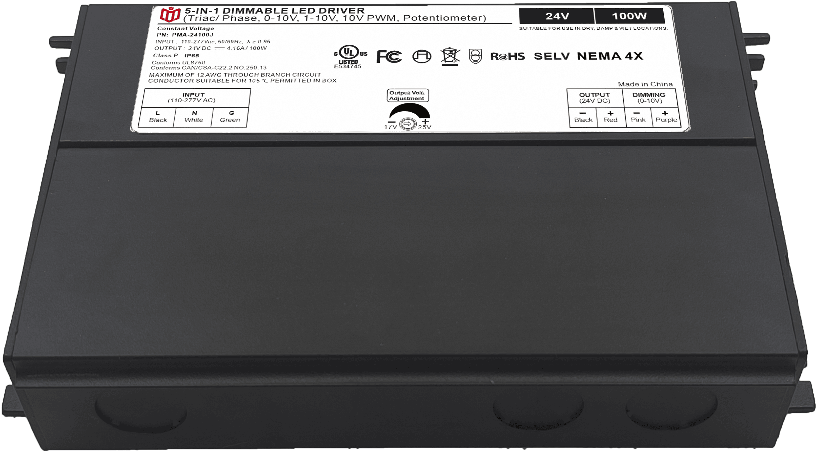 Item number: PMA-12100J,PMA-24100J,PMA-48100J, Type: Constant Voltage Dim: Triac/0-10V/1-10V/10V PWM / Potentiometer Output Method: PWM Input Voltage: 110-277V Output Voltage: 12V/24V/48V PF: ≥0.9 Efficiency: ≥90% Warranty: 5 years. Protection: short circuit,overload,over-temperature, Certificate: UL list Brand: DEMI