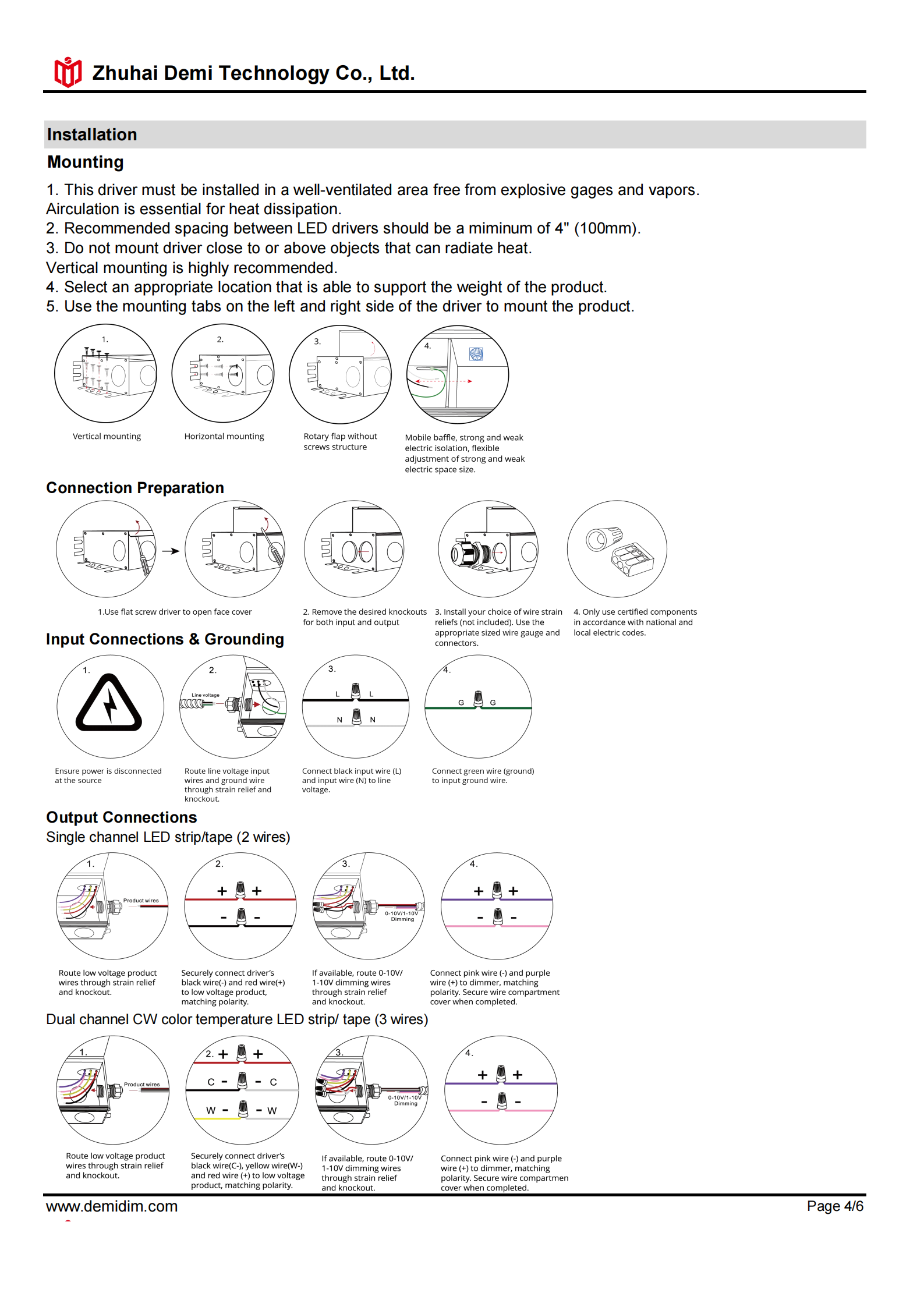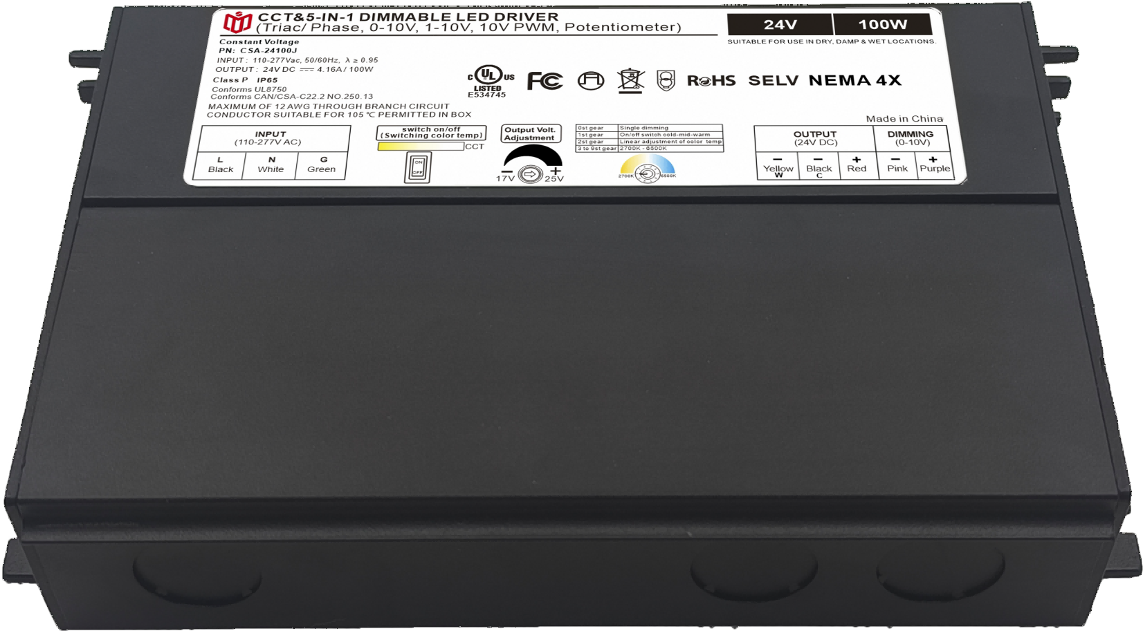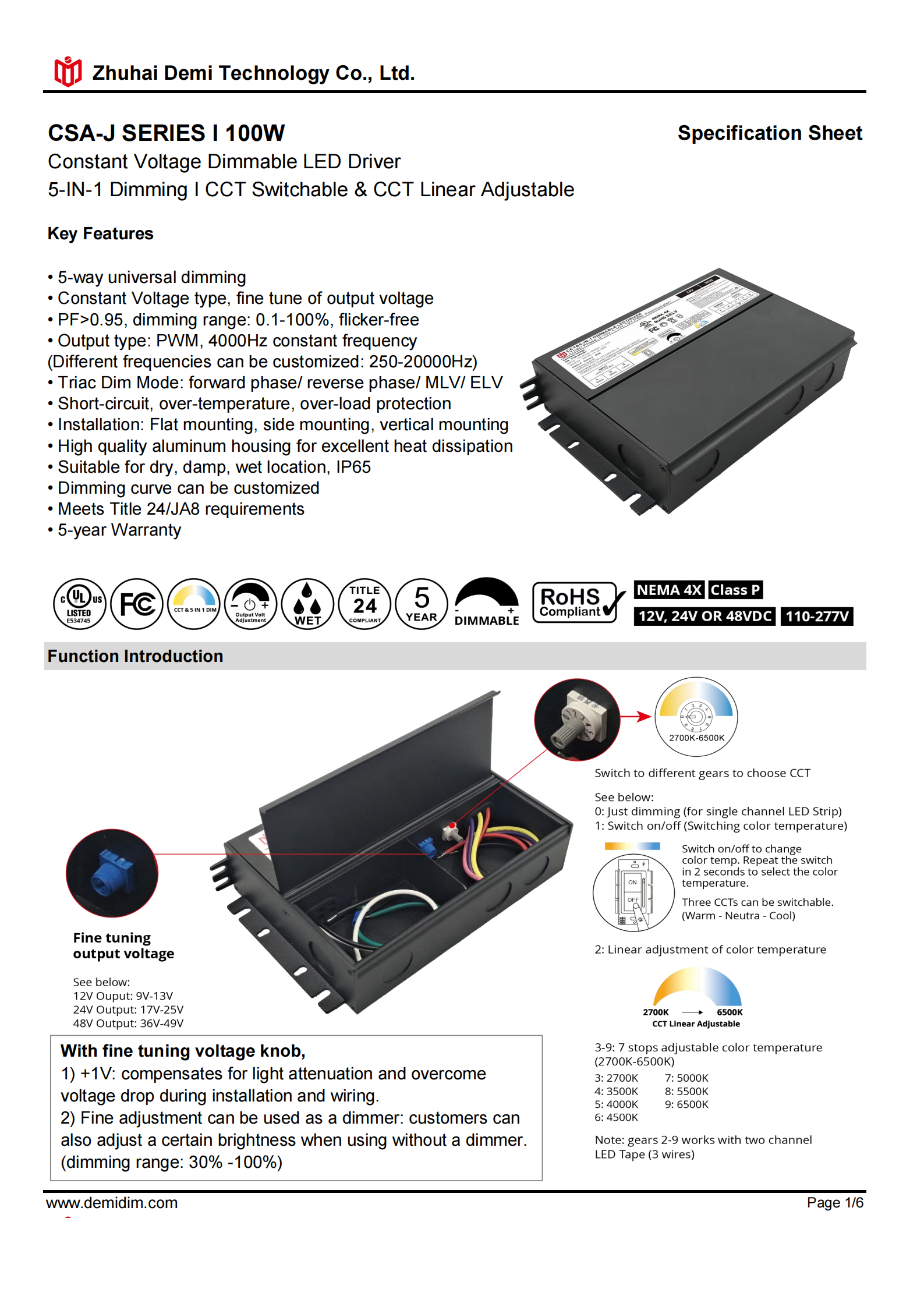 Item number: CSA-12100J,CSA-24100J,CSA-48100J Dim: Triac/0-10V/1-10V/10V PWM / Potentiometer Output Method: PWM Input Voltage: 110-277V Output Voltage: 12V/24V/48V PF: ≥0.9 Efficiency: ≥90% Warranty: 5 years. Protection: short circuit,overload,over-temperature, Certificate: UL list Brand: DEMI