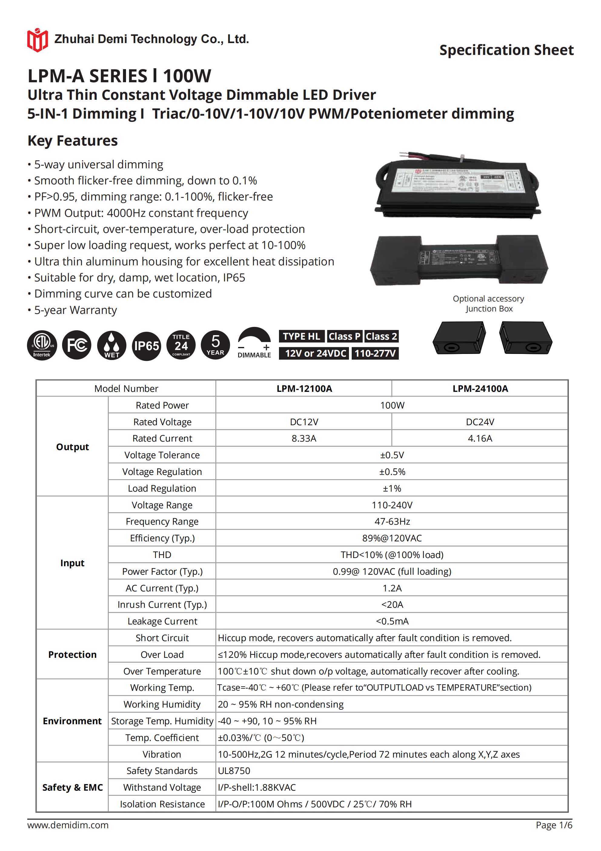 Item number: LPM-12100A,LPM-24100A Dim: Triac/0-10V/1-10V/10V PWM / Potentiometer Dimming method: PWM Input Voltage: 110-277V Output Voltage: 12V/24V PF: ≥0.9 Efficiency: ≥89% Warranty: 5 years. Protection: short circuit,overload,over-temperature, Certificate: ETL list Brand: DEMI