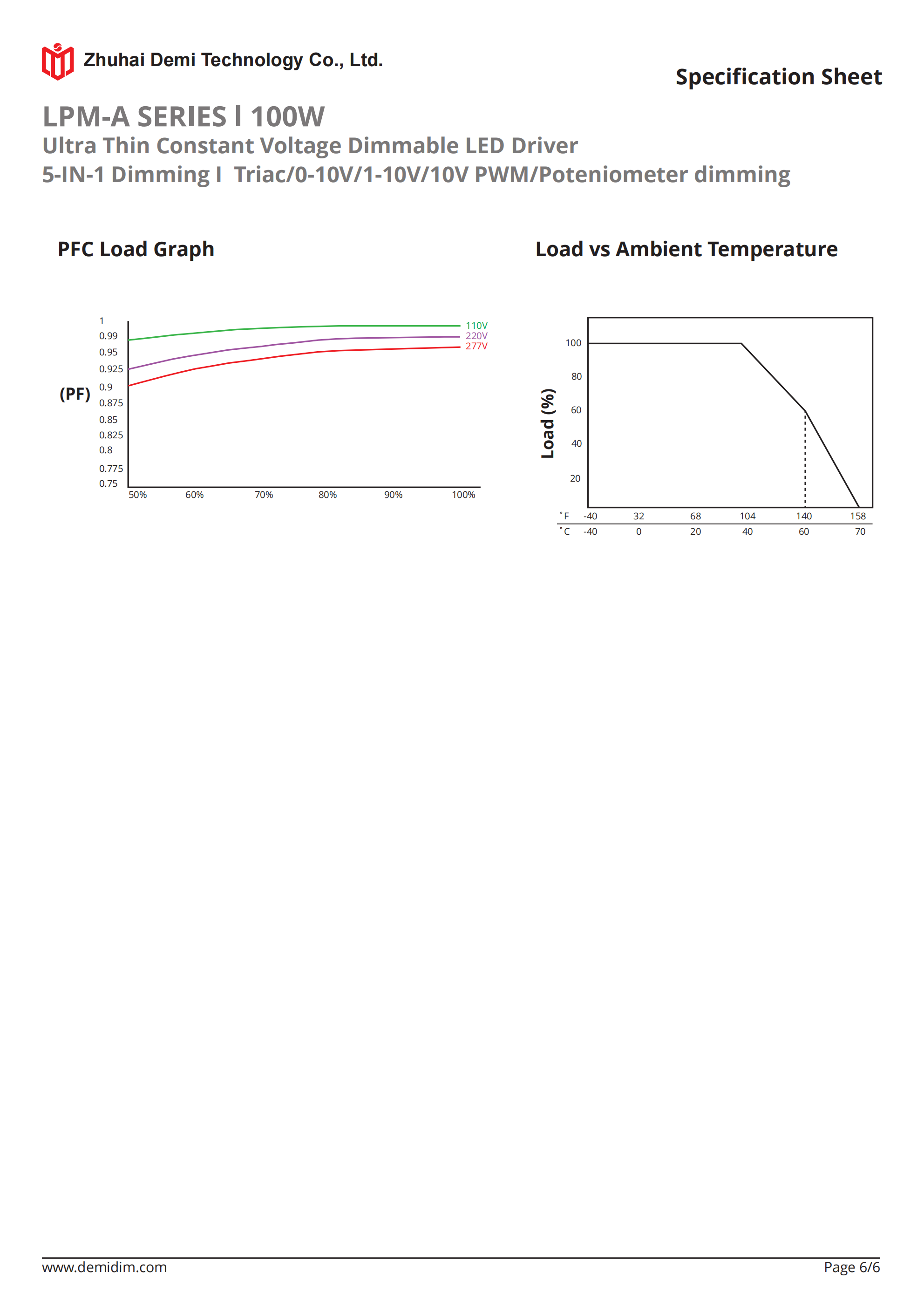 Item number: LPM-12080A,LPM-24080A Dim: Triac/0-10V/1-10V/10V PWM / Potentiometer Dimming method: PWM Input Voltage: 110-277V Output Voltage: 12V/24V PF: ≥0.9 Efficiency: ≥87% Warranty: 5 years. Protection: short circuit,overload,over-temperature, Certificate: ETL list Brand: DEMI