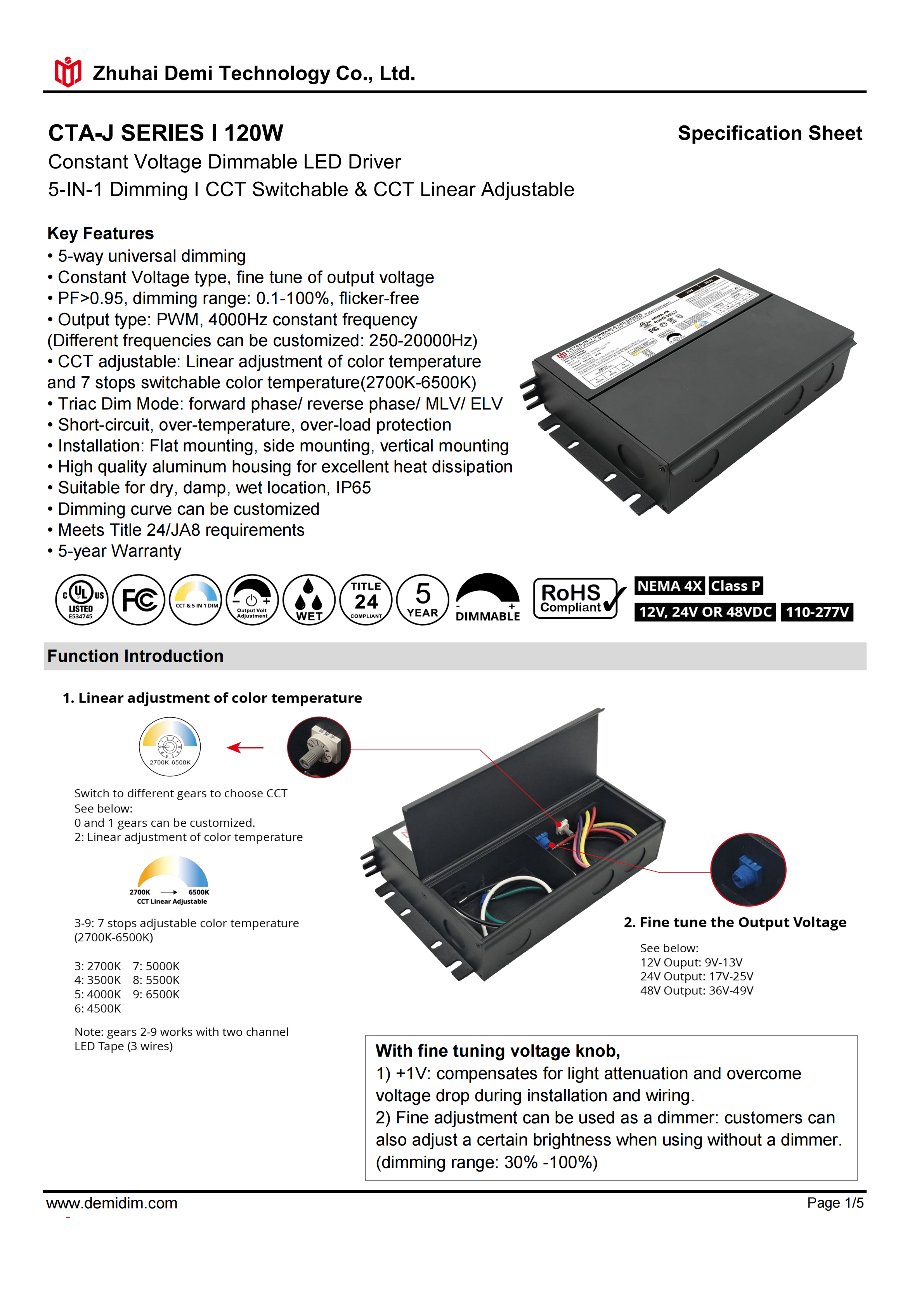 Item number: CTA-12120J,CTA-24120J,CTA-48120J Dim: Triac/0-10V/1-10V/10V PWM / Potentiometer Dimming method: PWM Input Voltage: 110-277V Output Voltage: 12V/24V/48V PF: ≥0.9 Efficiency: ≥90% Protection: short circuit,overload,over-temperature, Certificate: UL list Brand: DEMI
