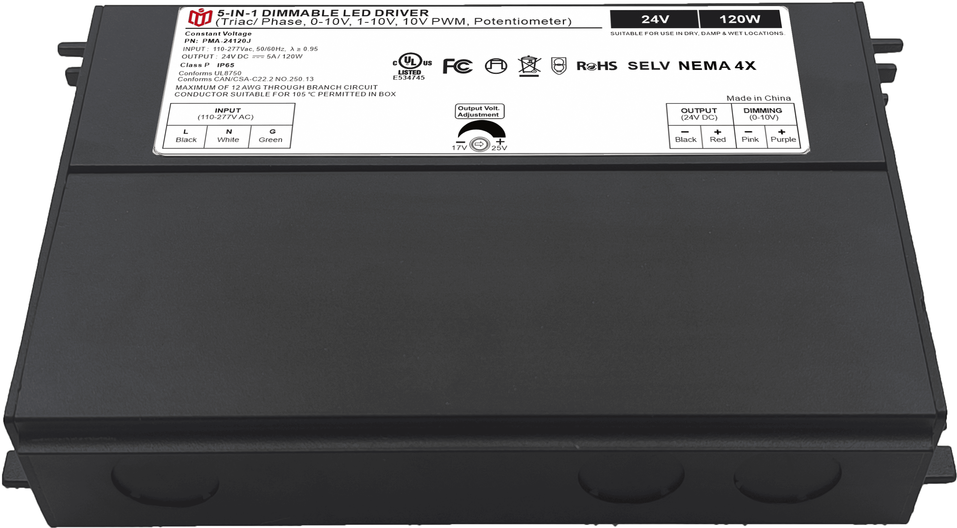 Item number: PMA-12120J,PMA-24120J,PMA-48120J, Type: Constant Voltage Dim: Triac/0-10V/1-10V/10V PWM / Potentiometer Output Method: PWM Input Voltage: 110-277V Output Voltage: 12V/24V/48V PF: ≥0.9 Efficiency: ≥90% Warranty: 5 years. Protection: short circuit,overload,over-temperature, Certificate: UL list Brand: DEMI