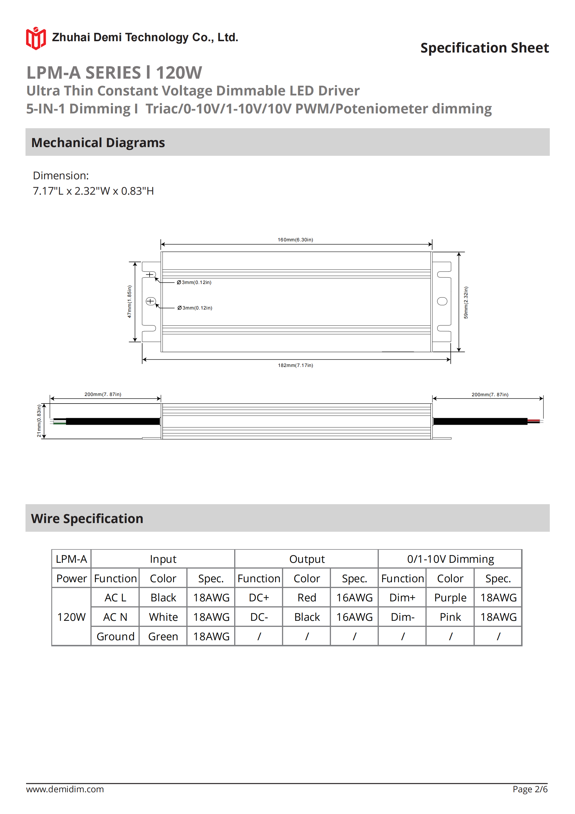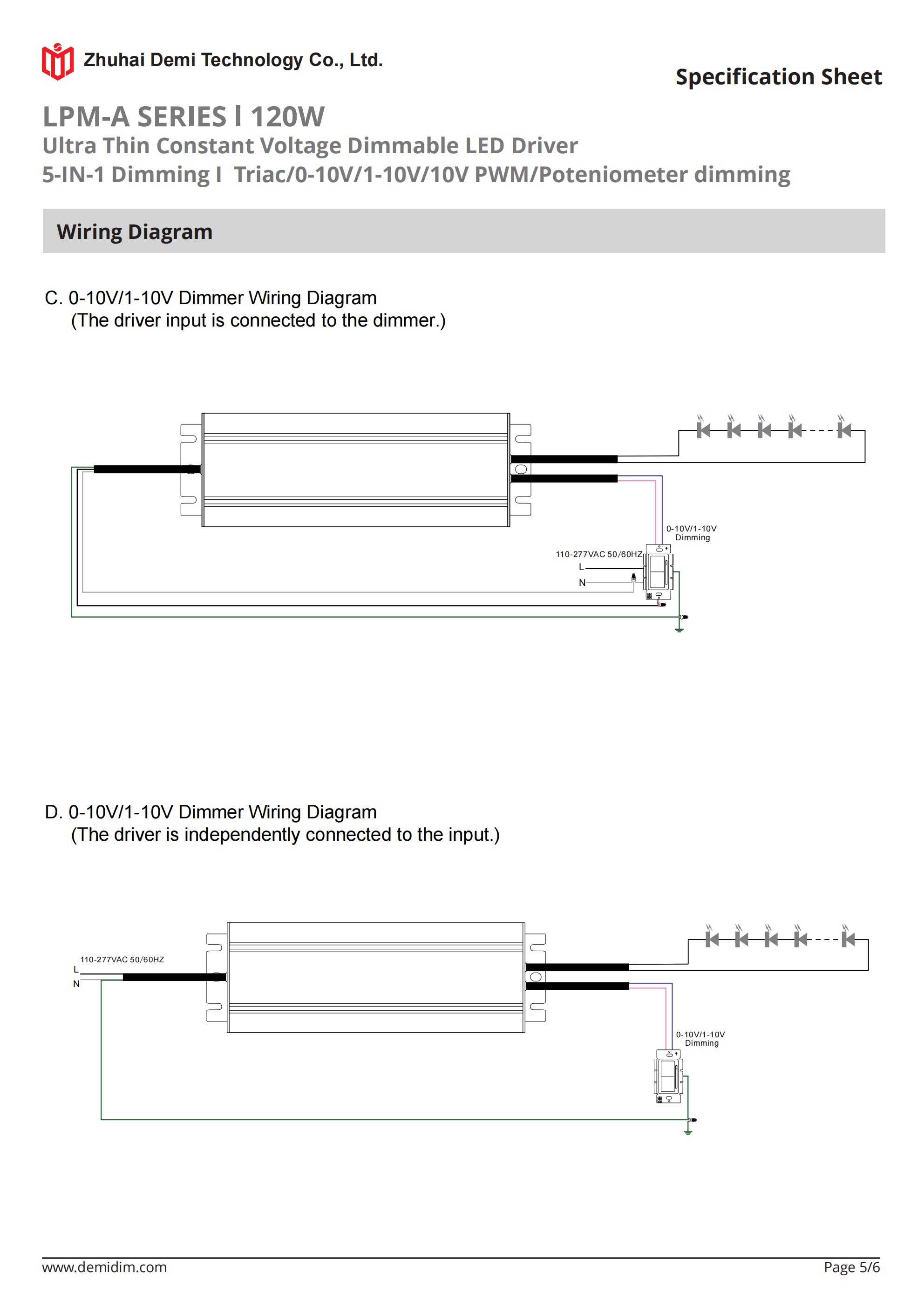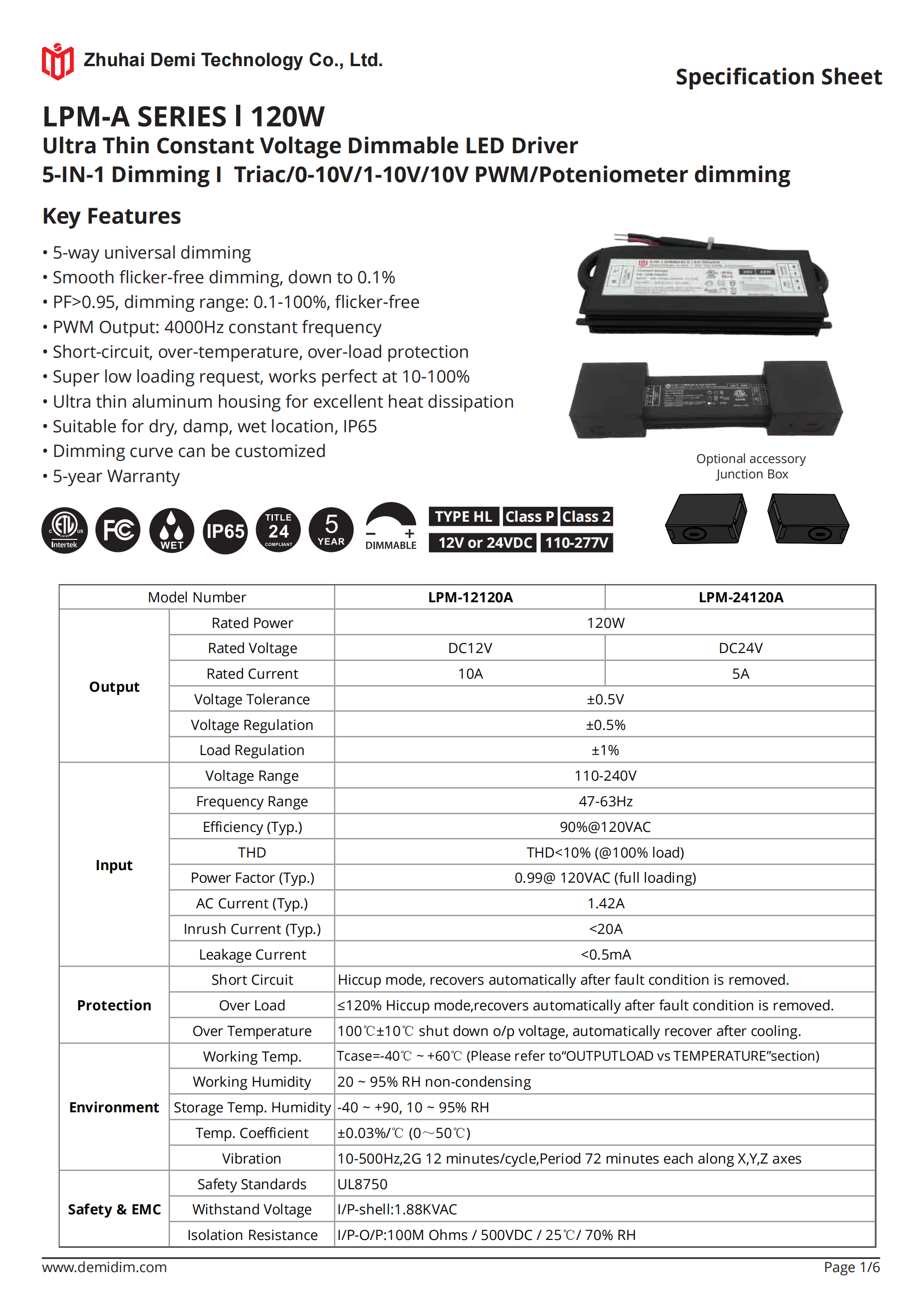 Item number: LPM-12120A,LPM-24120A Dim: Triac/0-10V/1-10V/10V PWM / Potentiometer Dimming method: PWM Input Voltage: 110-277V Output Voltage: 12V/24V PF: ≥0.9 Efficiency: ≥90% Warranty: 5 years. Protection: short circuit,overload,over-temperature, Certificate: ETL list Brand: DEMI