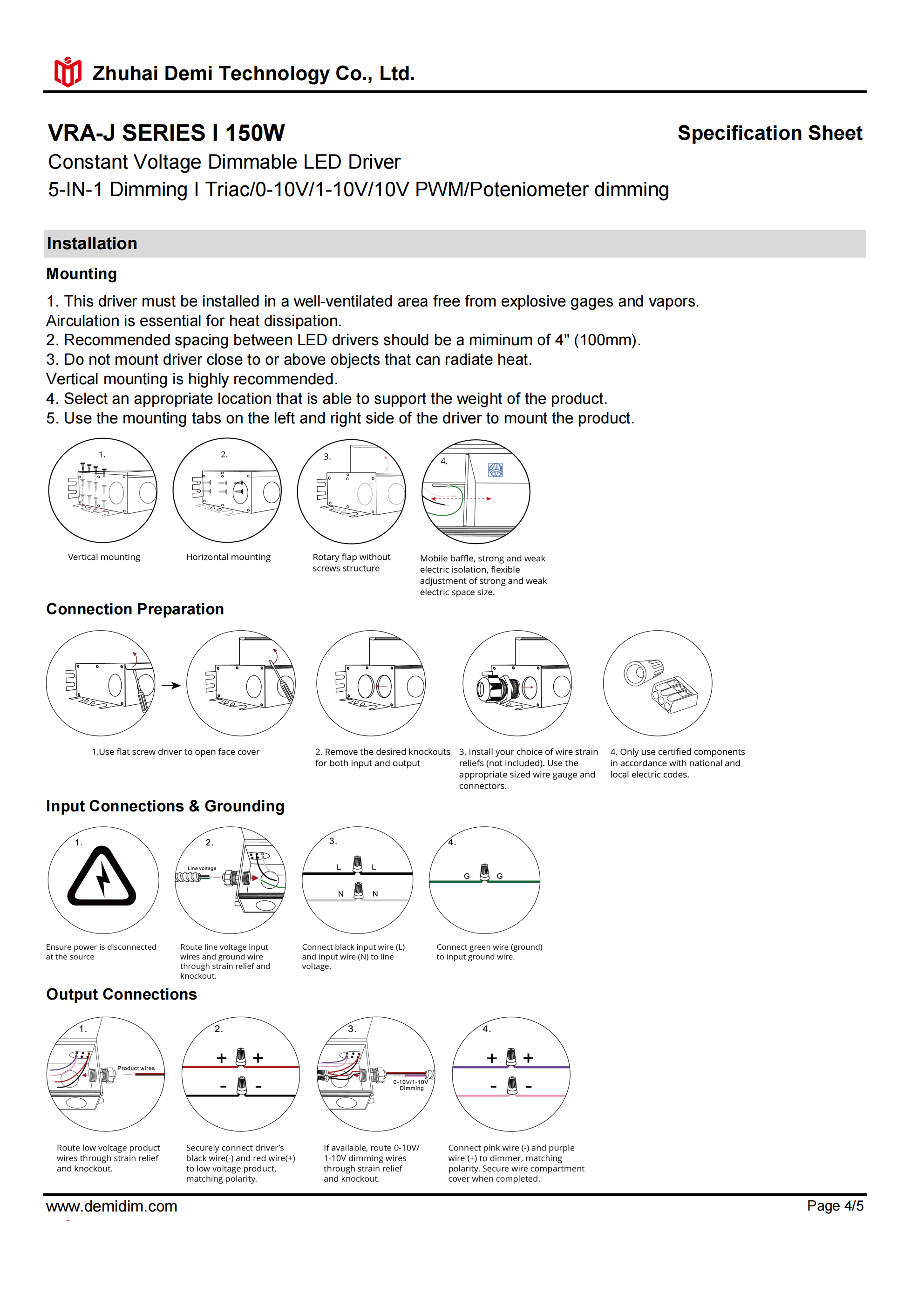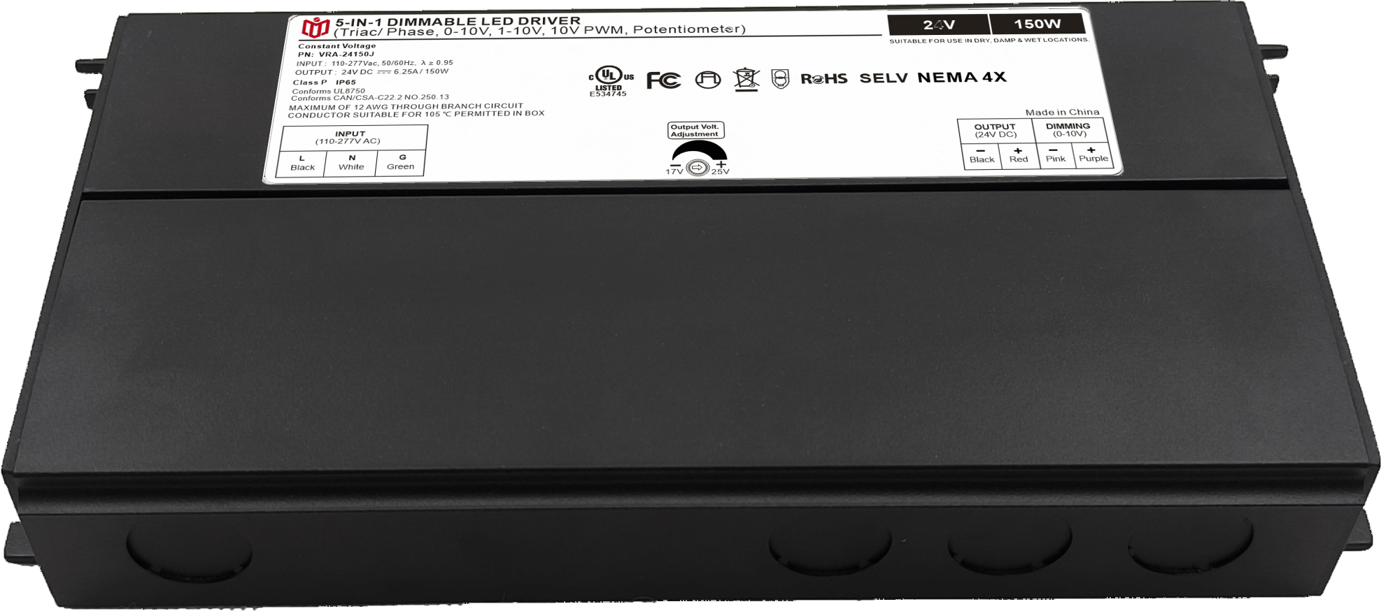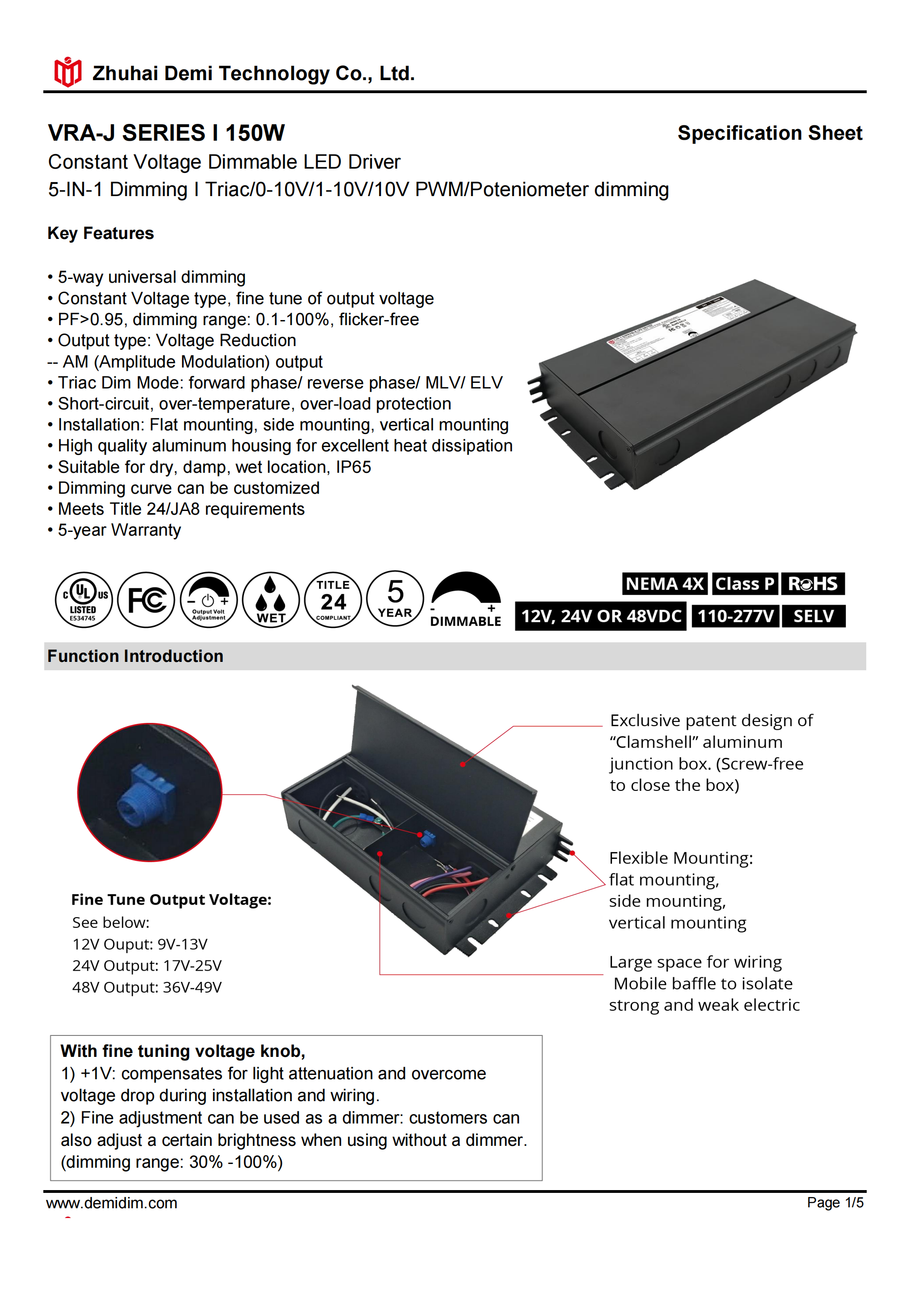 Item number: VRA-12150J,VRA-24150J,VRA-48150J, Type : Constant voltage Dimming Mode: Triac/0-10V/1-10V/10V PWM / Potentiometer Output Method: Amplitude Modulation Input Voltage: 110-277V Output Voltage: 12V/24V/48V PF: ≥0.9 Efficiency: ≥90% Warranty: 5 years. Protection: short circuit,overload,over-temperature, Certificate: UL list Brand: DEMI