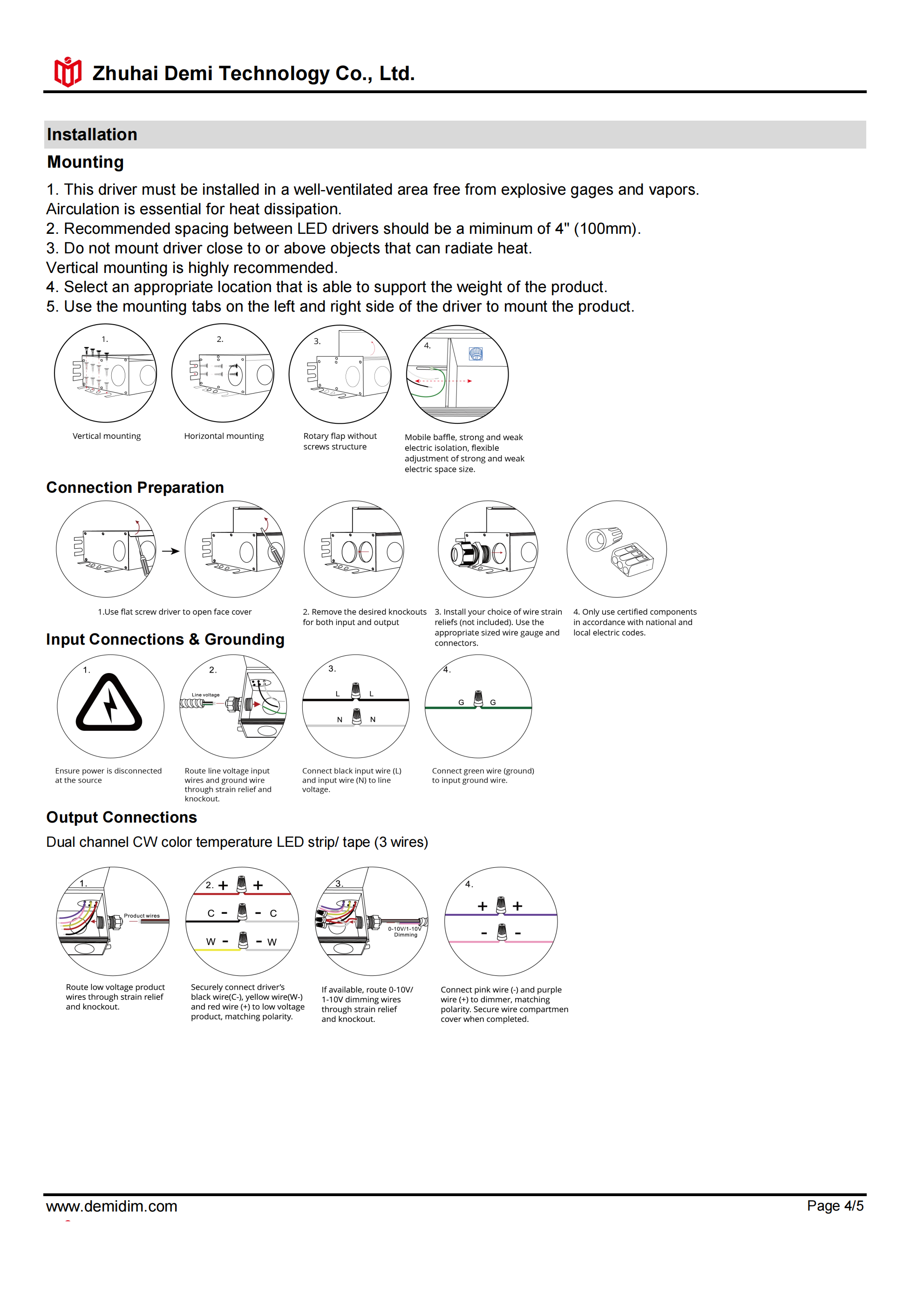 Item number: SHA-H12120J,SHA-H24120J,SHA-H48120J Dim: Triac/0-10V/1-10V/10V PWM / Potentiometer Output Method: PWM Input Voltage: 110-277V Output Voltage: 12V/24V/48V PF: ≥0.9 Efficiency: ≥90% Warranty: 5 years. Protection: short circuit,overload,over-temperature, Certificate: UL list Brand: DEMI