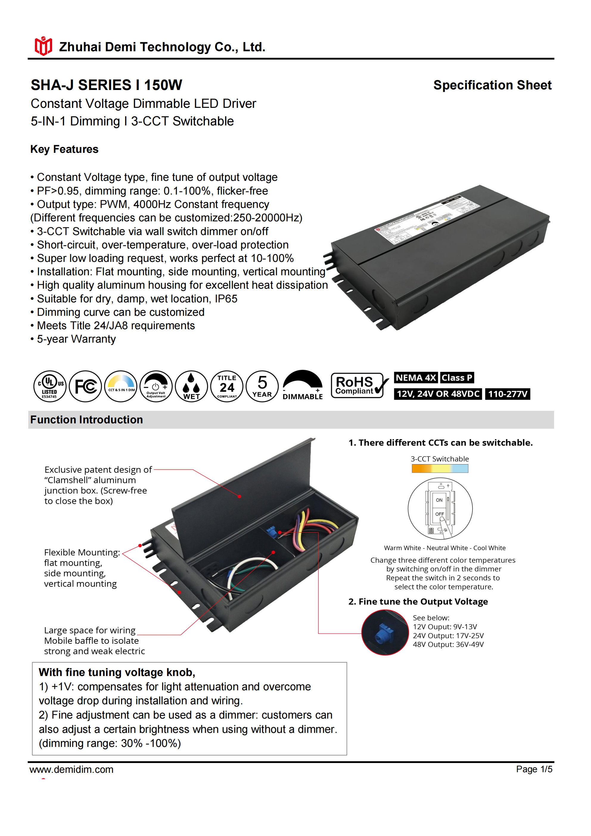 Item number: SHA-12150J,SHA-24150J,SHA-48150J Dim: Triac/0-10V/1-10V/10V PWM / Potentiometer Output Method: PWM Input Voltage: 110-277V Output Voltage: 12V/24V/48V PF: ≥0.9 Efficiency: ≥90% Warranty: 5 years. Protection: short circuit,overload,over-temperature, Certificate: UL list Brand: DEMI