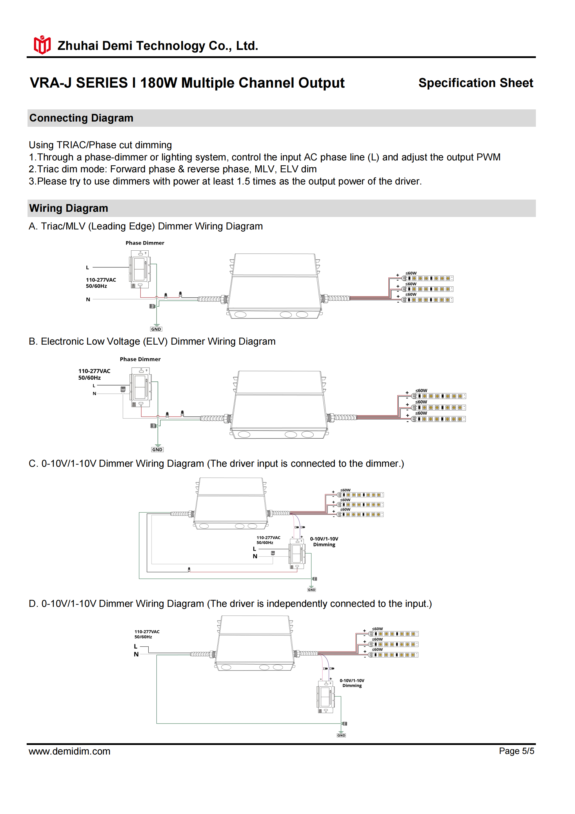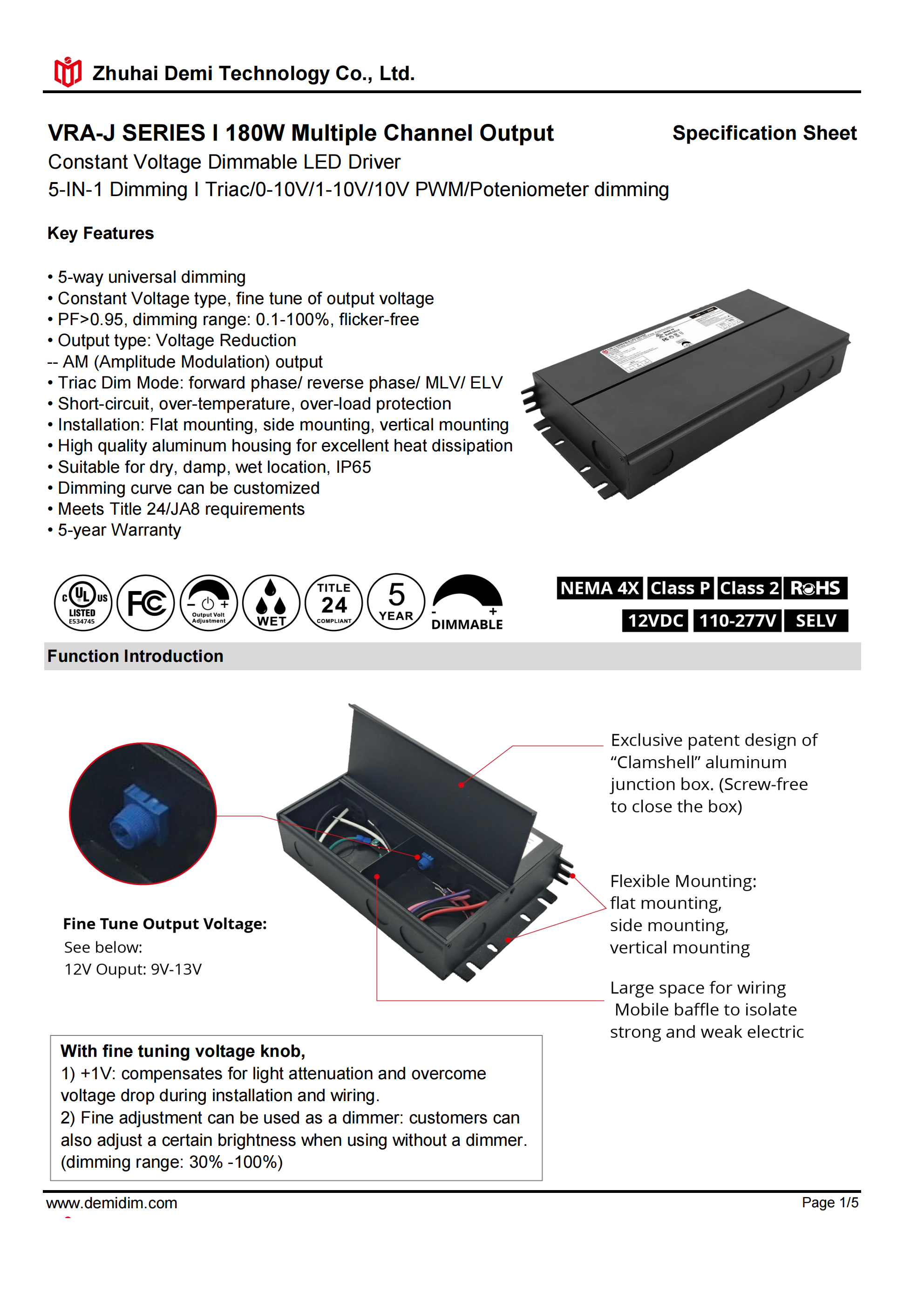 Item number: VRA-12150J,VRA-24150J,VRA-48150J, Type : Constant voltage Dimming Mode: Triac/0-10V/1-10V/10V PWM / Potentiometer Output Method: Amplitude Modulation Input Voltage: 110-277V Output Voltage: 12V/24V/48V PF: ≥0.9 Efficiency: ≥90% Warranty: 5 years. Protection: short circuit,overload,over-temperature, Certificate: UL list Brand: DEMI