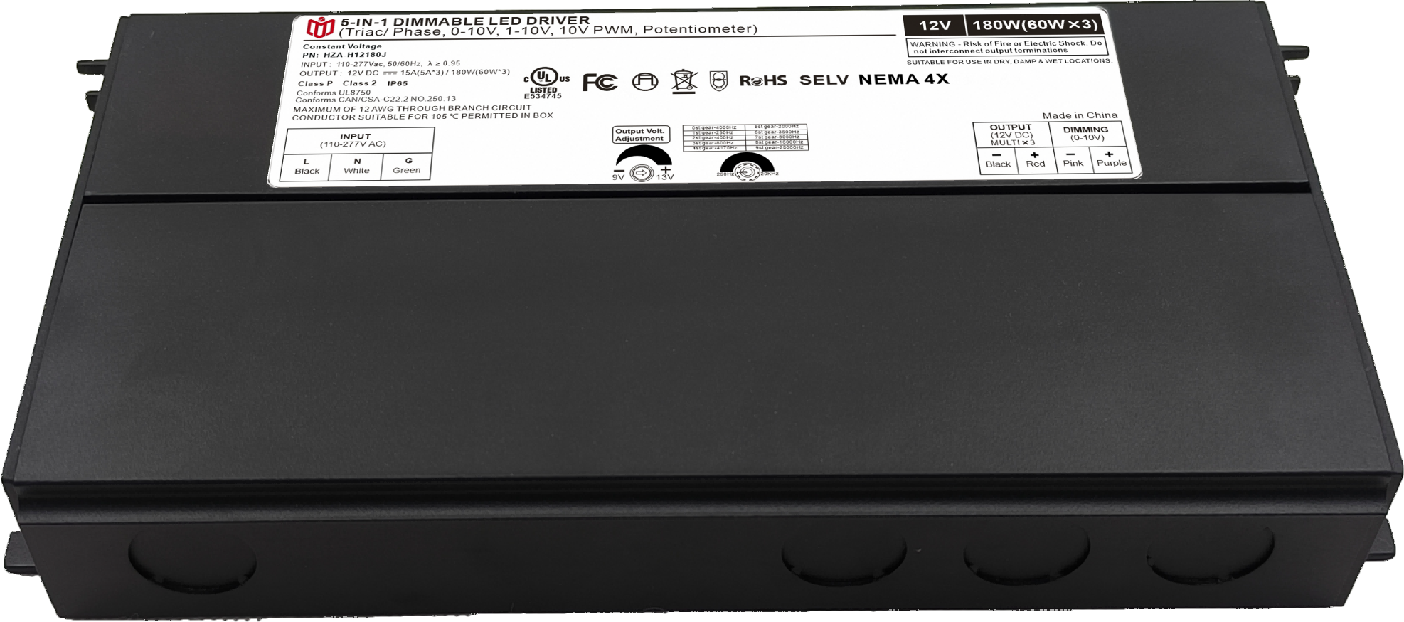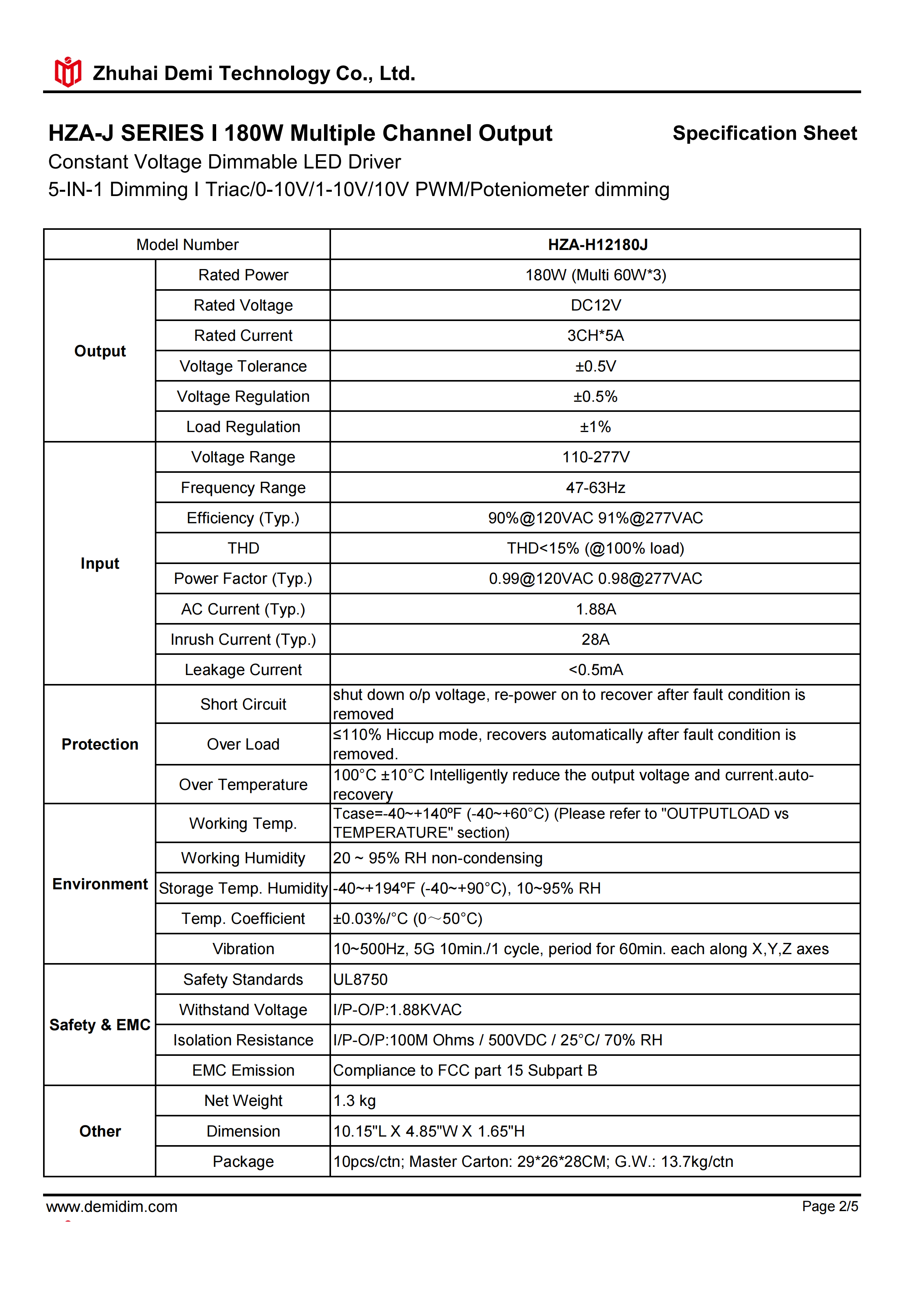 Item number: HZA-H12180J Dim: Triac/0-10V/1-10V/10V PWM / Potentiometer Dimming method: PWM Input Voltage: 110-277V Output Voltage: 12V PF: ≥0.9 Efficiency: ≥90% Protection: short circuit,overload,over-temperature, Certificate: UL list Brand: DEMI