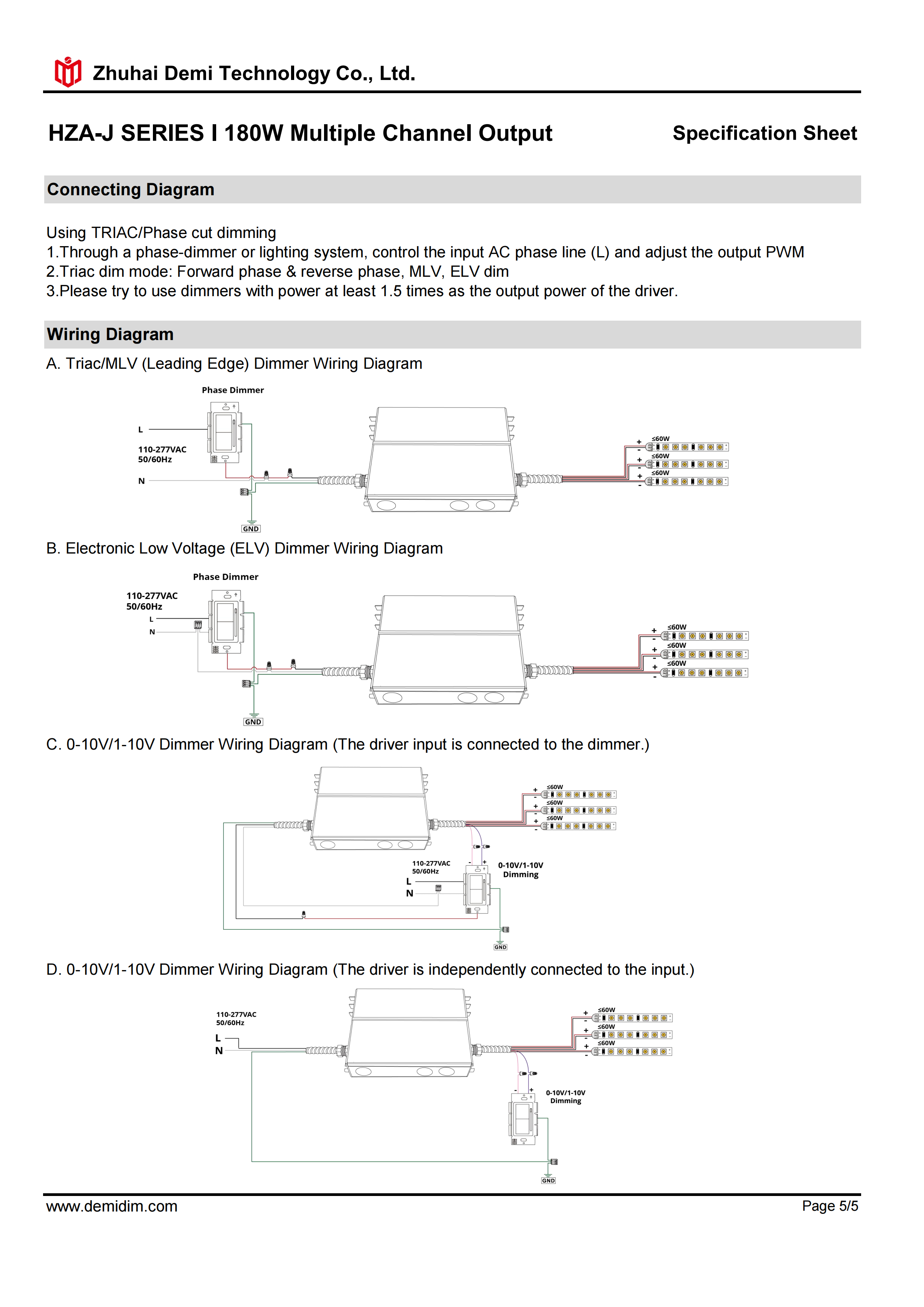 Item number: HZA-H12120J,HZA-H24120J Type: Constant Voltage Dim: Triac/0-10V/1-10V/10V PWM / Potentiometer Dimming method: PWM Input Voltage: 110-277V Output Voltage: 12V/24V PF: ≥0.9 Efficiency: ≥90% Protection: short circuit,overload,over-temperature, Certificate: UL list Brand: DEMI