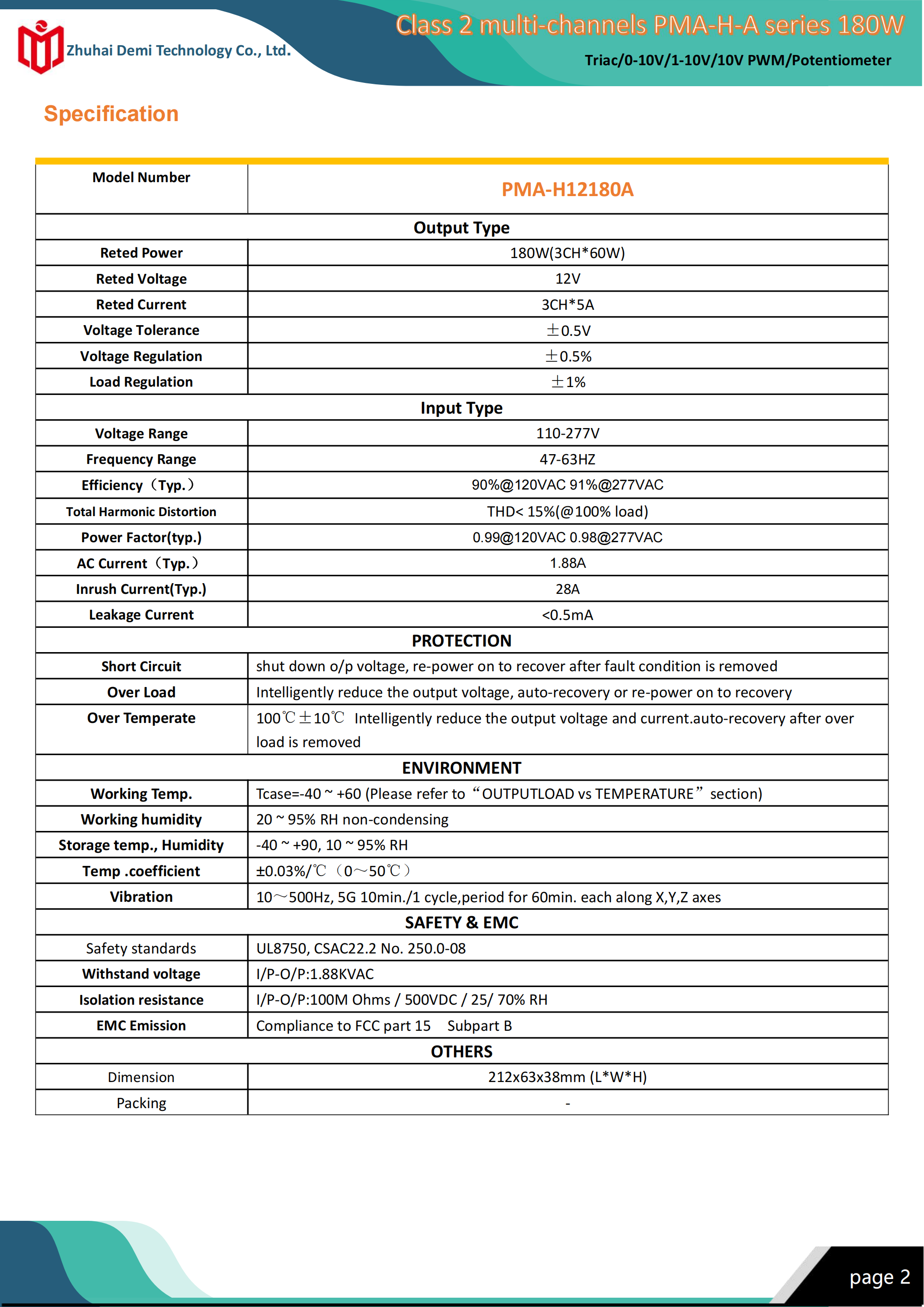 Item number:PMA-H12180A Dim: Triac/0-10V/1-10V/10V PWM / Potentiometer Output Method: PWM Input Voltage: 110-277V Output Voltage: 12V PF: ≥0.9 Efficiency: ≥85% Warranty: 5 years. Protection: short circuit,overload,over-temperature, Certificate: UL list Brand: DEMI