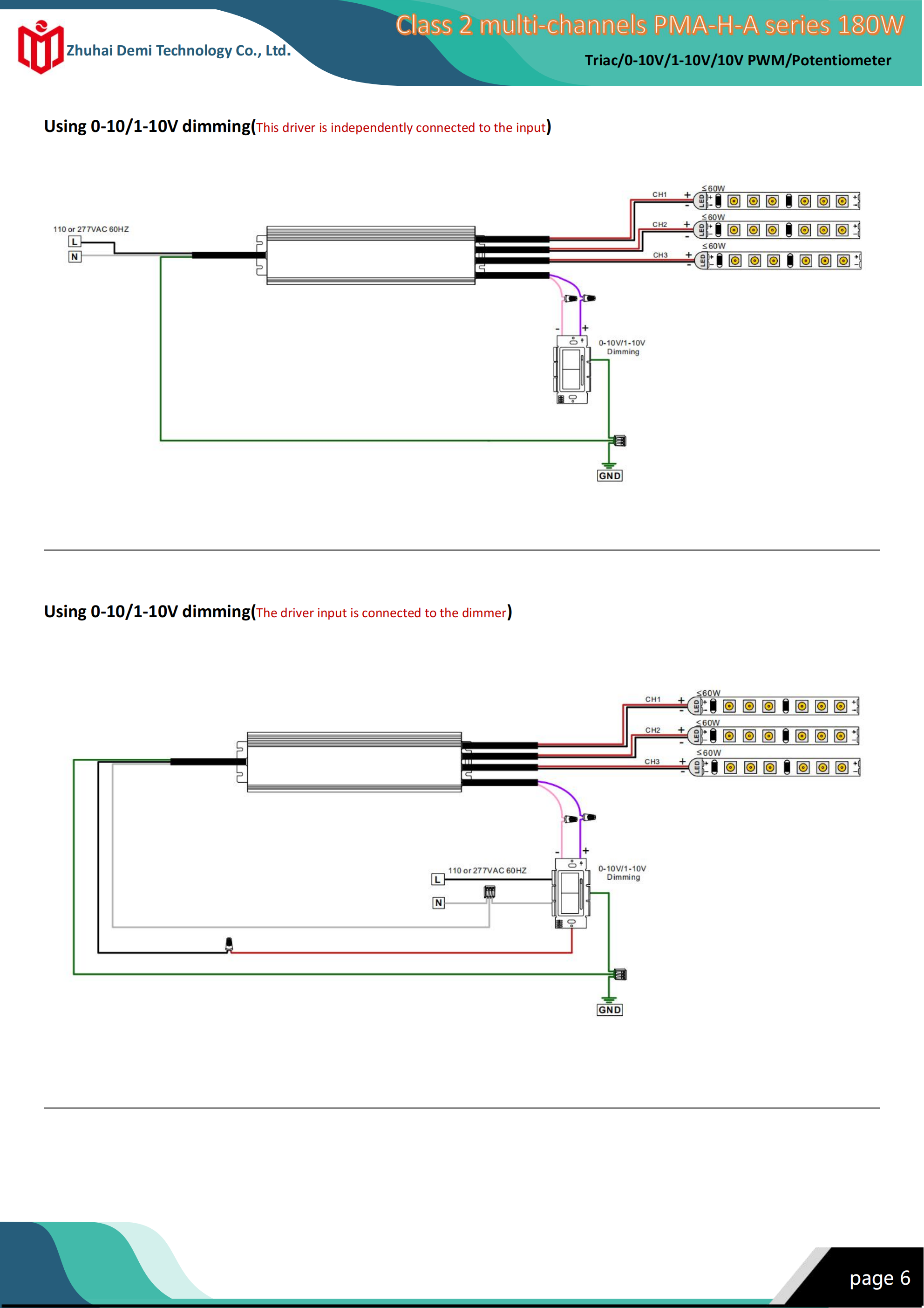 Item number: PMA-12150A PMA-24150A PMA-48150A Dim: Triac/0-10V/1-10V/10V PWM / Potentiometer Output Method: PWM Input Voltage: 110-277V Output Voltage: 12V/24V/48V PF: ≥0.9 Efficiency: ≥85% Warranty: 5 years. Protection: short circuit,overload,over-temperature, Certificate: UL list Brand: DEMI