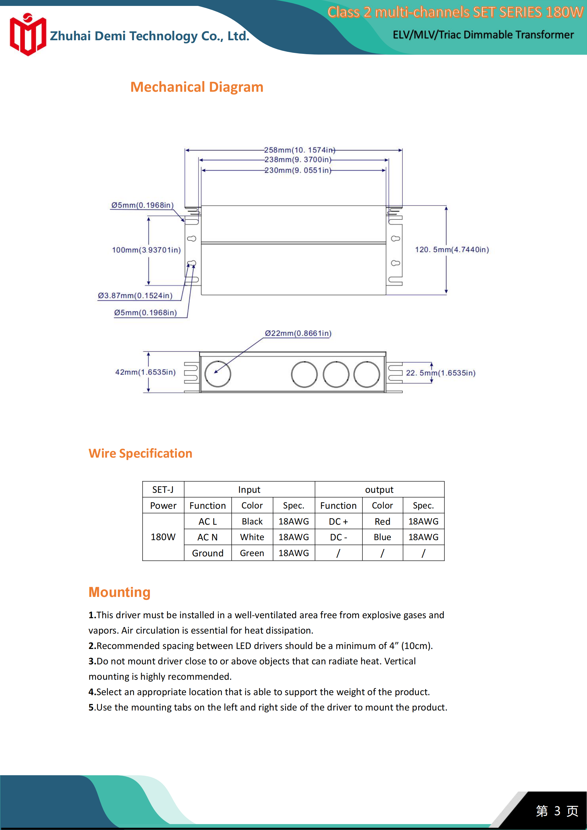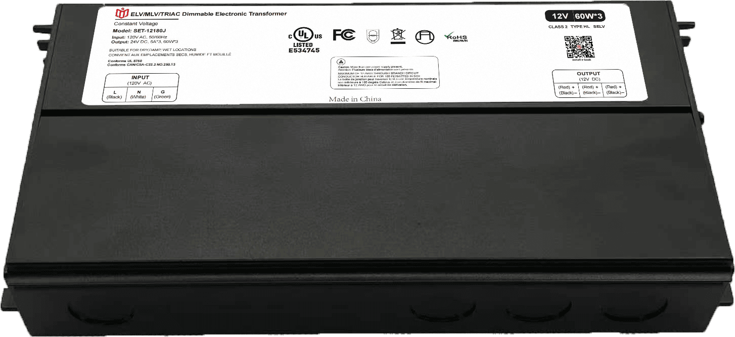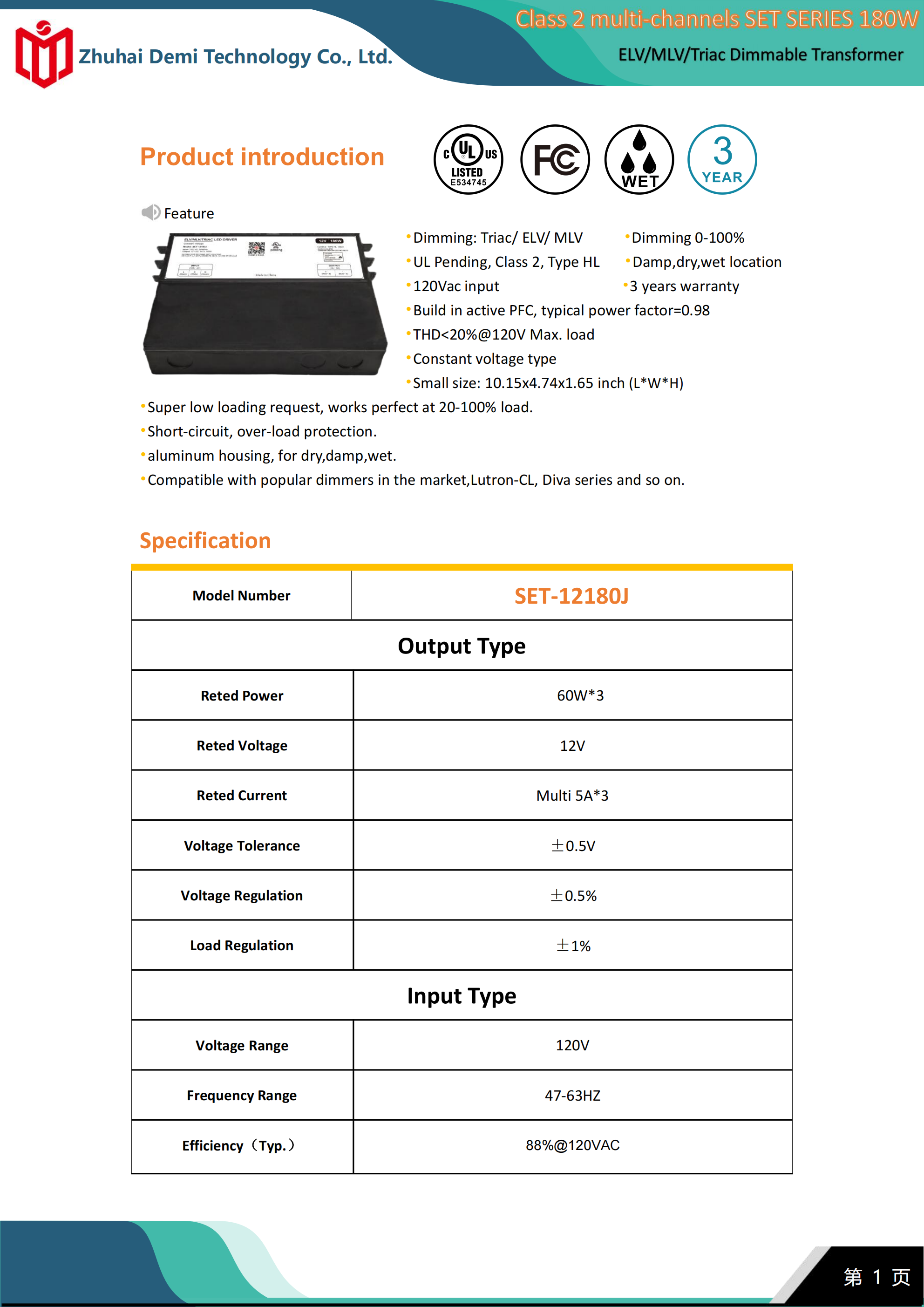 Item number: SET-12180J Dim: Triac/ELV/MLV Input Voltage: 120V Output Voltage: 12V PF: ≥0.9 Efficiency: ≥88% Warranty: 3 years. Protection: short circuit,overload,over-temperature, Certificate: UL list Brand: DEMI