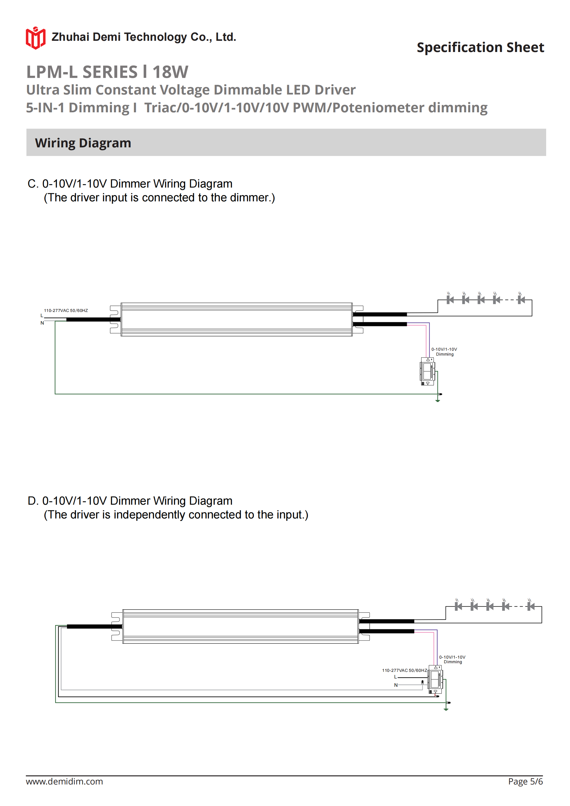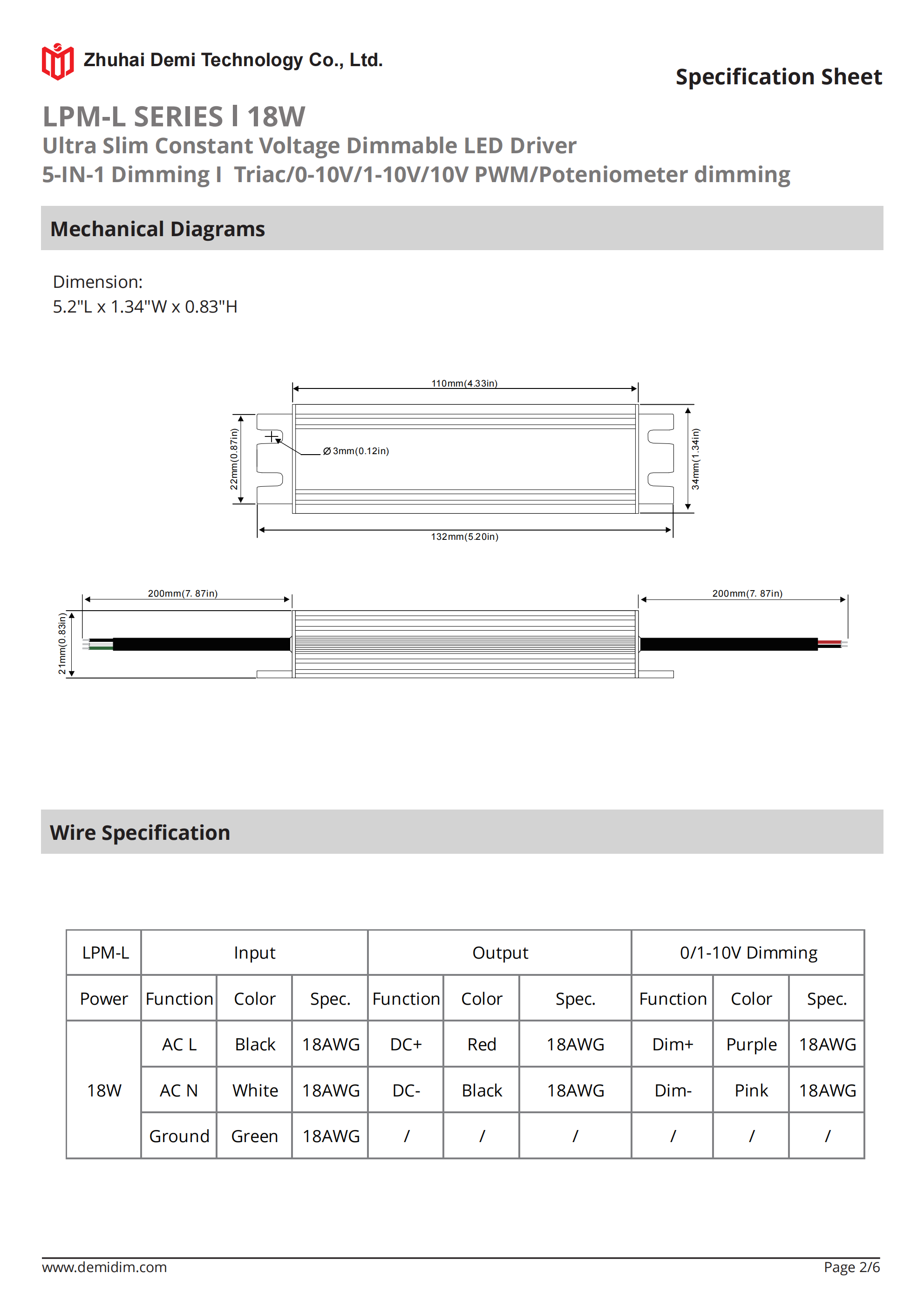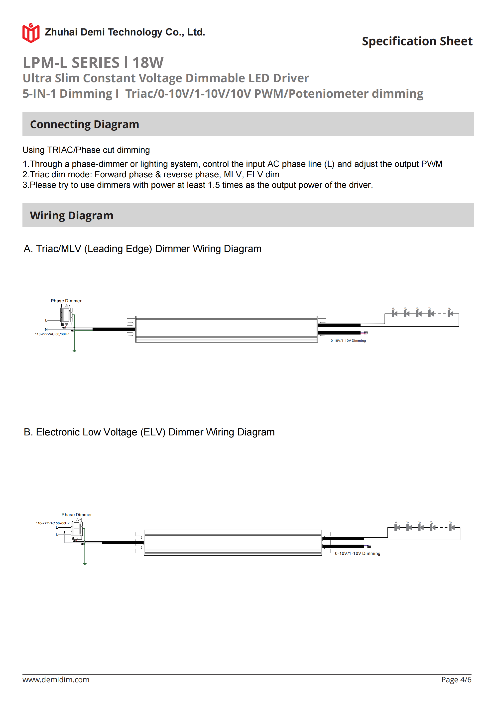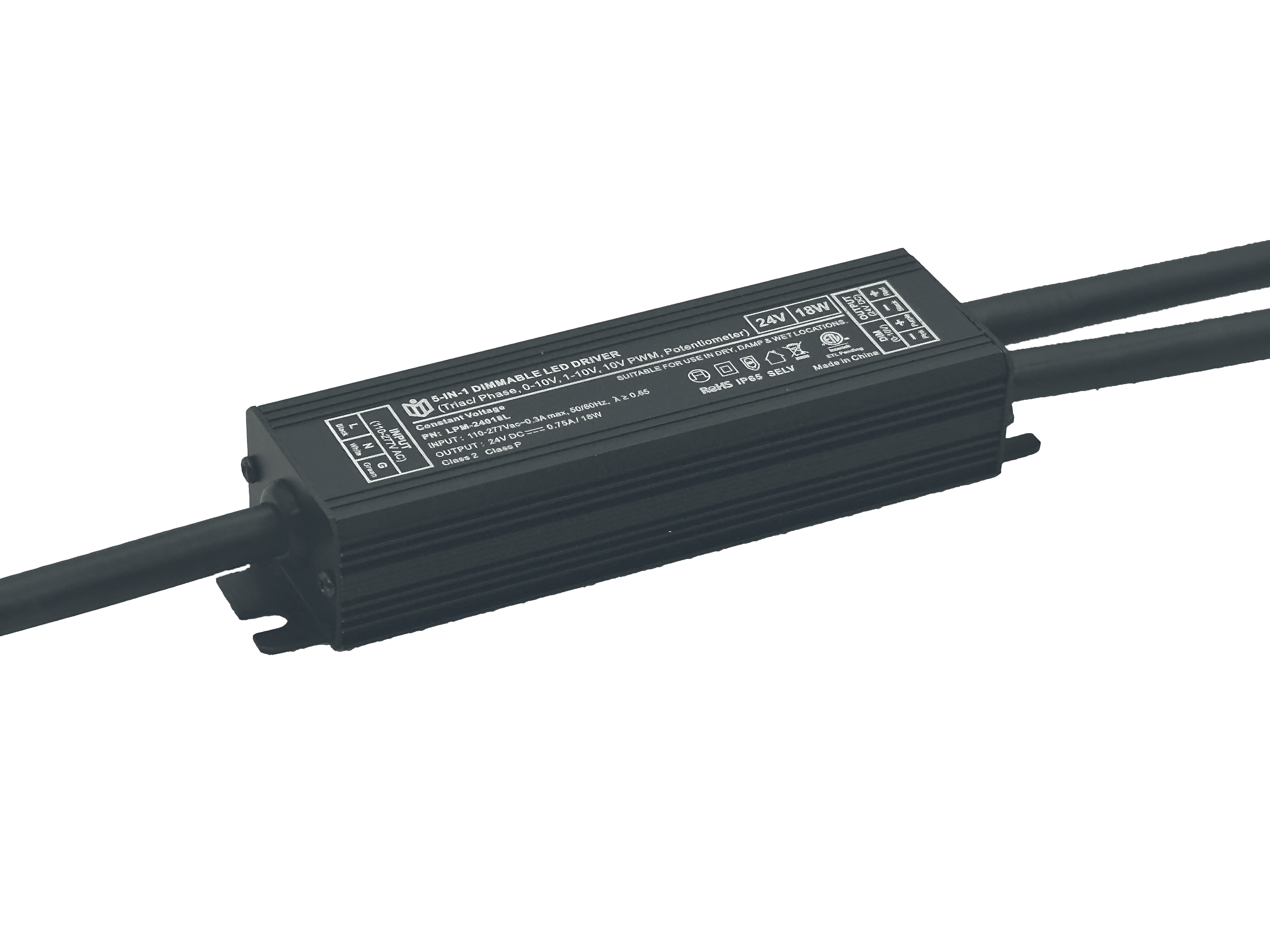 Item number: LPM-12018L,LPM-24018L Dim: Triac/0-10V/1-10V/10V PWM / Potentiometer Dimming method: PWM Input Voltage: 110-277V Output Voltage: 12V/24V PF: ≥0.65 Efficiency: ≥80% Warranty: 5 years. Protection: short circuit,overload,over-temperature, Certificate: ETL list Brand: DEMI