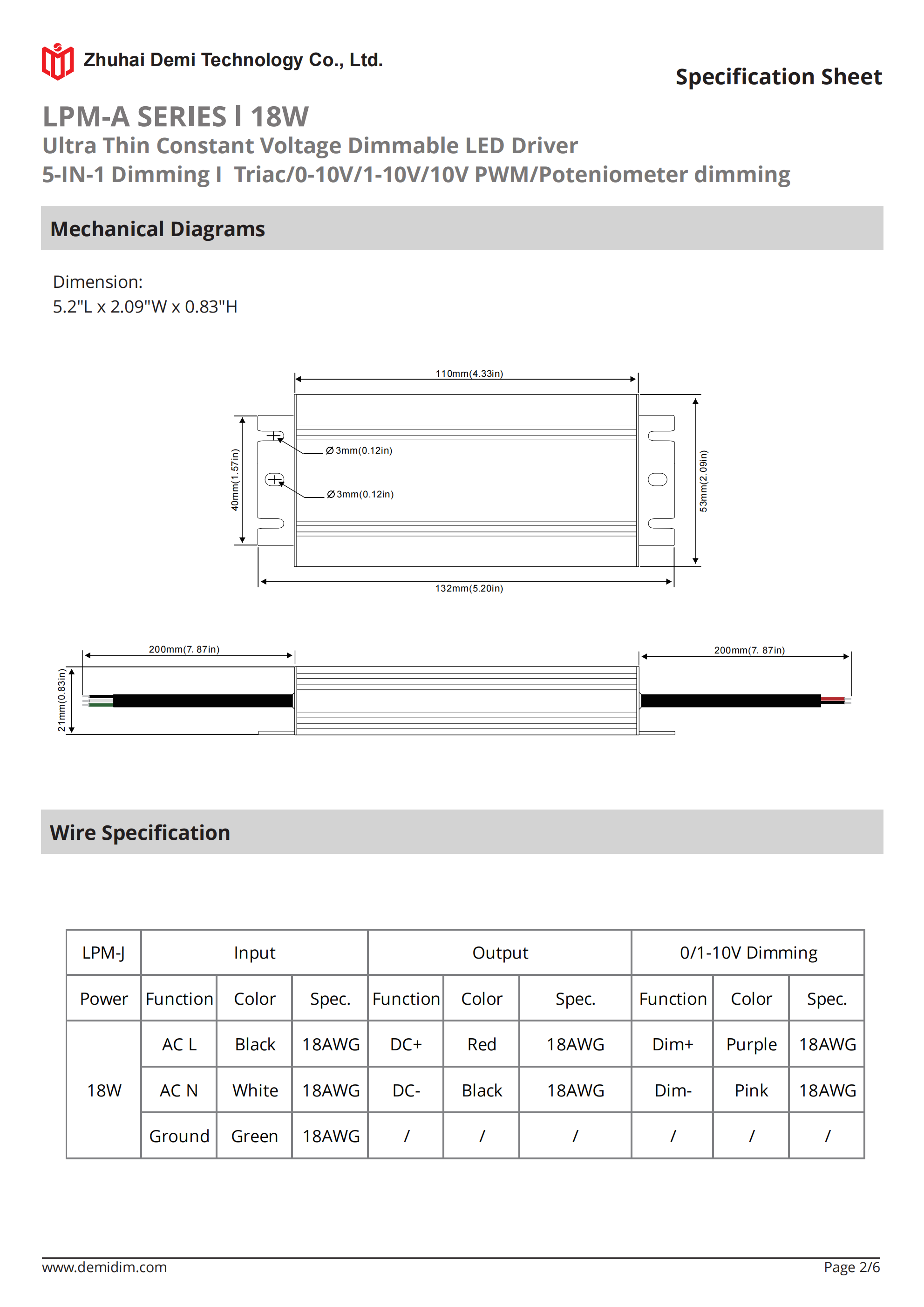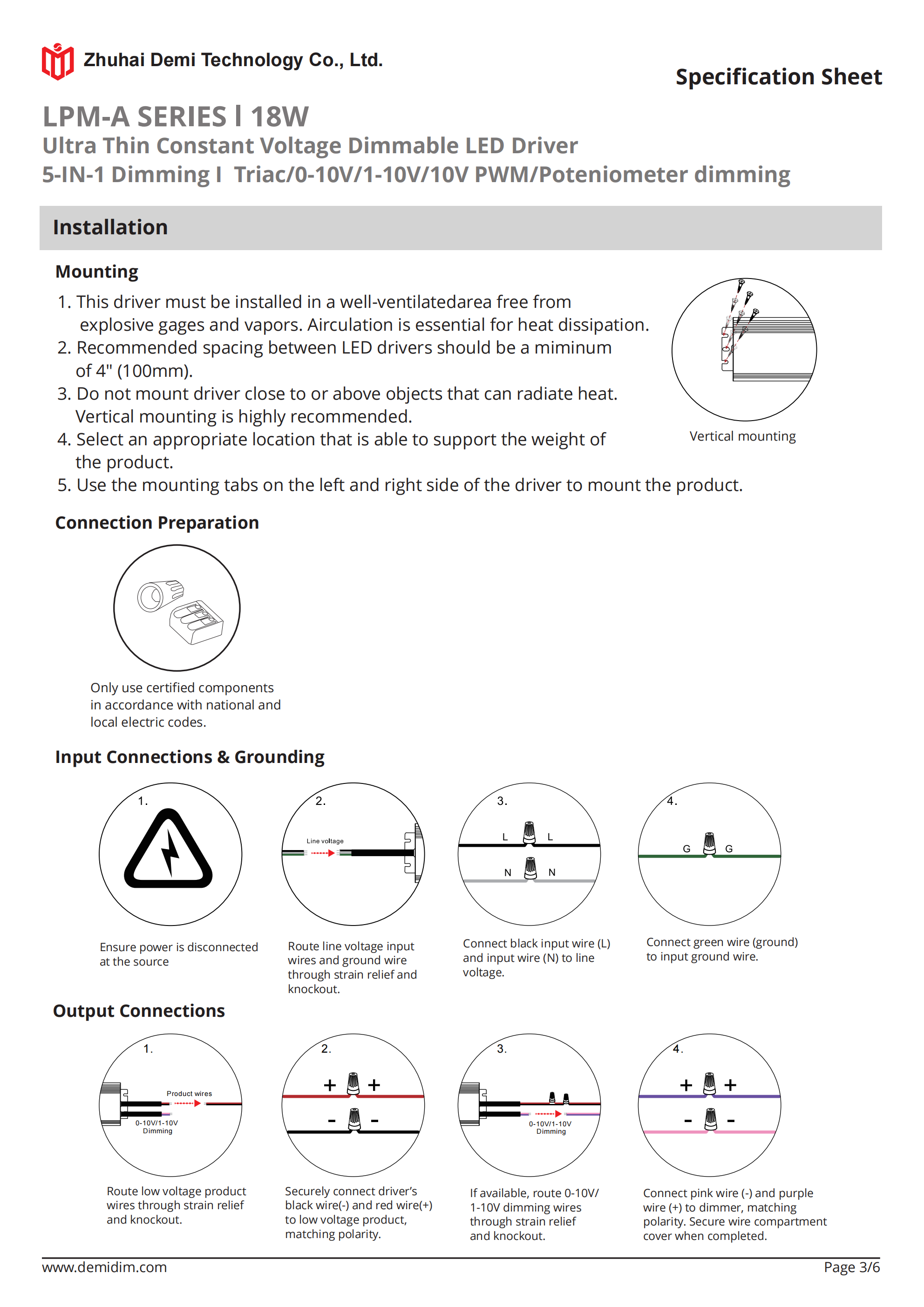 Item number: LPM-12018A,LPM-24018A Dim: Triac/0-10V/1-10V/10V PWM / Potentiometer Dimming method: PWM Input Voltage: 110-277V Output Voltage: 12V/24V PF: ≥0.65 Efficiency: ≥80% Warranty: 5 years. Protection: short circuit,overload,over-temperature, Certificate: ETL list Brand: DEMI