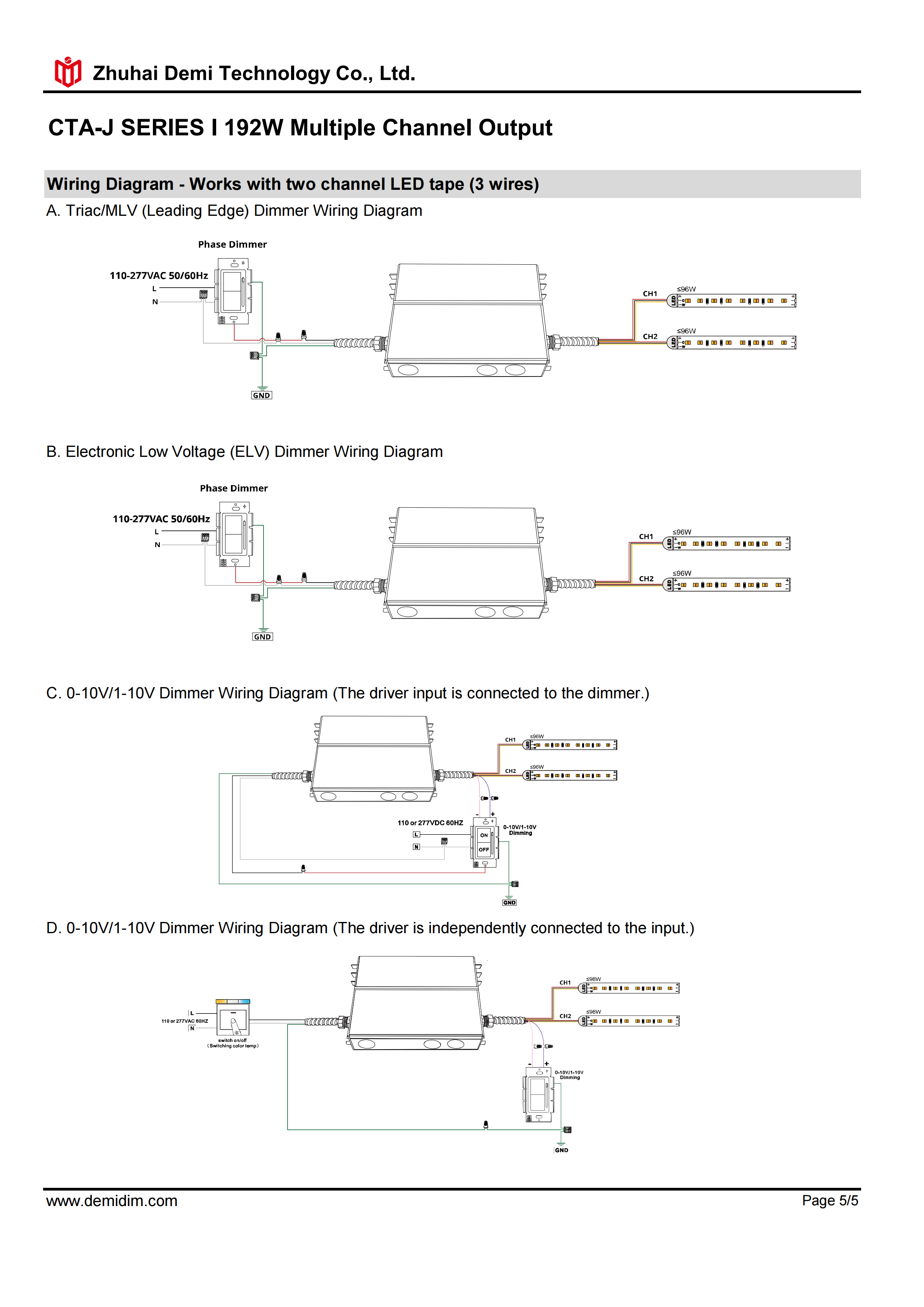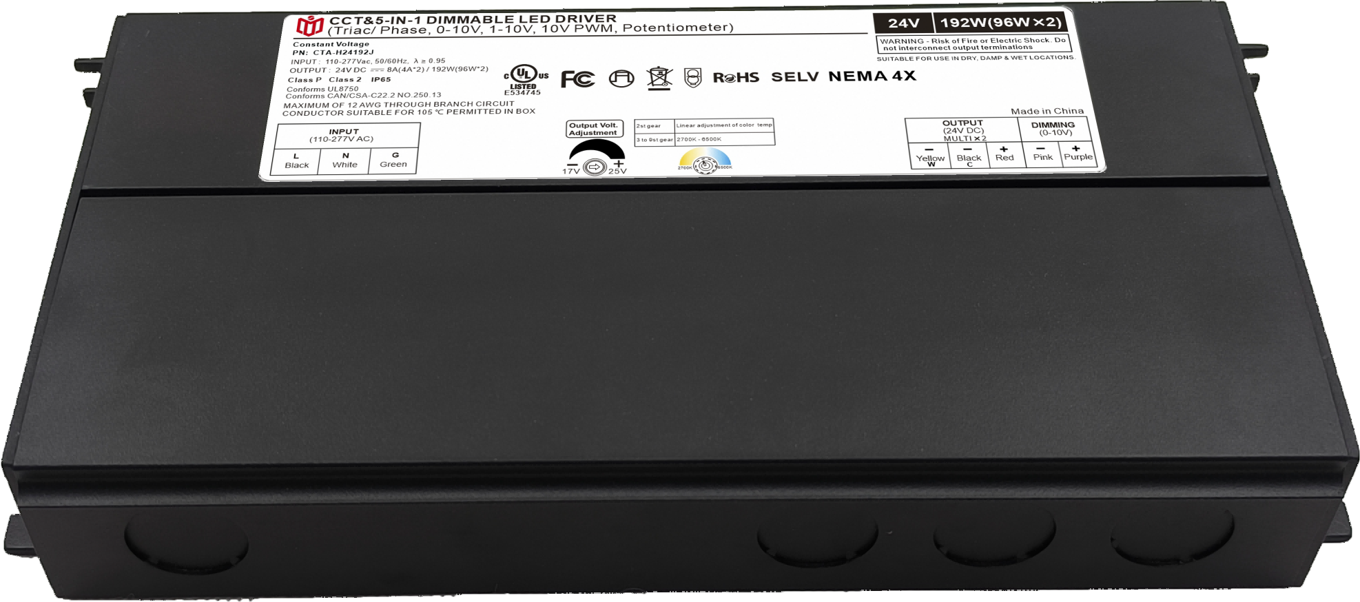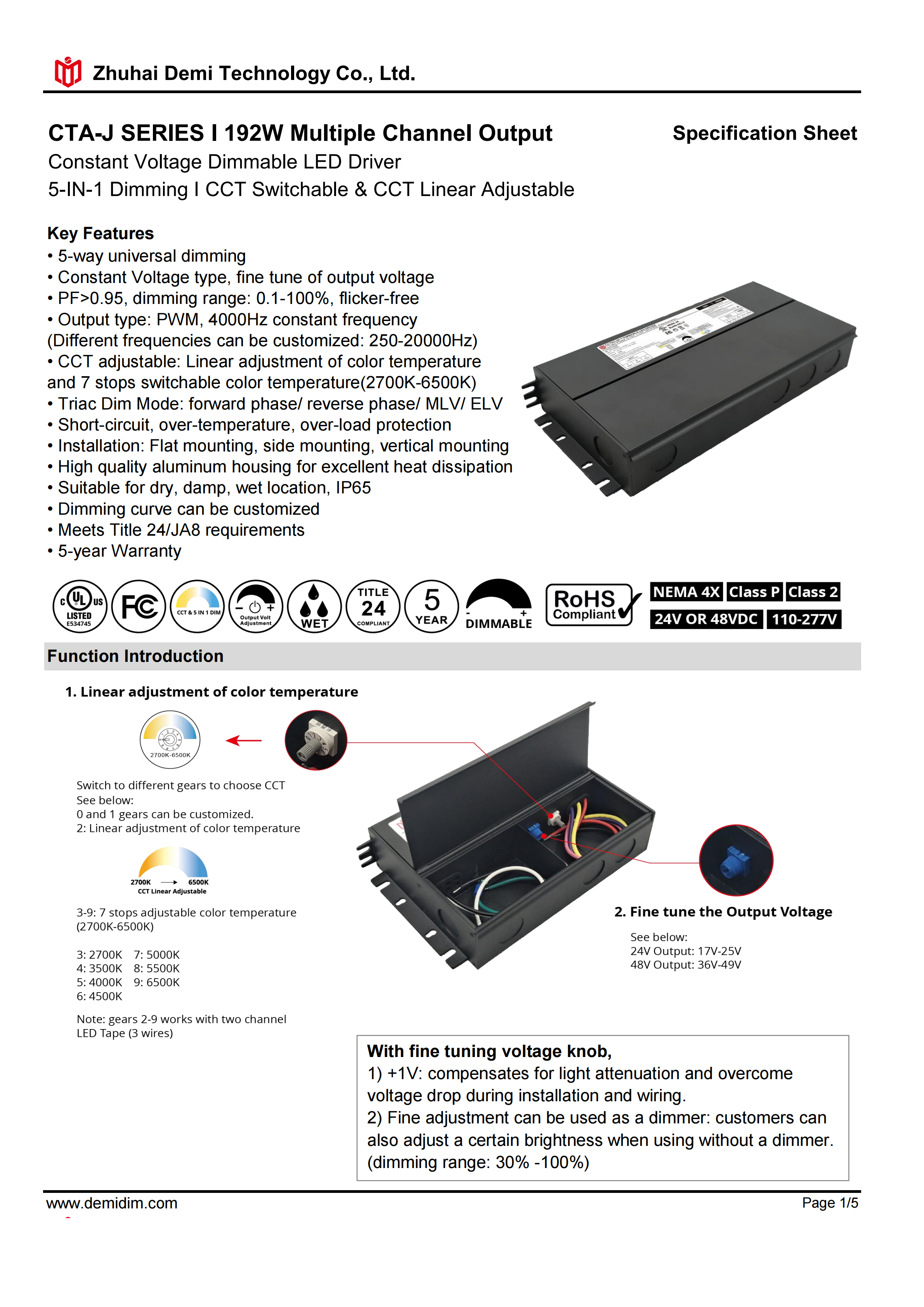 Item number: CTA-12300J,CTA-24300J,CTA-48300J Dim: Triac/0-10V/1-10V/10V PWM / Potentiometer Dimming method: PWM Input Voltage: 110-277V Output Voltage: 12V/24V/48V PF: ≥0.9 Efficiency: ≥90% Protection: short circuit,overload,over-temperature, Certificate: UL list Brand: DEMI Item number: CTA-H12120J,CTA-H24120J,CTA-48192J Dim: Triac/0-10V/1-10V/10V PWM / Potentiometer Dimming method: PWM Input Voltage: 110-277V Output Voltage: 12V/24V/48V PF: ≥0.9 Efficiency: ≥91% Protection: short circuit,overload,over-temperature, Certificate: UL list Brand: DEM