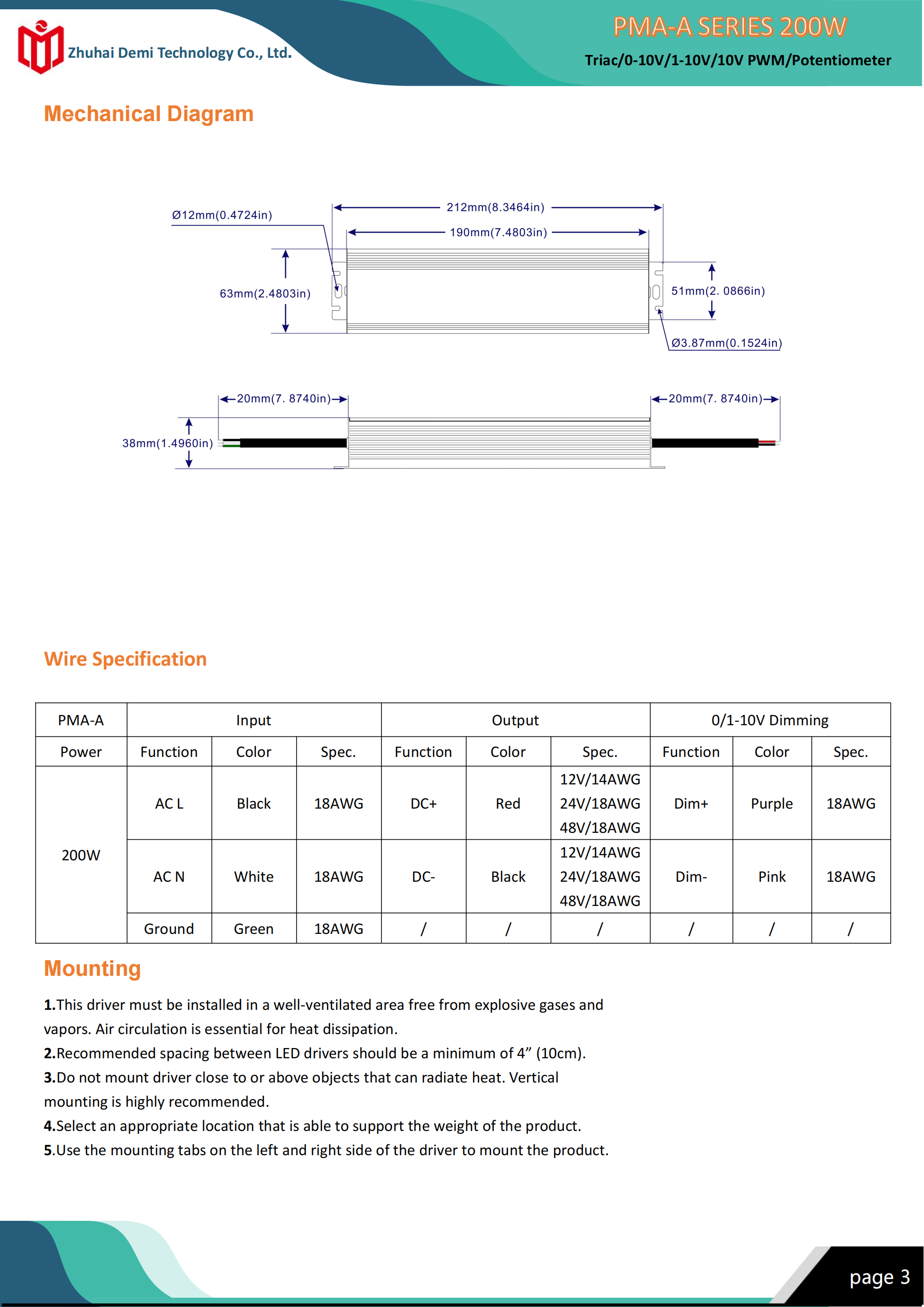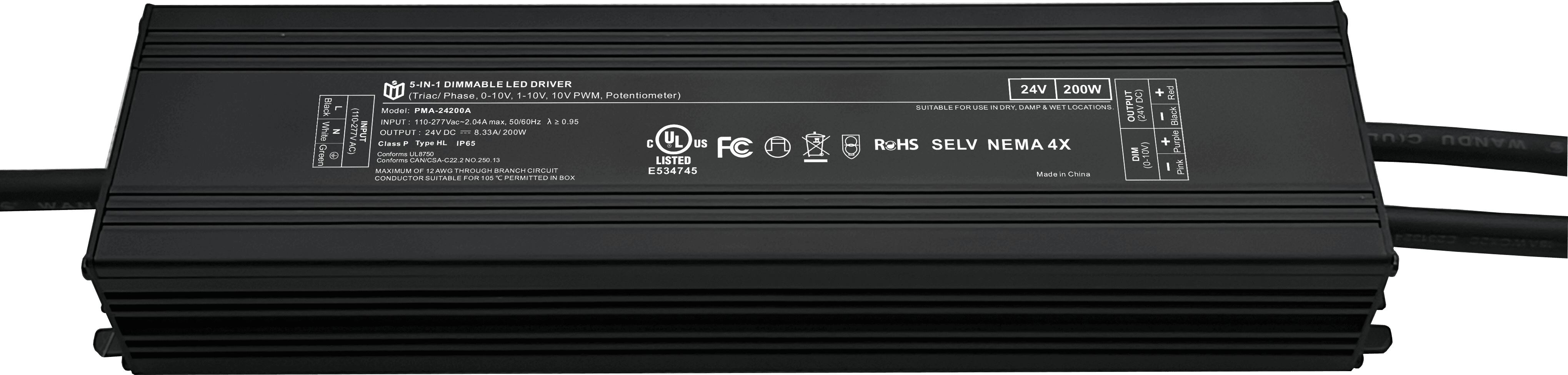 Item number:PMA-12200A PMA-24200A PMA-48200A Dim: Triac/0-10V/1-10V/10V PWM / Potentiometer Output Method: PWM Input Voltage: 110-277V Output Voltage: 12V/24V/48V PF: ≥0.9 Efficiency: ≥85% Warranty: 5 years. Protection: short circuit,overload,over-temperature, Certificate: UL list Brand: DEMI