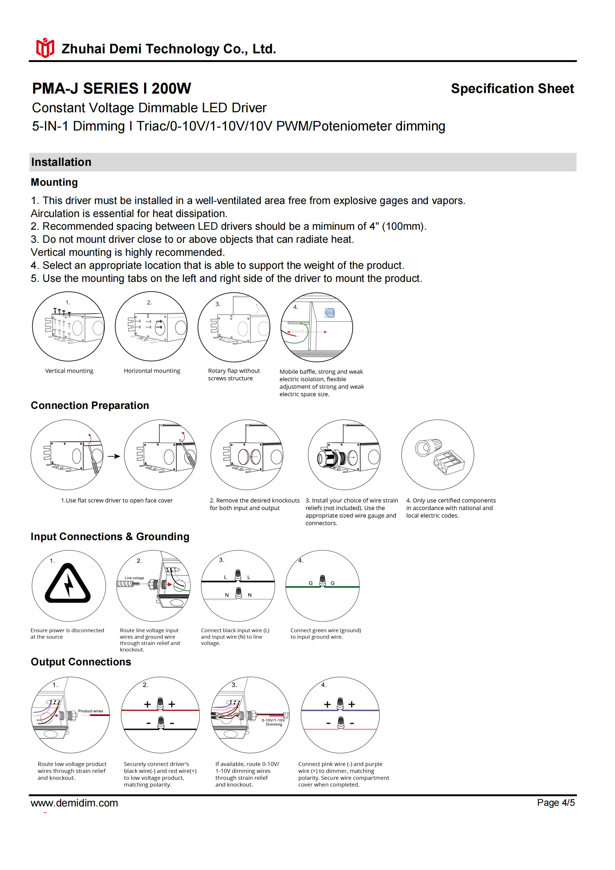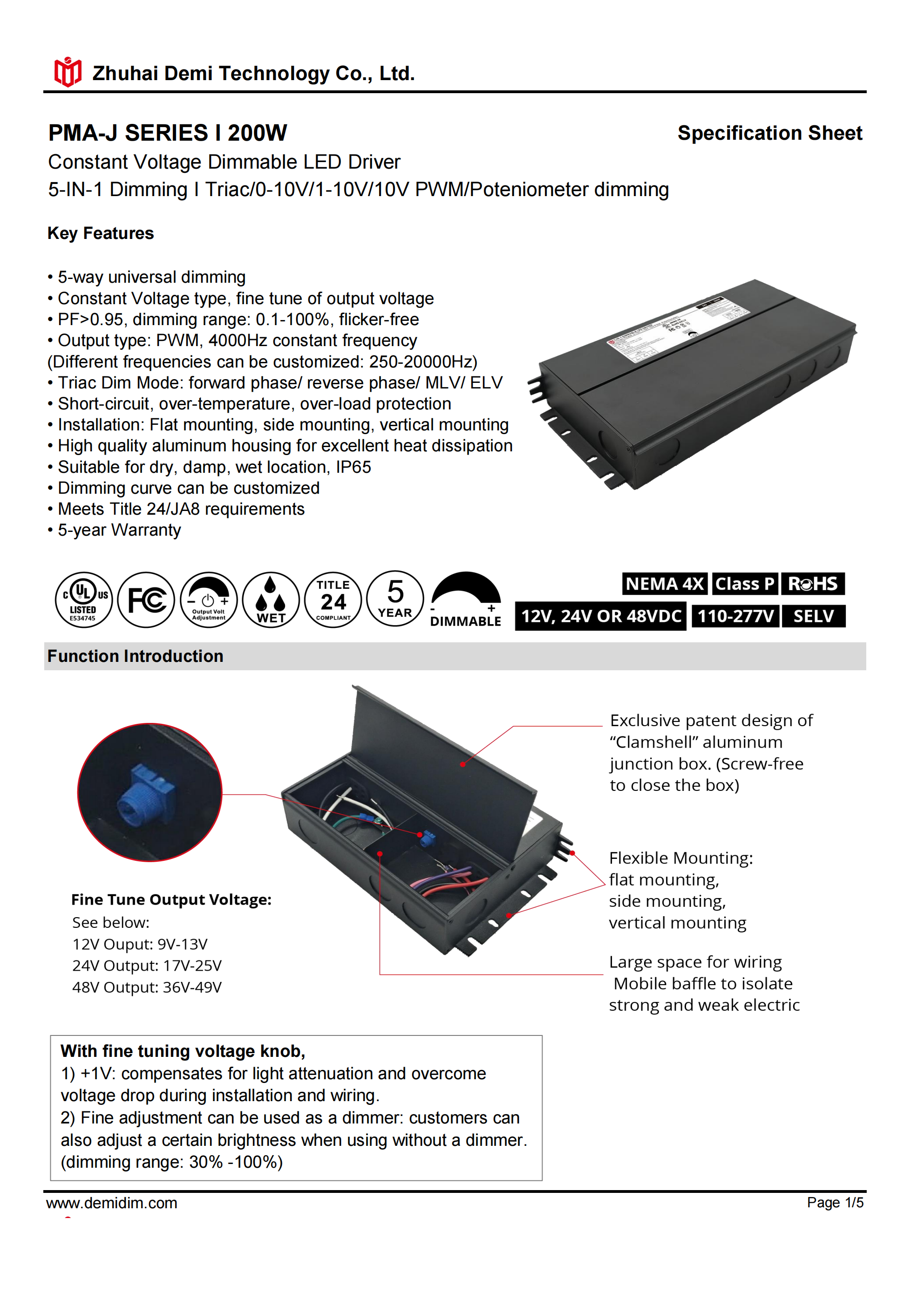 Item number: PMA-12200J,PMA-24200J,PMA-48200J, Type: Constant Voltage Dim: Triac/0-10V/1-10V/10V PWM / Potentiometer Output Method: PWM Input Voltage: 110-277V Output Voltage: 12V/24V/48V PF: ≥0.9 Efficiency: ≥90% Warranty: 5 years. Protection: short circuit,overload,over-temperature, Certificate: UL list Brand: DEMI