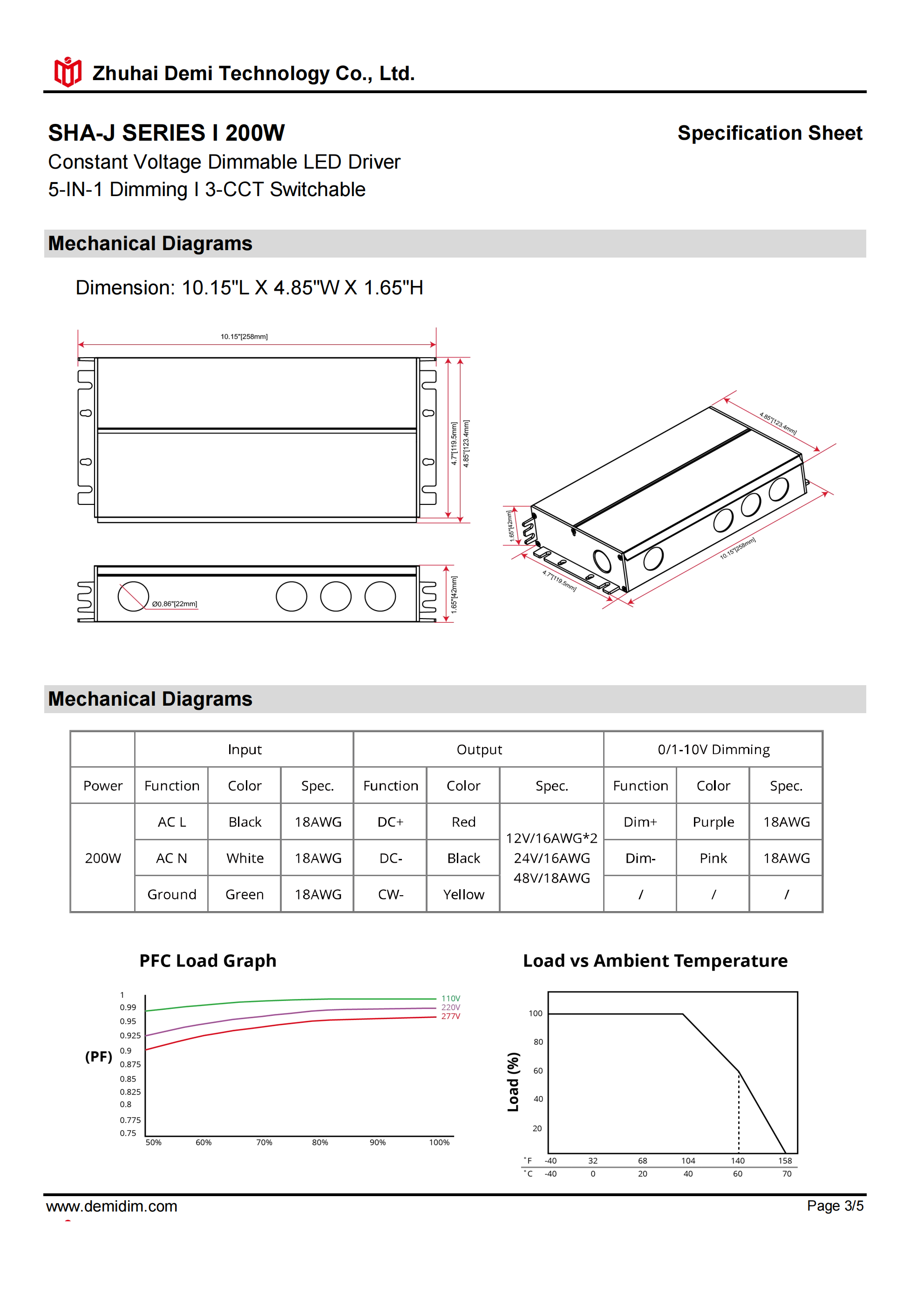Item number: SHA-12200J,SHA-24200J,SHA-48200J Dim: Triac/0-10V/1-10V/10V PWM / Potentiometer Output Method: PWM Input Voltage: 110-277V Output Voltage: 12V/24V/48V PF: ≥0.9 Efficiency: ≥90% Warranty: 5 years. Protection: short circuit,overload,over-temperature, Certificate: UL list Brand: DEMI