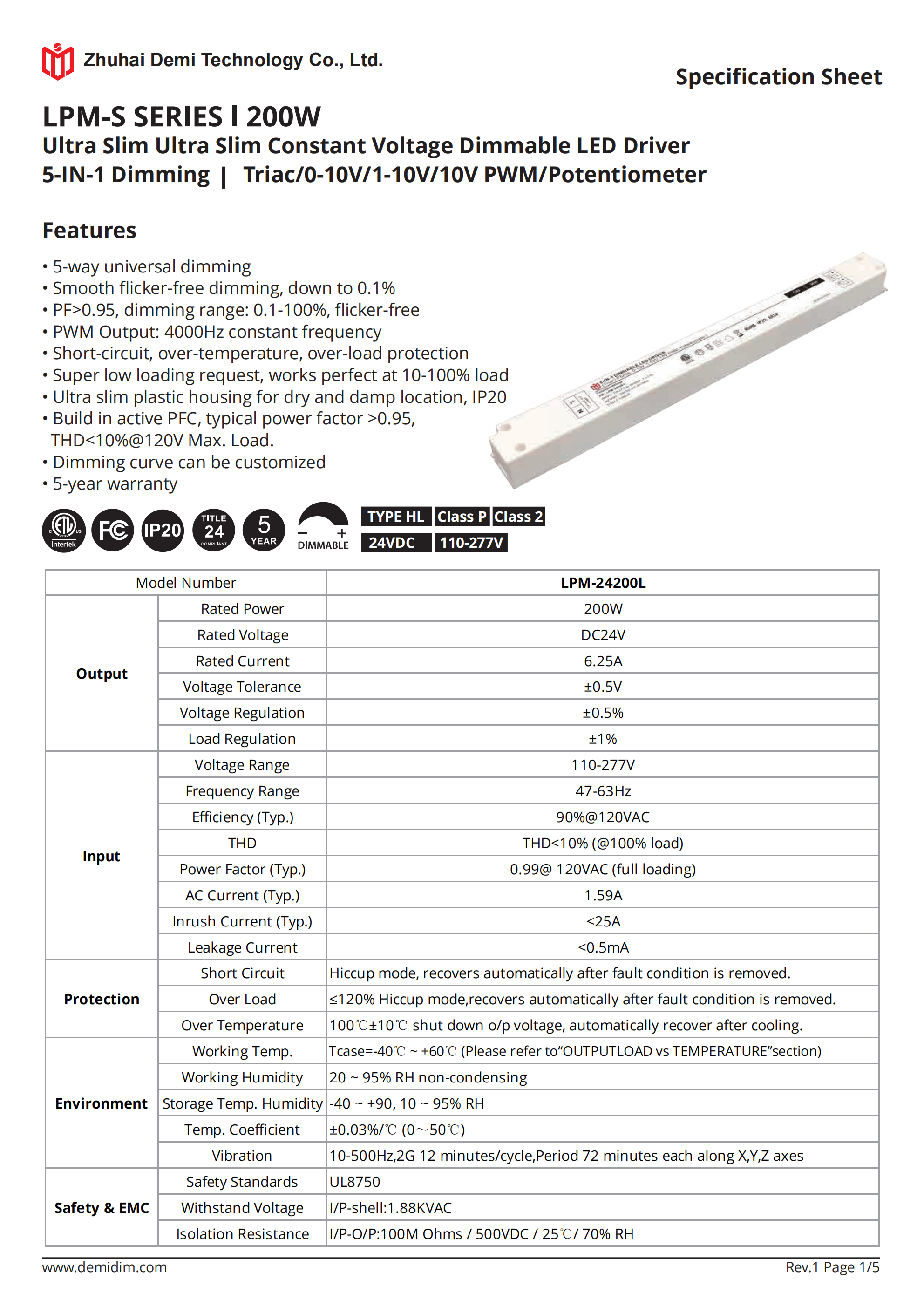 Item number: LPM-24200S Dim: Triac/0-10V/1-10V/10V PWM / Potentiometer Dimming method: PWM Input Voltage: 110-277V Output Voltage: 24V PF: ≥0.9 Efficiency: ≥90% Warranty: 5 years. Protection: short circuit,overload,over-temperature, Certificate: ETL list Brand: DEMI