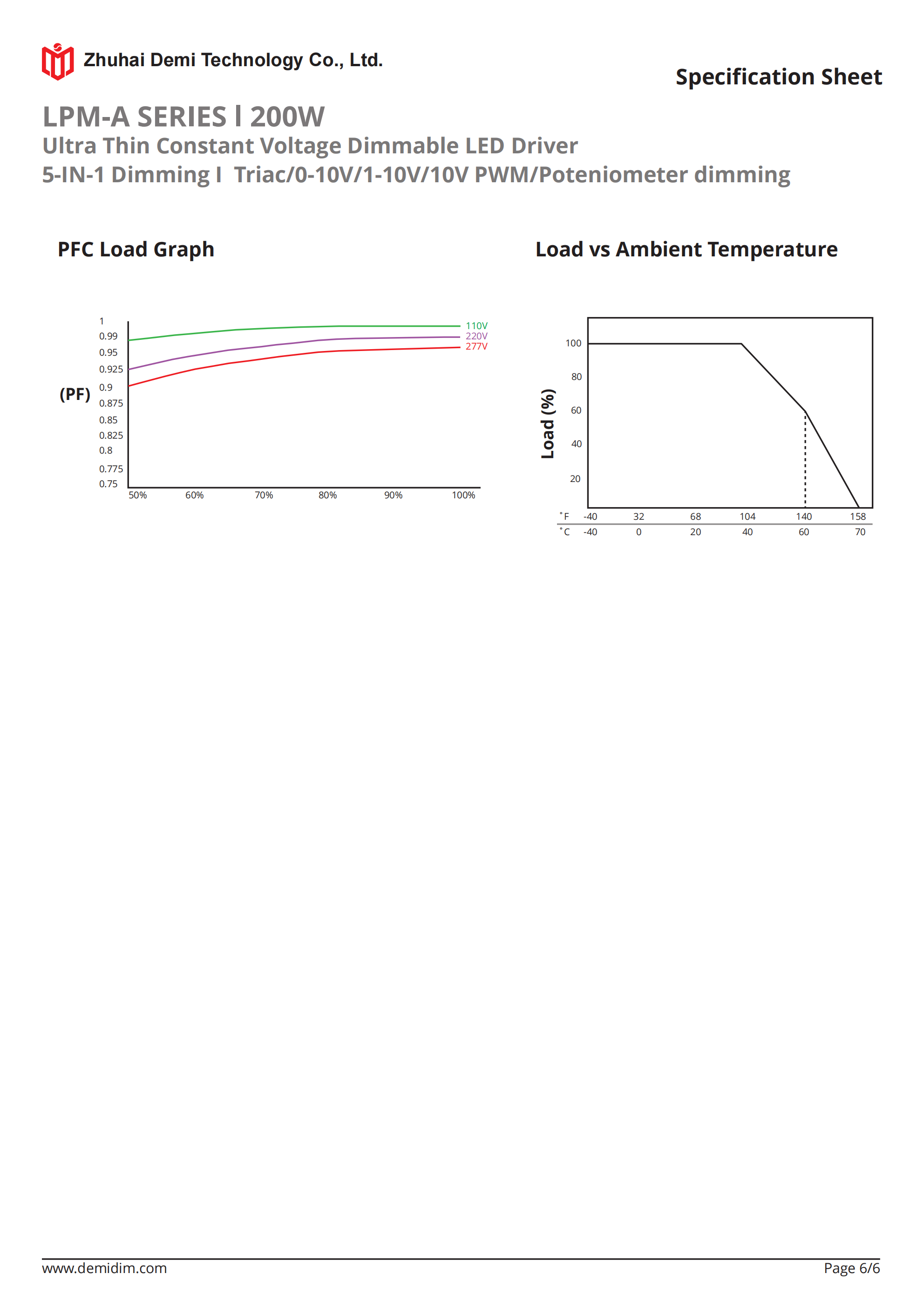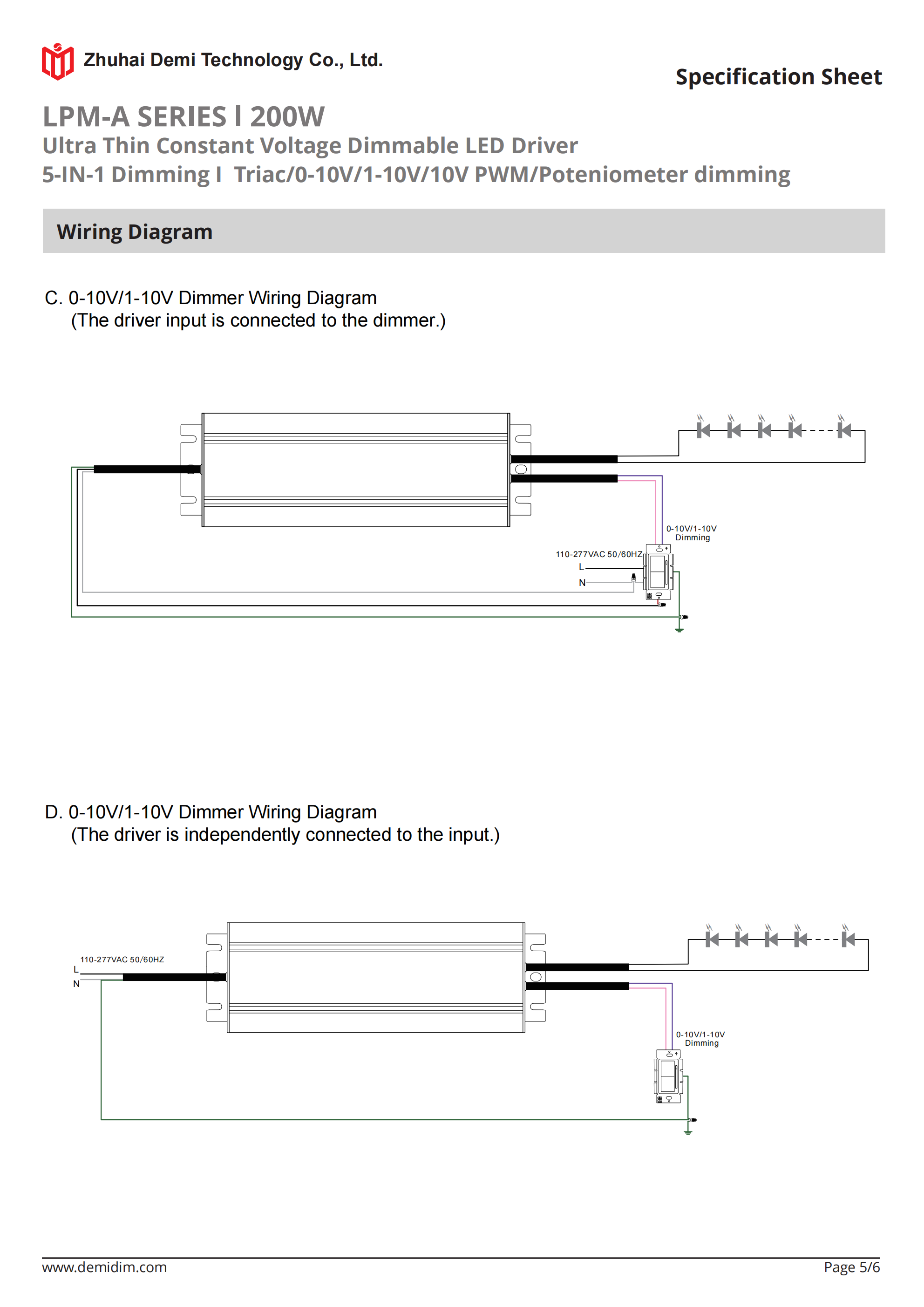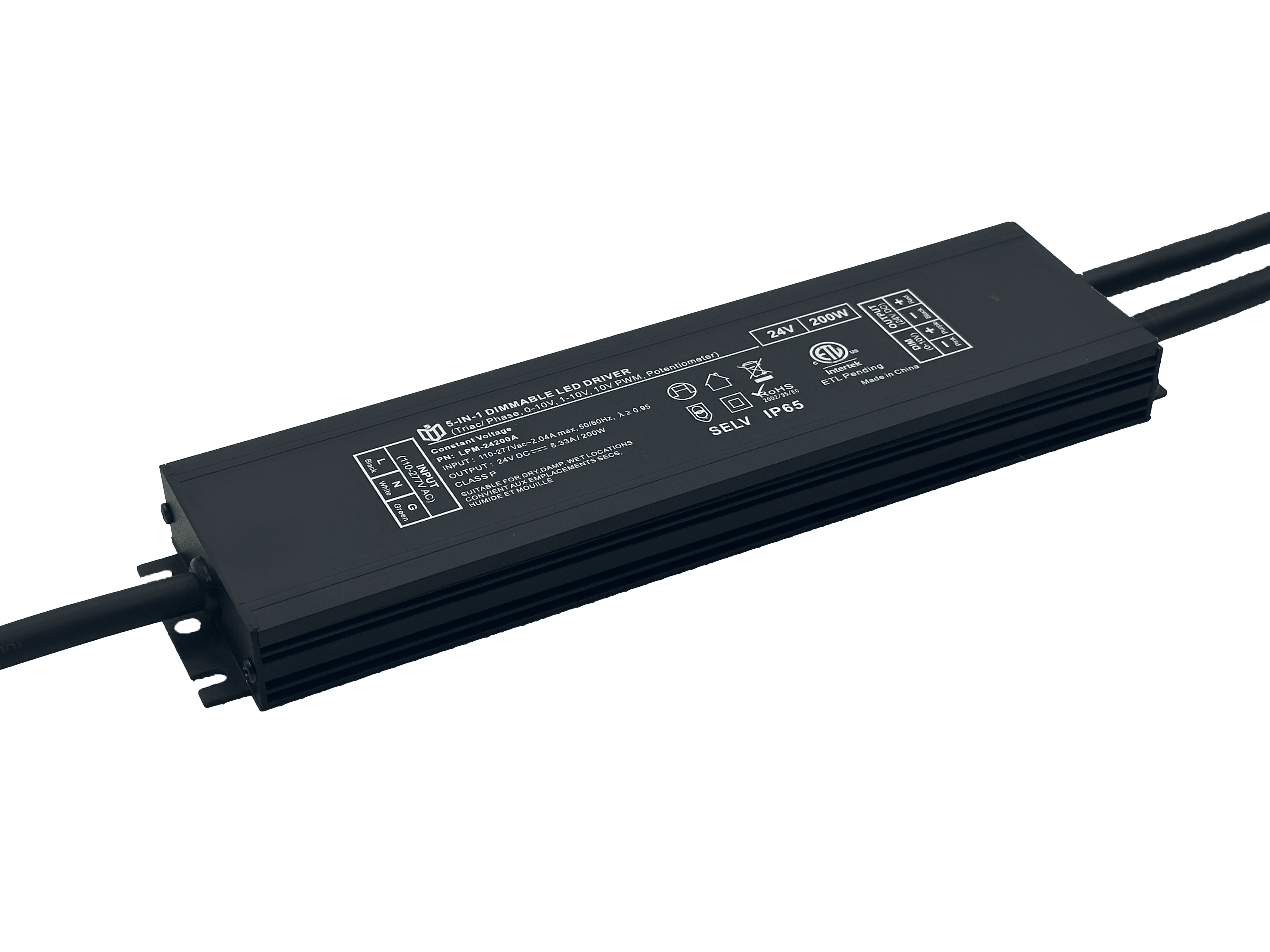 Item number: LPM-12200A,LPM-24200A Dim: Triac/0-10V/1-10V/10V PWM / Potentiometer Dimming method: PWM Input Voltage: 110-277V Output Voltage: 12V/24V PF: ≥0.9 Efficiency: ≥90% Warranty: 5 years. Protection: short circuit,overload,over-temperature, Certificate: ETL list Brand: DEMI