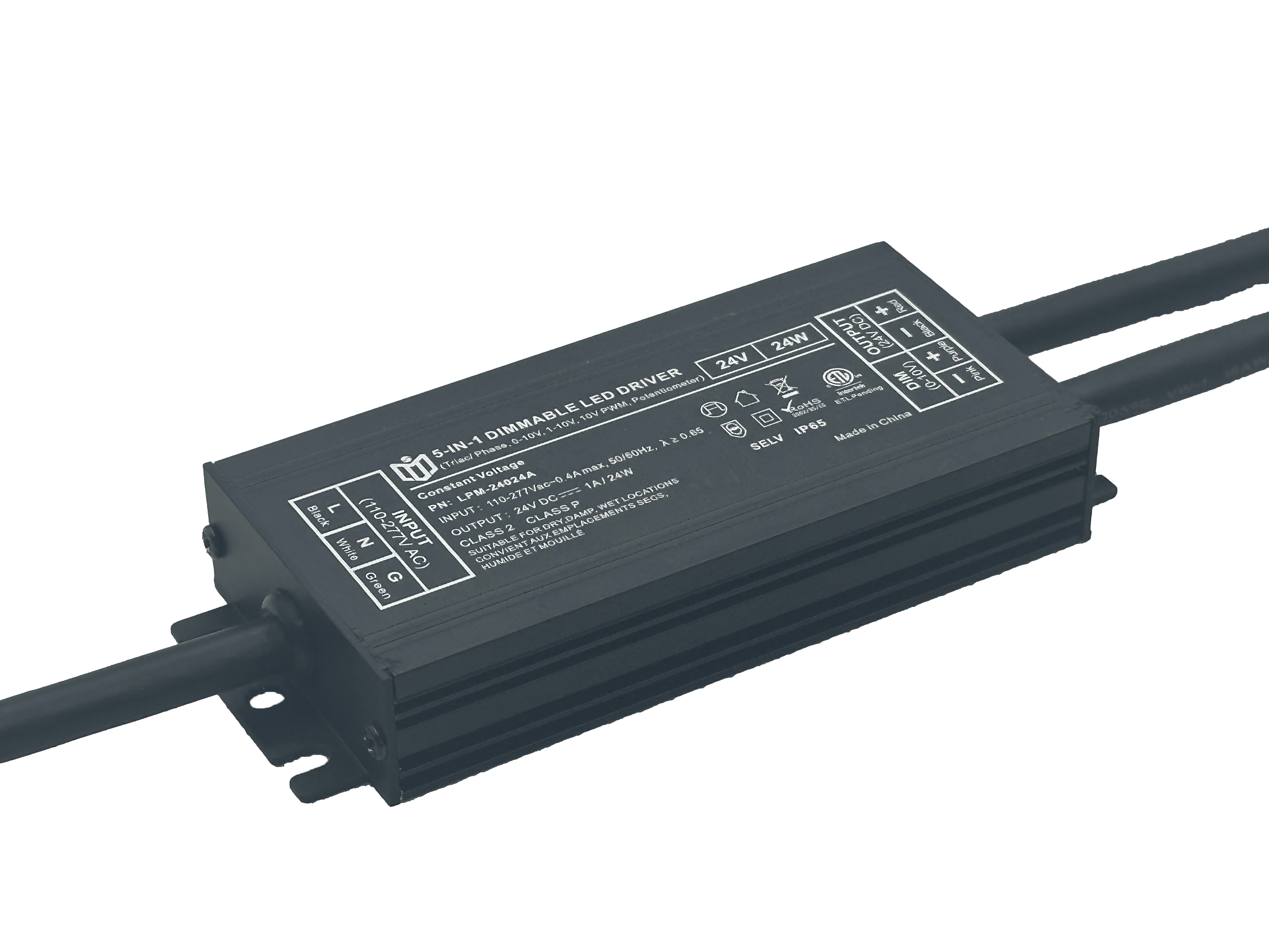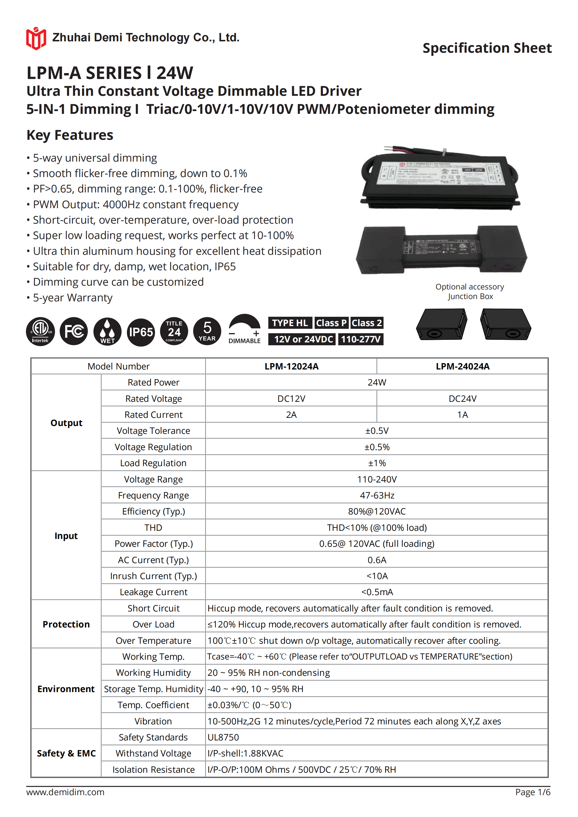 Item number: LPM-12024A,LPM-24024A Dim: Triac/0-10V/1-10V/10V PWM / Potentiometer Dimming method: PWM Input Voltage: 110-277V Output Voltage: 12V/24V PF: ≥0.65 Efficiency: ≥80% Warranty: 5 years. Protection: short circuit,overload,over-temperature, Certificate: ETL list Brand: DEMI