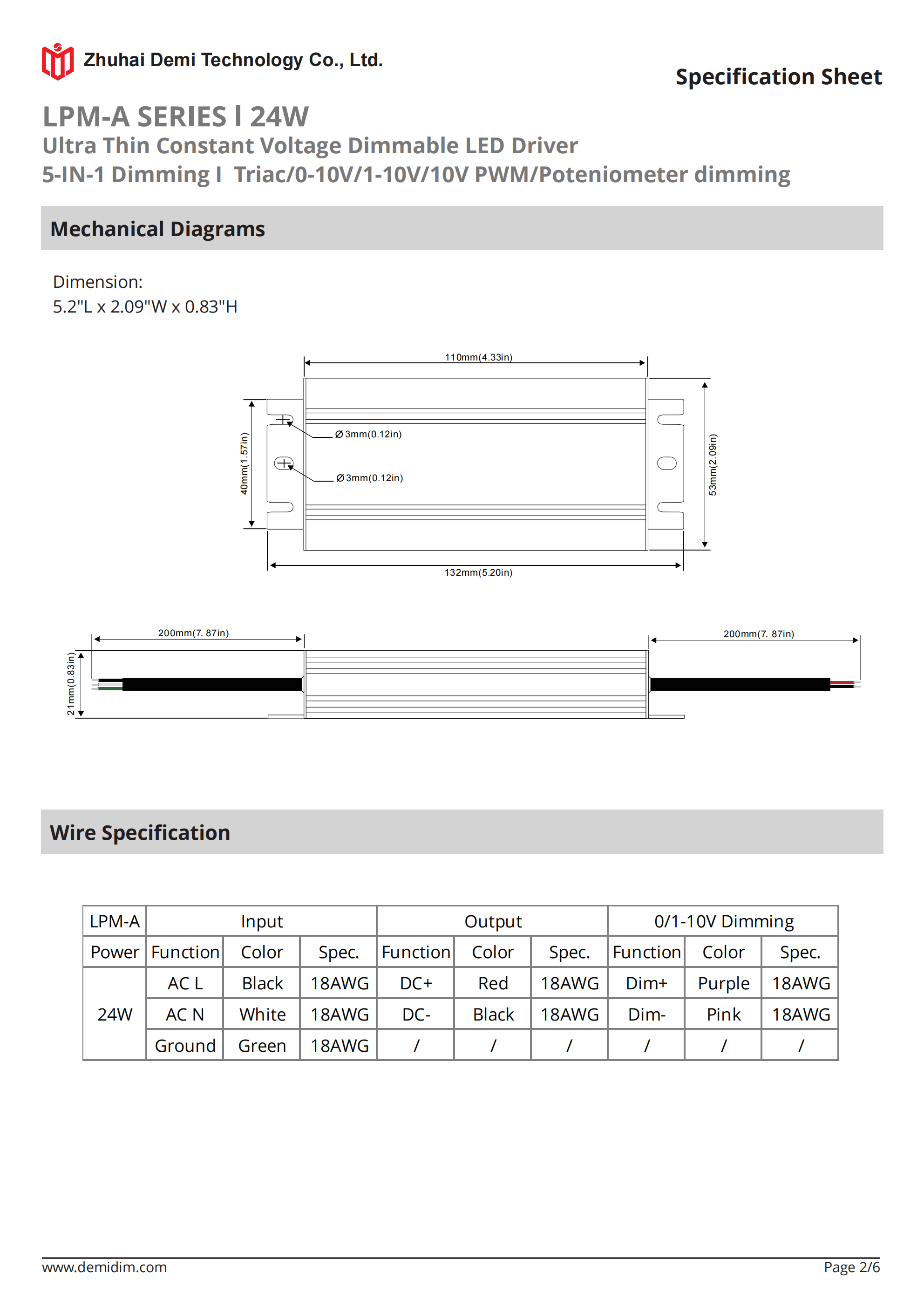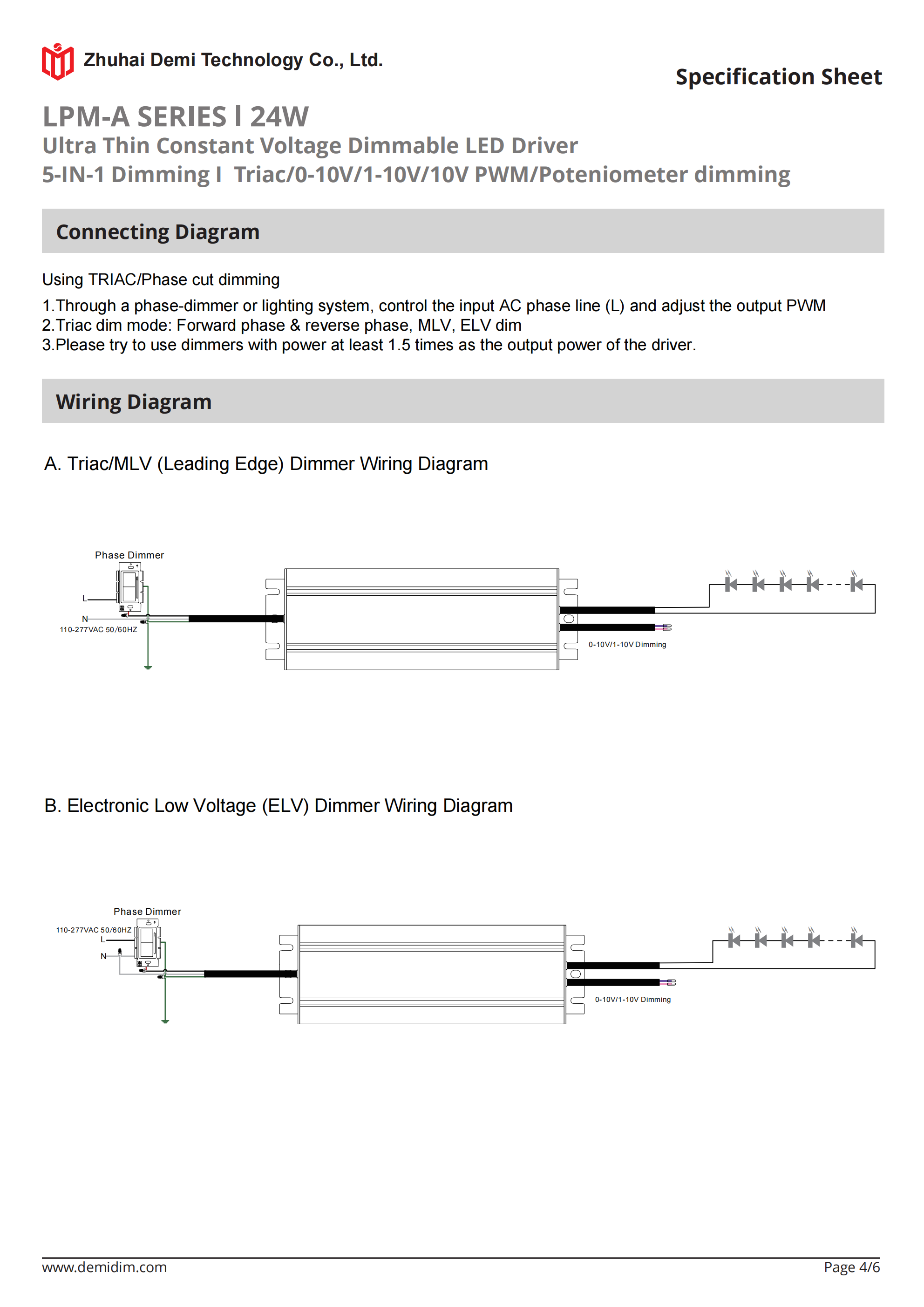 Item number: LPM-12120A,LPM-24120A Dim: Triac/0-10V/1-10V/10V PWM / Potentiometer Dimming method: PWM Input Voltage: 110-277V Output Voltage: 12V/24V PF: ≥0.9 Efficiency: ≥90% Warranty: 5 years. Protection: short circuit,overload,over-temperature, Certificate: ETL list Brand: DEMI