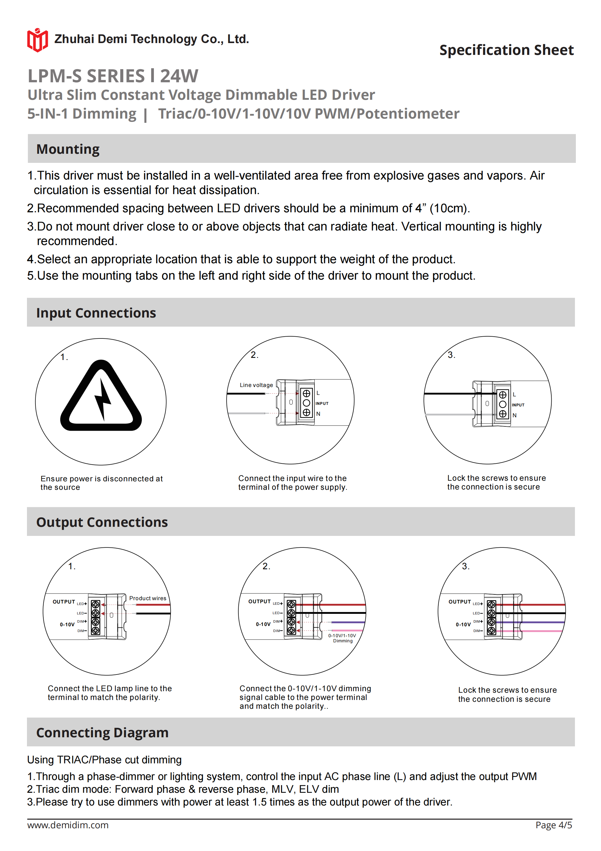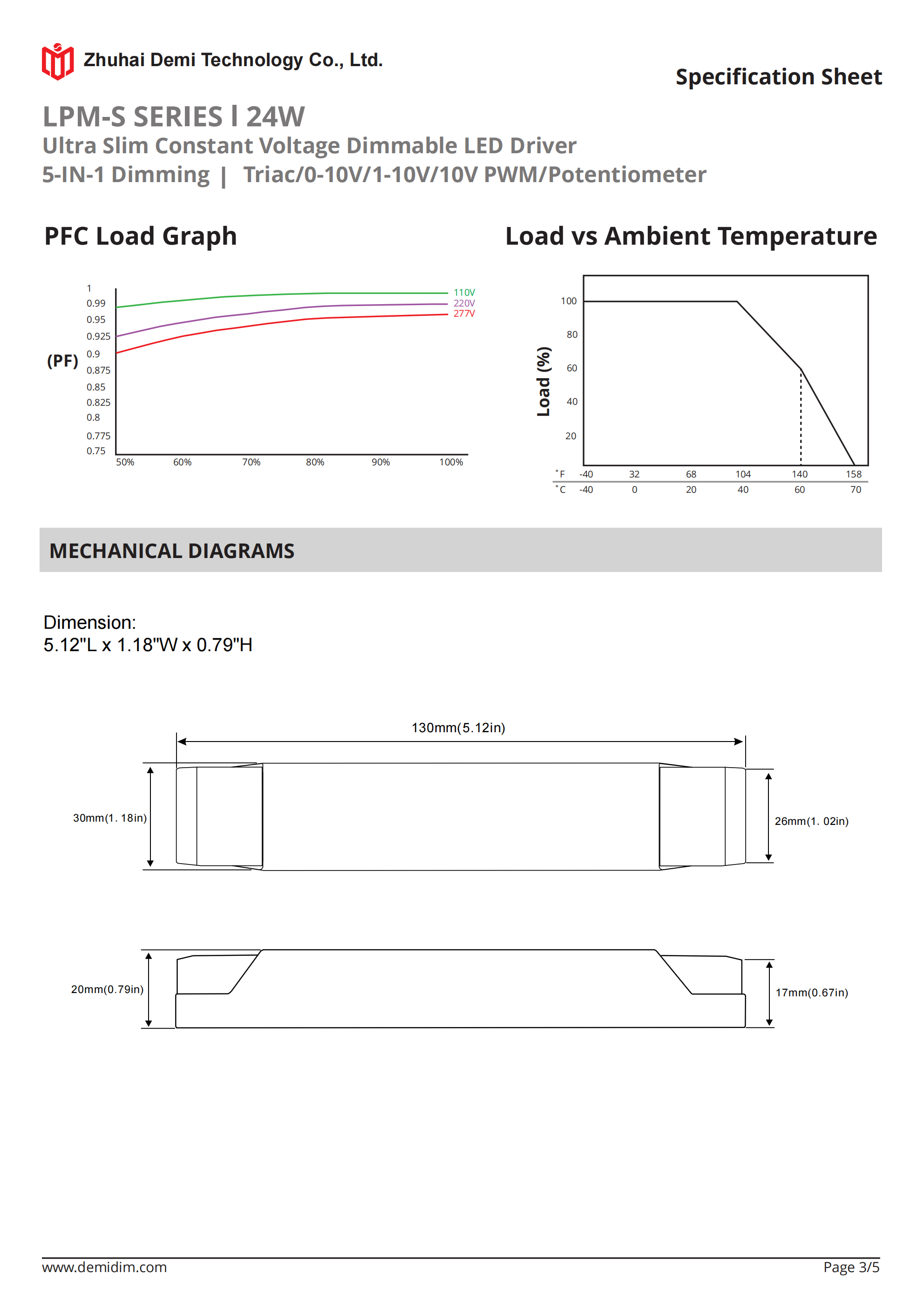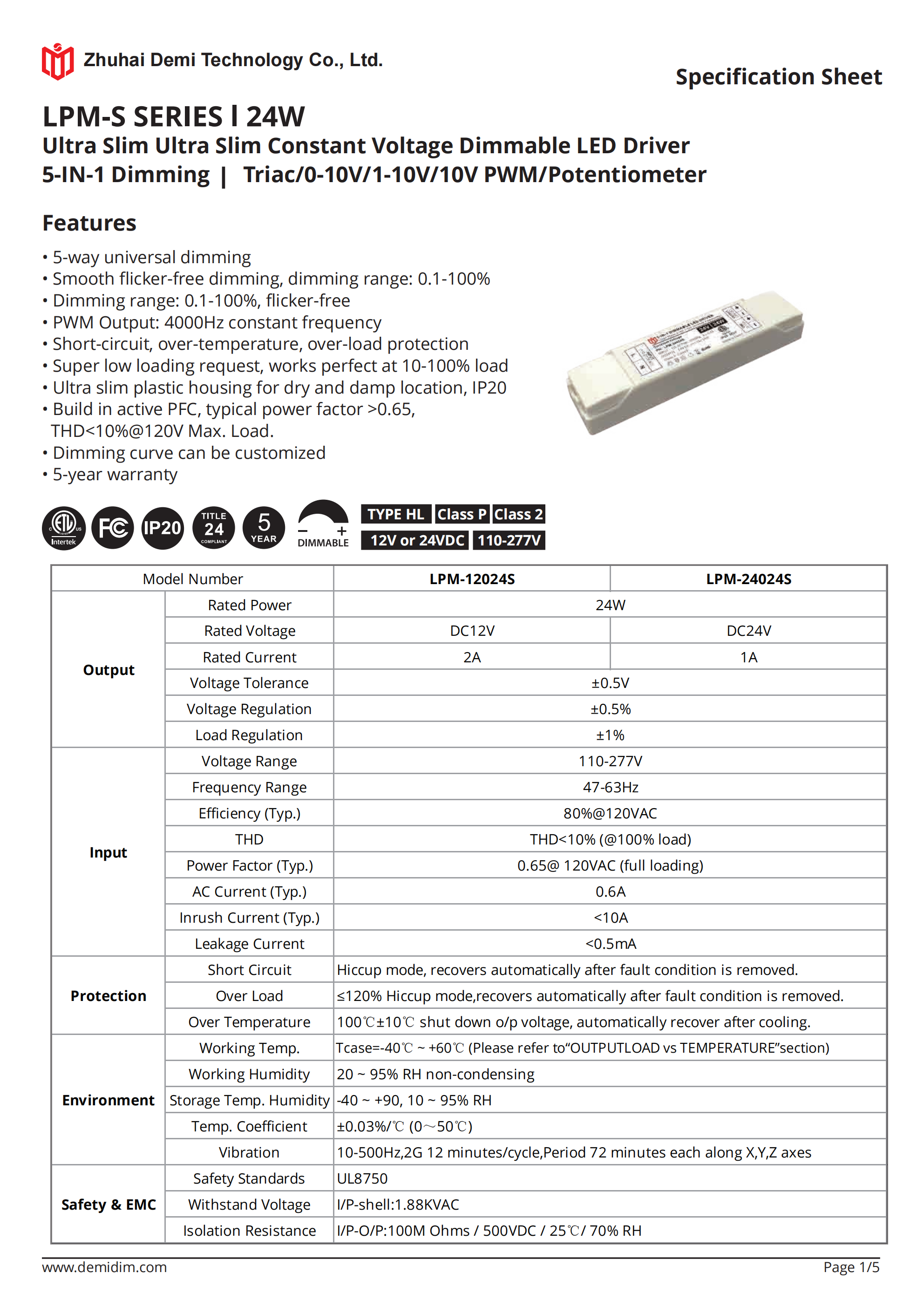 Item number: LPM-12120S,LPM-24120S Dim: Triac/0-10V/1-10V/10V PWM / Potentiometer Dimming method: PWM Input Voltage: 110-277V Output Voltage: 12V/24V PF: ≥0.9 Efficiency: ≥90% Warranty: 5 years. Protection: short circuit,overload,over-temperature, Certificate: ETL list Brand: DEMI