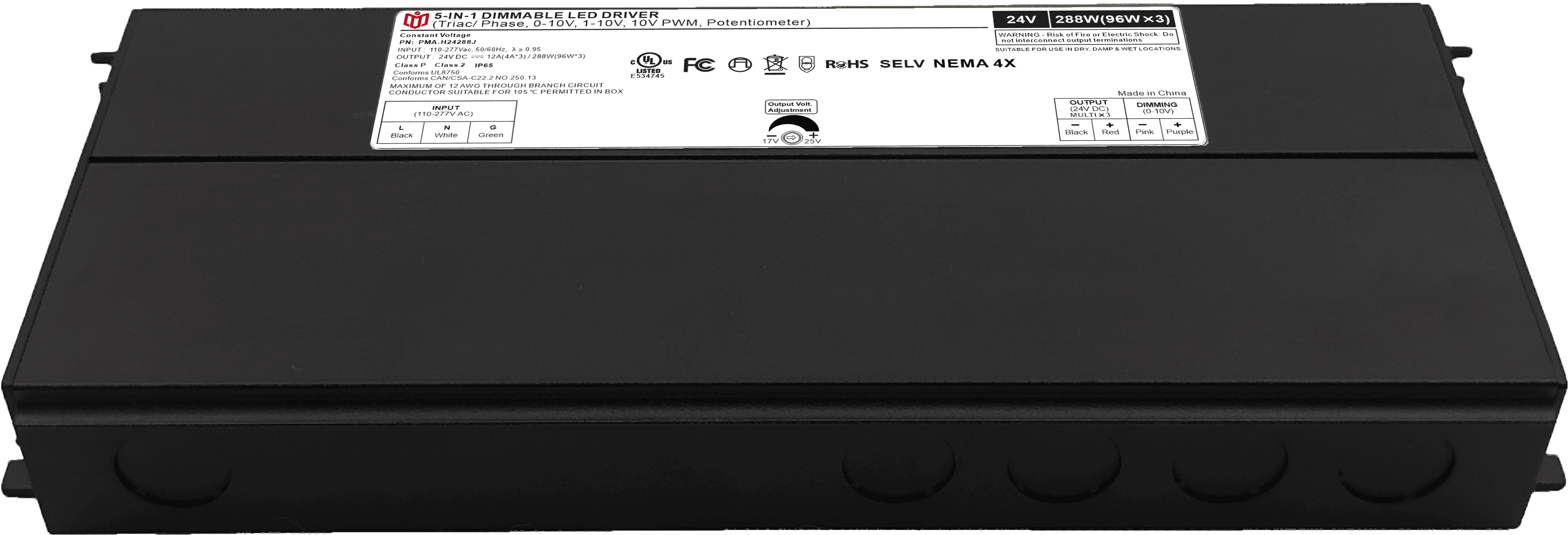 Item number: PMA-24288J,PMA-48288J, Type: Constant Voltage Dim: Triac/0-10V/1-10V/10V PWM / Potentiometer Output Method: PWM Input Voltage: 110-277V Output Voltage: 24V/48V PF: ≥0.9 Efficiency: ≥91% Warranty: 5 years. Protection: short circuit,overload,over-temperature, Certificate: UL list Brand: DEMI