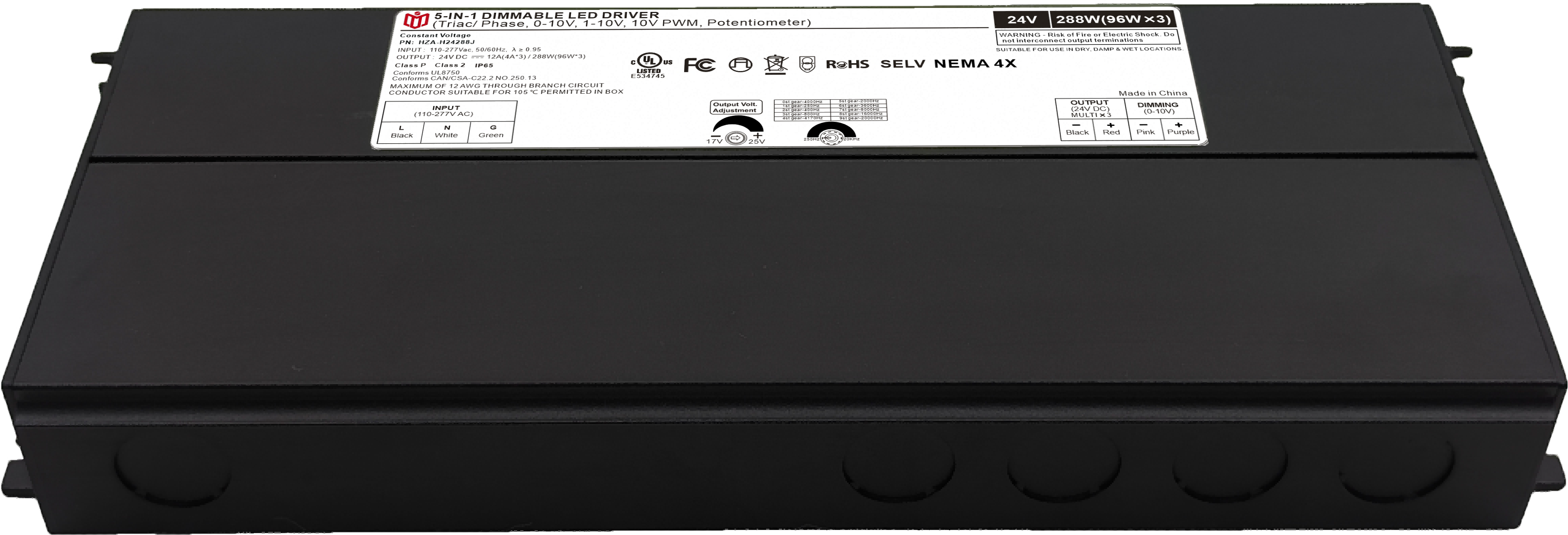 Item number: HZA-H24288J,HZA-H48288J Dim: Triac/0-10V/1-10V/10V PWM / Potentiometer Dimming method: PWM Input Voltage: 110-277V Output Voltage: 24V/48V PF: ≥0.9 Efficiency: ≥91% Protection: short circuit,overload,over-temperature, Certificate: UL list Brand: DEMI