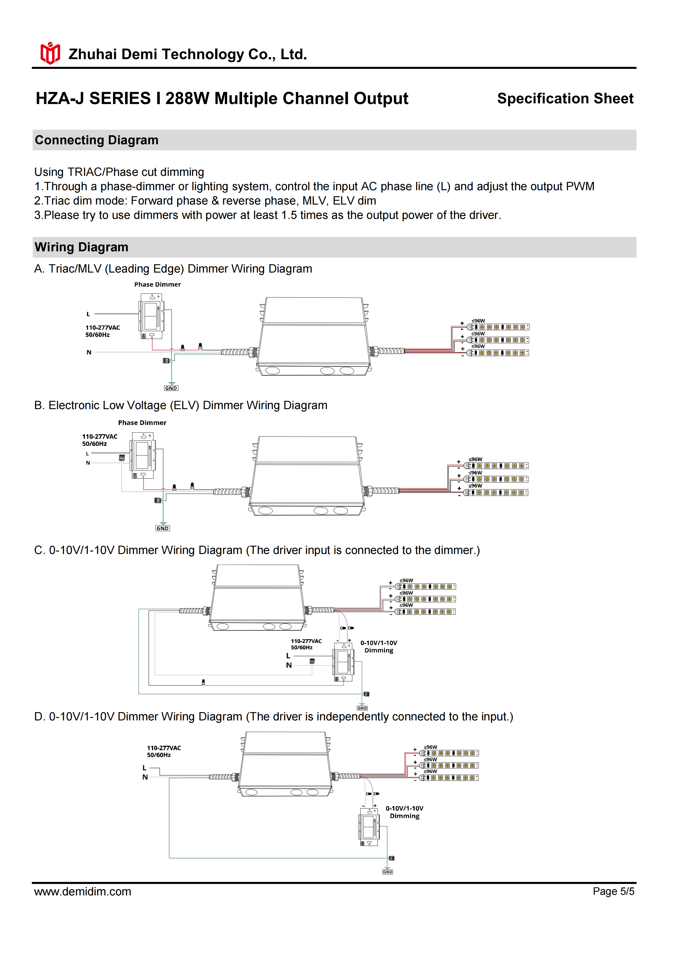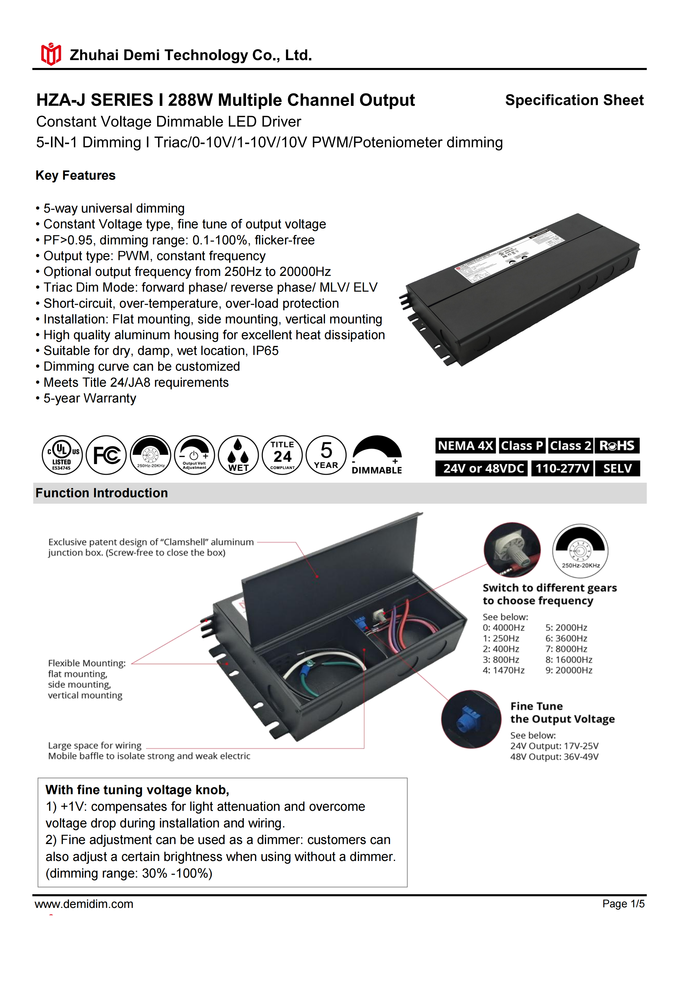 Item number: HZA-H12120J,HZA-H24120J Type: Constant Voltage Dim: Triac/0-10V/1-10V/10V PWM / Potentiometer Dimming method: PWM Input Voltage: 110-277V Output Voltage: 12V/24V PF: ≥0.9 Efficiency: ≥90% Protection: short circuit,overload,over-temperature, Certificate: UL list Brand: DEMI