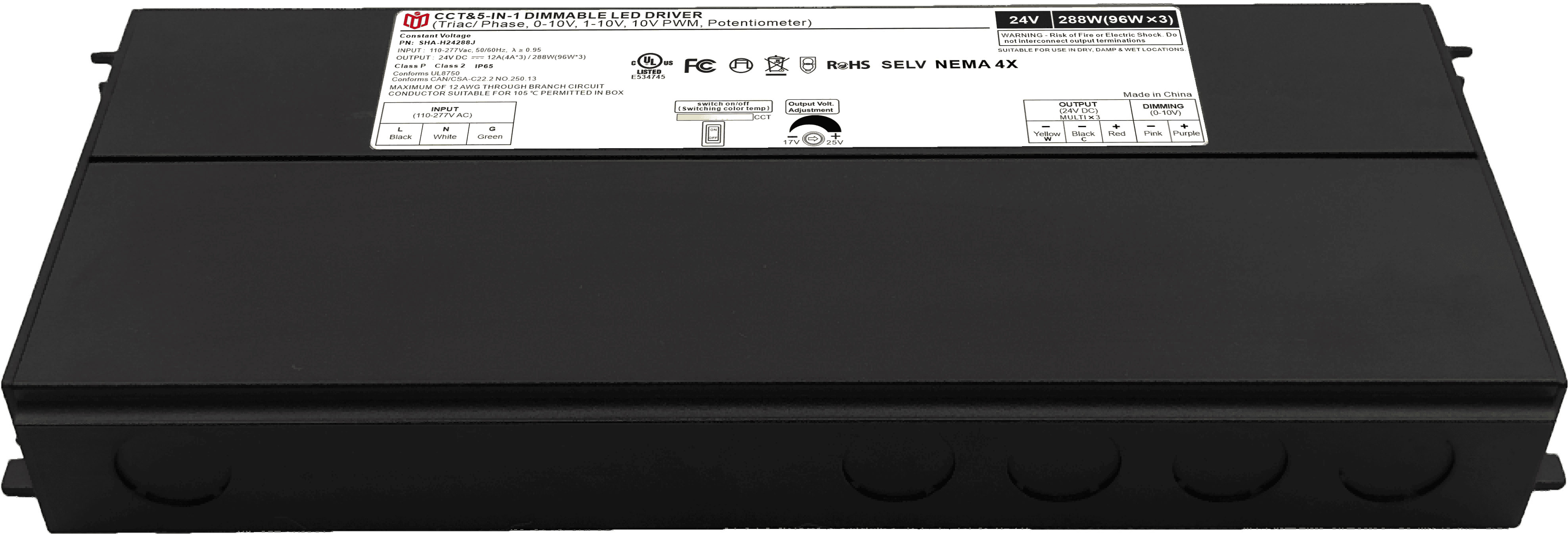 Item number: SHA-H24288J,SHA-H48288J Dim: Triac/0-10V/1-10V/10V PWM / Potentiometer Output Method: PWM Input Voltage: 110-277V Output Voltage: 24V/48V PF: ≥0.9 Efficiency: ≥91% Warranty: 5 years. Protection: short circuit,overload,over-temperature, Certificate: UL list Brand: DEMI