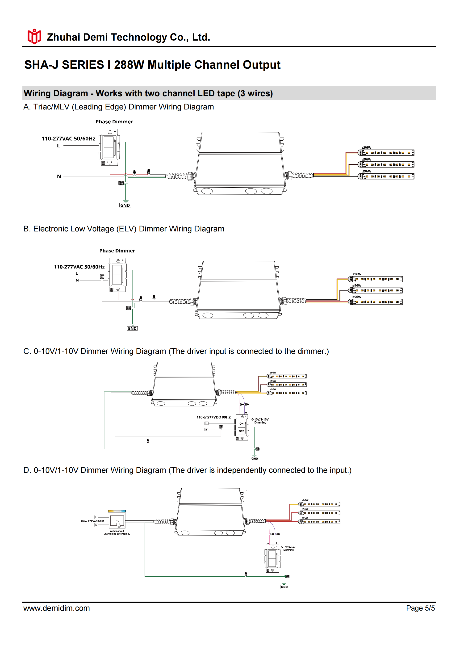 Item number: SHA-12200J,SHA-24200J,SHA-48200J Dim: Triac/0-10V/1-10V/10V PWM / Potentiometer Output Method: PWM Input Voltage: 110-277V Output Voltage: 12V/24V/48V PF: ≥0.9 Efficiency: ≥90% Warranty: 5 years. Protection: short circuit,overload,over-temperature, Certificate: UL list Brand: DEMI