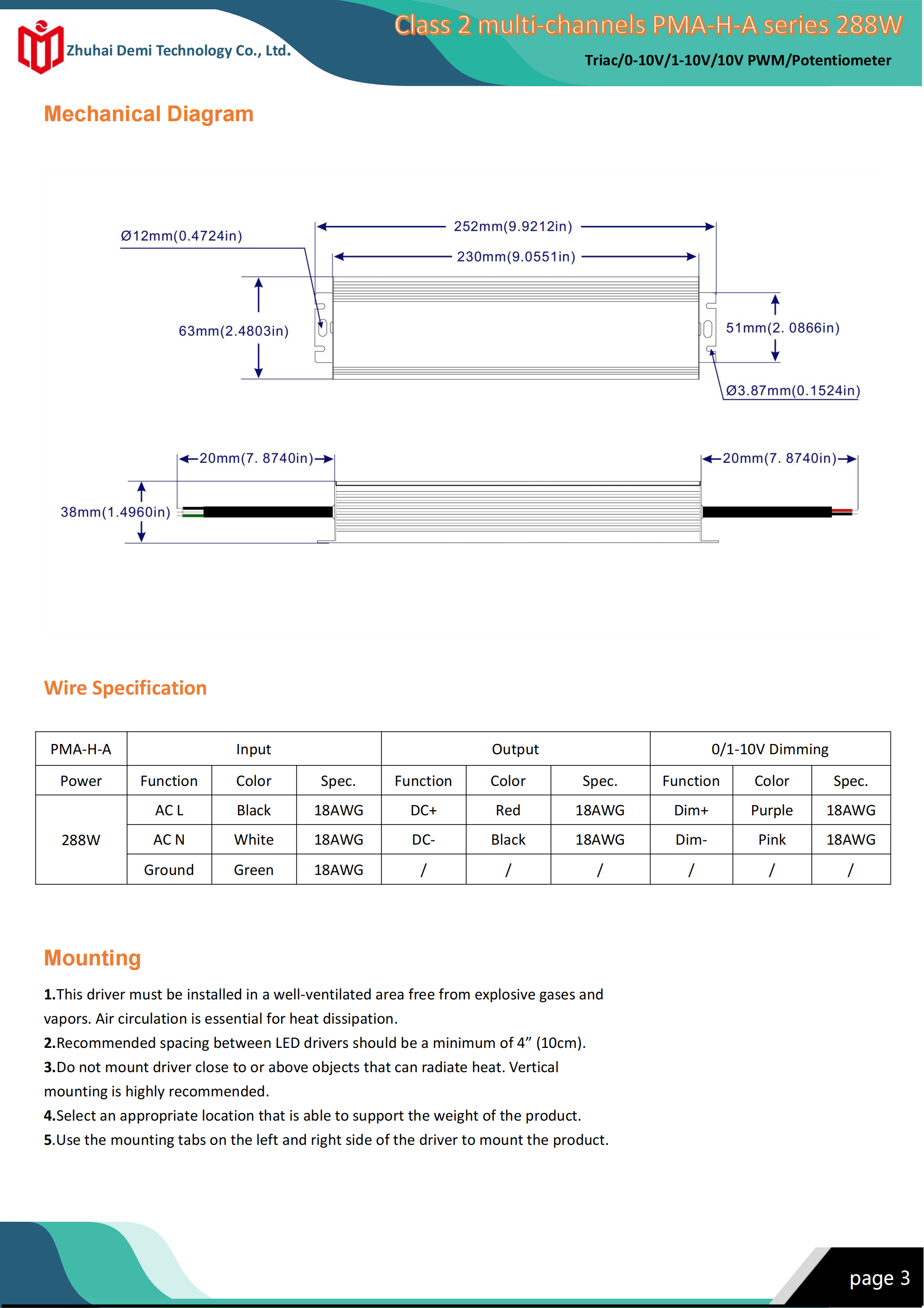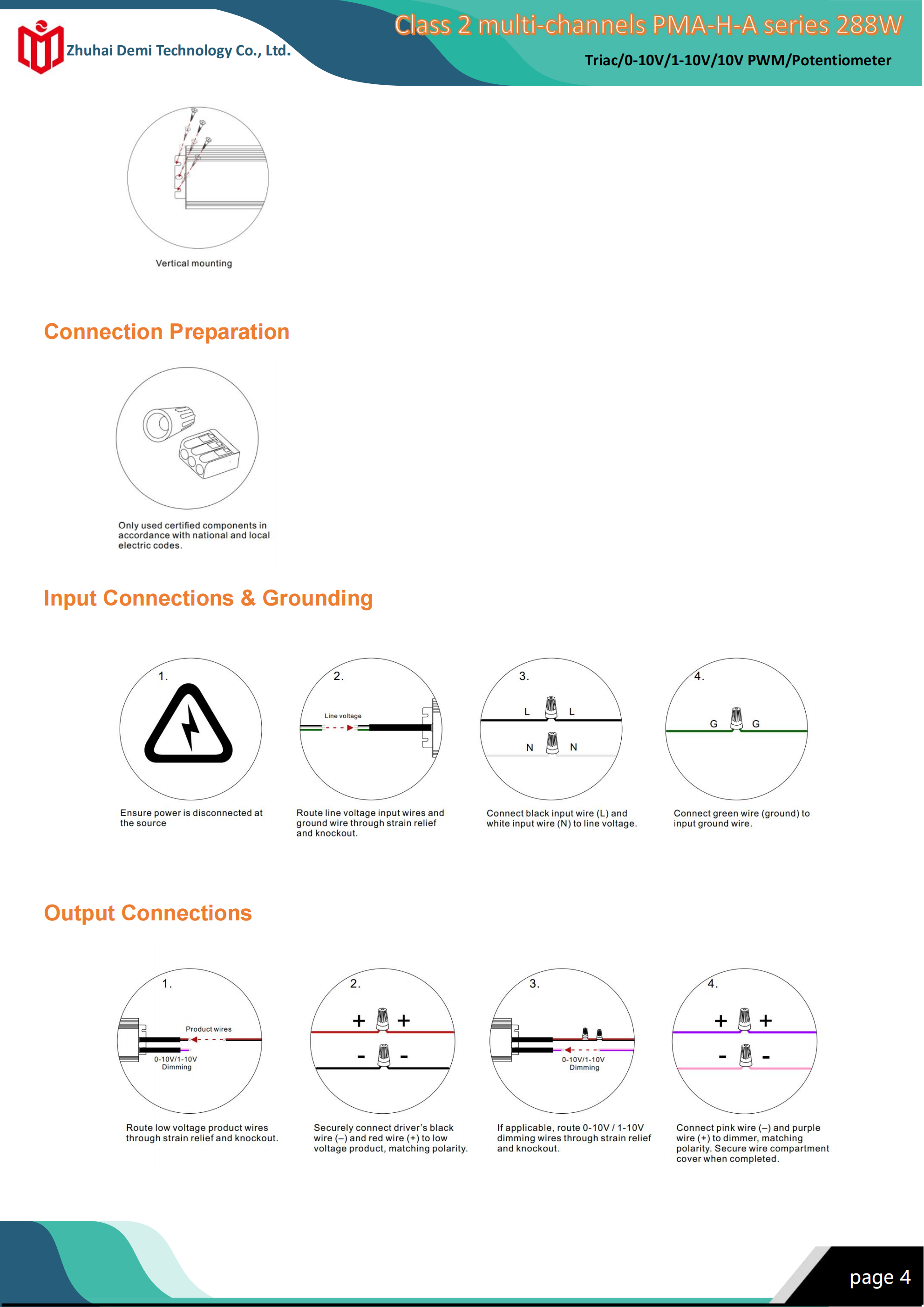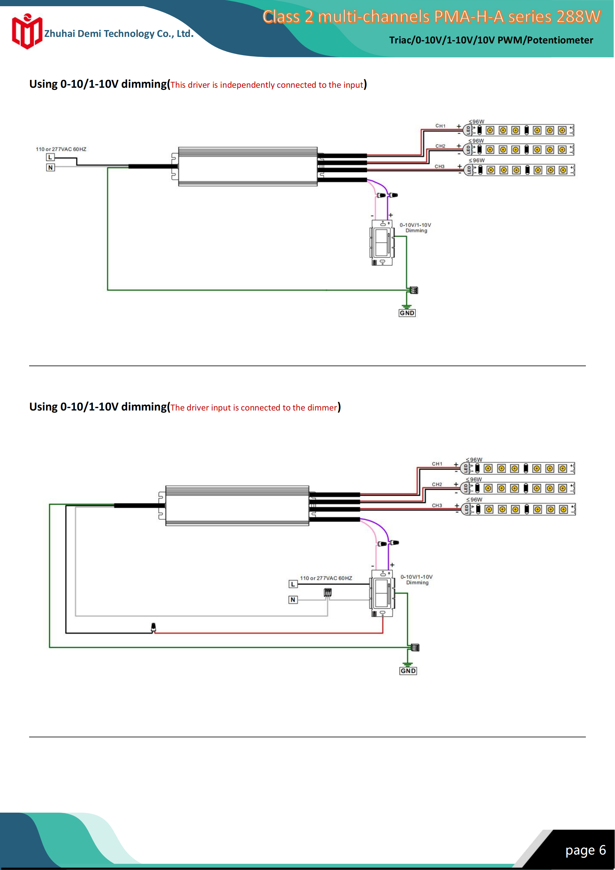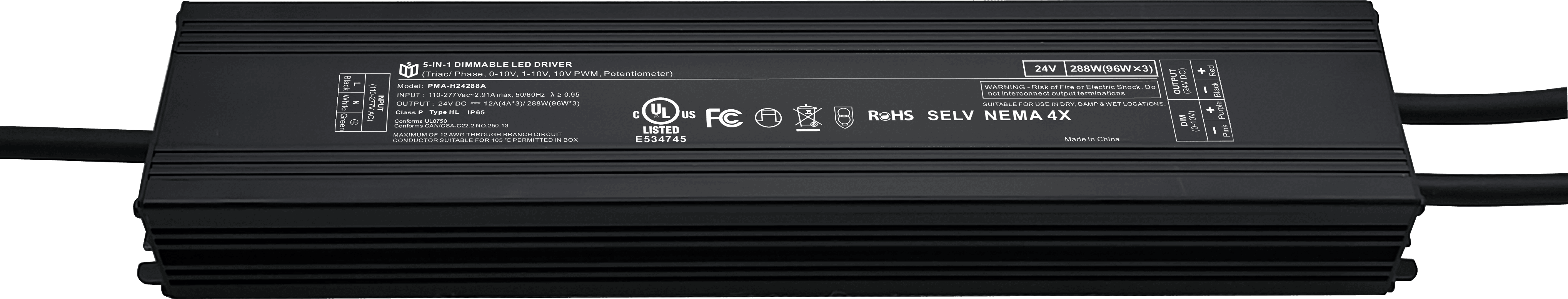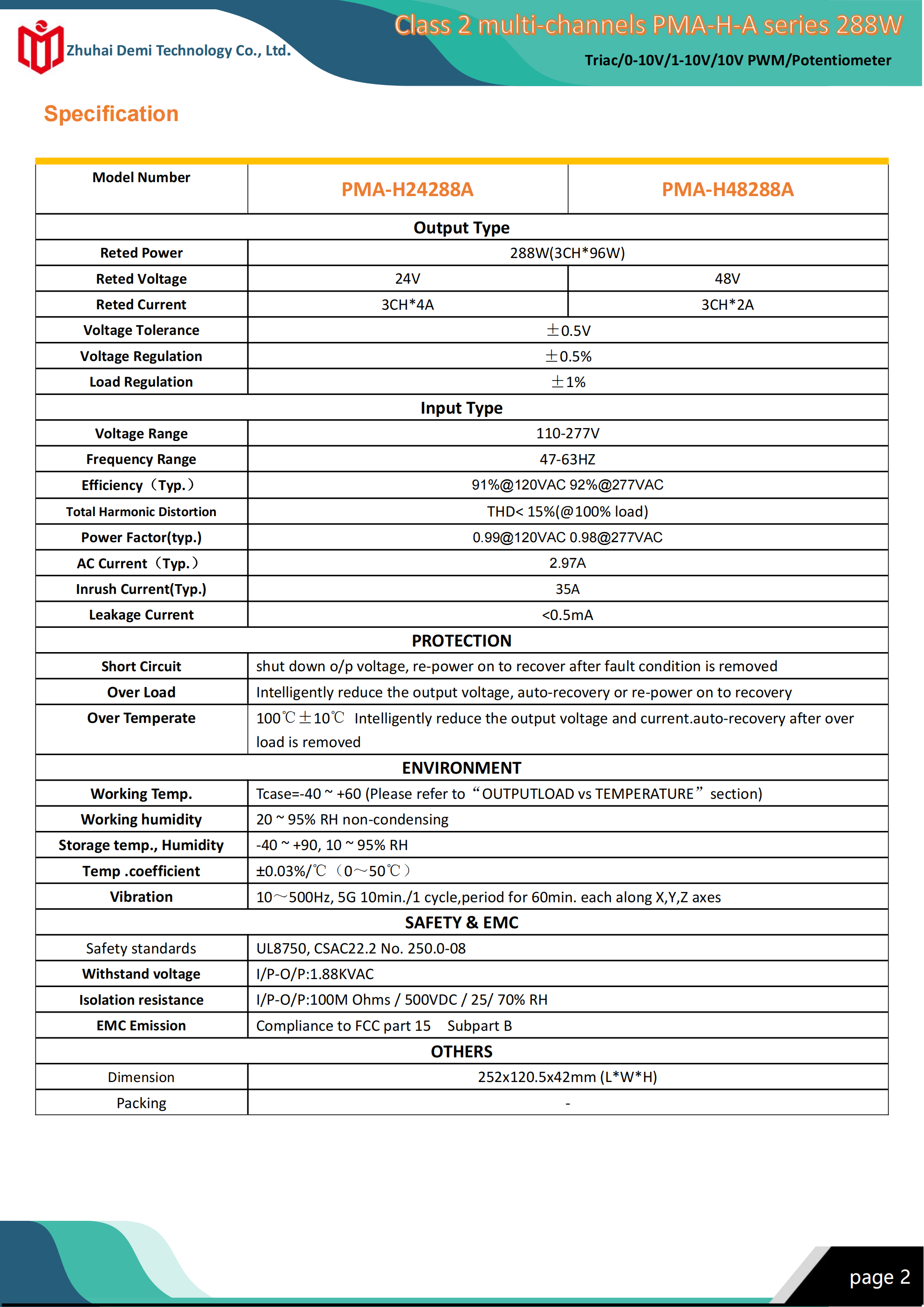 Item number:PMA-H24288A PMA-H48288A Dim: Triac/0-10V/1-10V/10V PWM / Potentiometer Output Method: PWM Input Voltage: 110-277V Output Voltage: 24V/48V PF: ≥0.9 Efficiency: ≥85% Warranty: 5 years. Protection: short circuit,overload,over-temperature, Certificate: UL list Brand: DEMI
