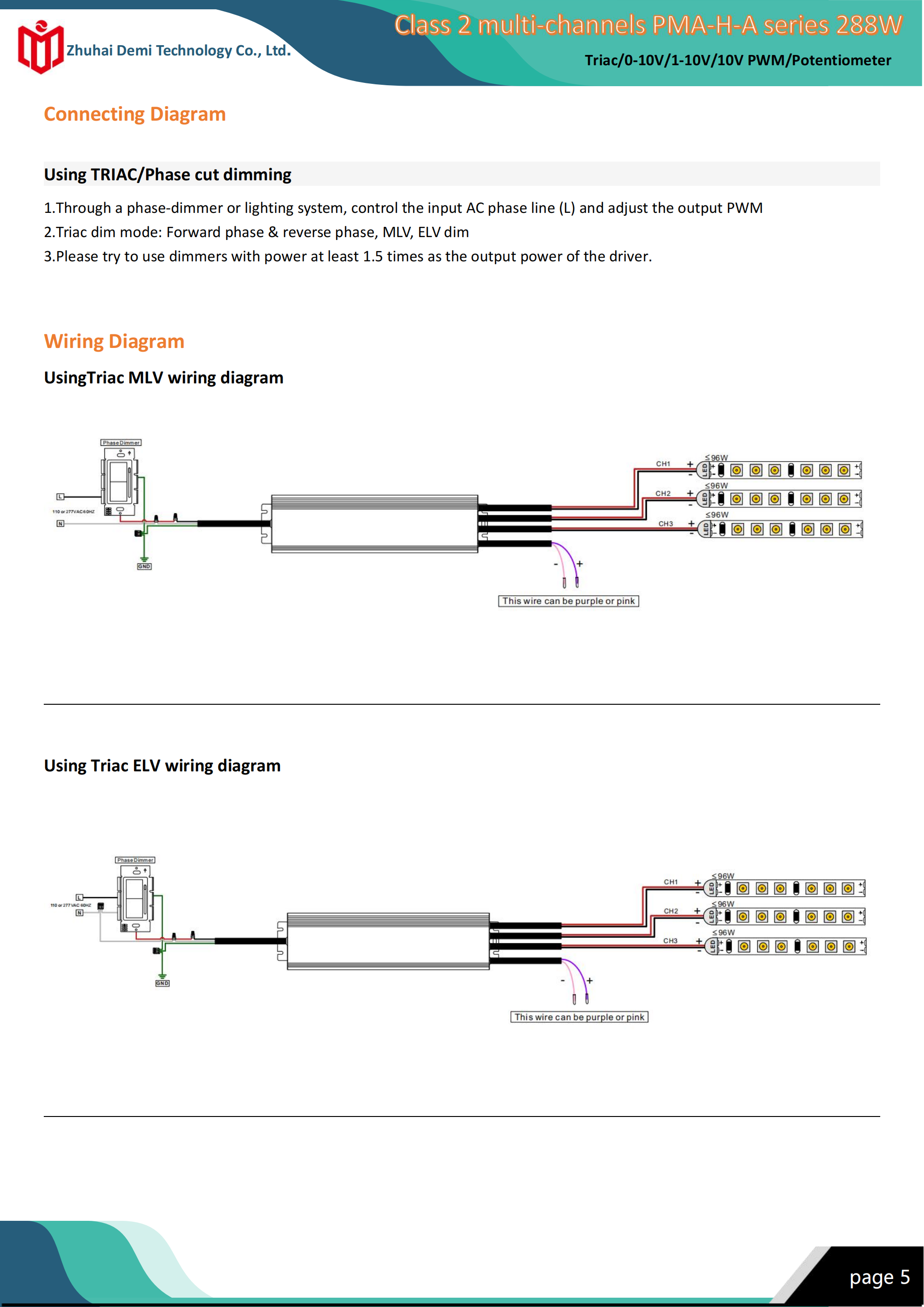Item number:PMA-H12300A Dim: Triac/0-10V/1-10V/10V PWM / Potentiometer Output Method: PWM Input Voltage: 110-277V Output Voltage: 12V PF: ≥0.9 Efficiency: ≥85% Warranty: 5 years. Protection: short circuit,overload,over-temperature, Certificate: UL list Brand: DEMI