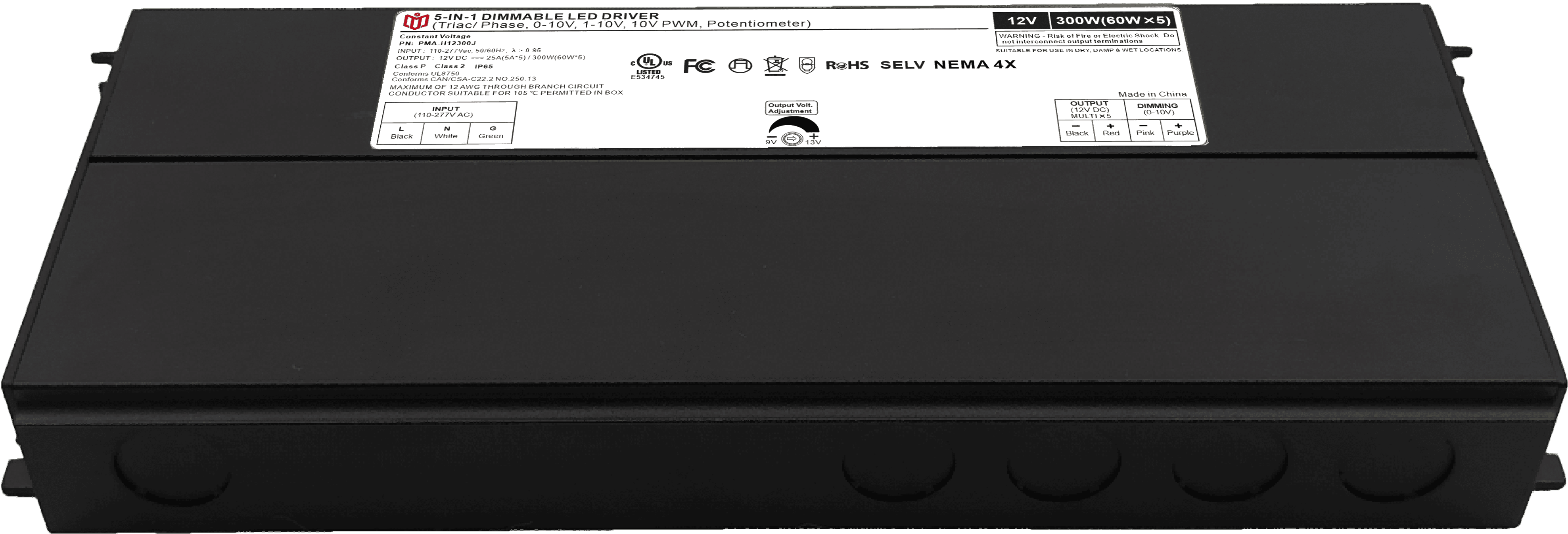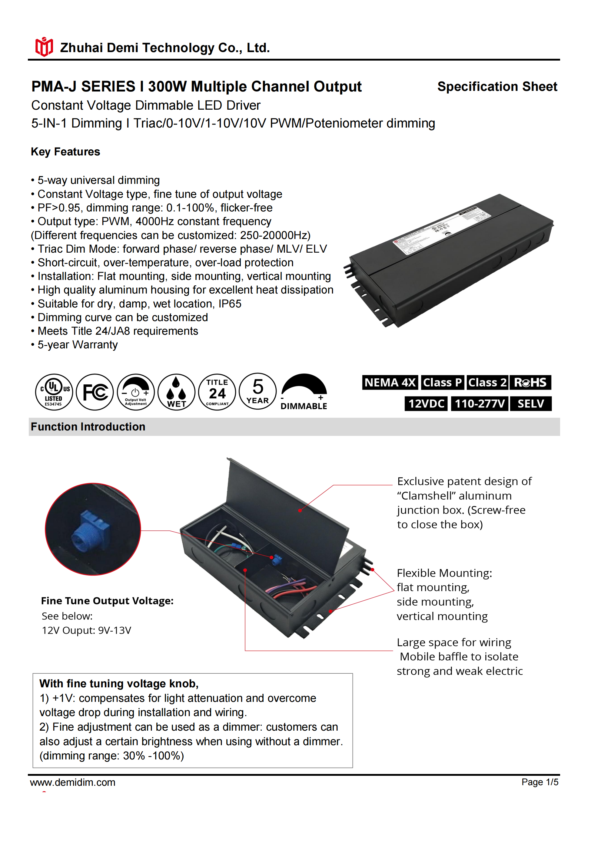 Item number: PMA-12300J Type: Constant Voltage Dim: Triac/0-10V/1-10V/10V PWM / Potentiometer Output Method: PWM Input Voltage: 110-277V Output Voltage: 12V PF: ≥0.9 Efficiency: ≥91% Warranty: 5 years. Protection: short circuit,overload,over-temperature, Certificate: UL list Brand: DEMI