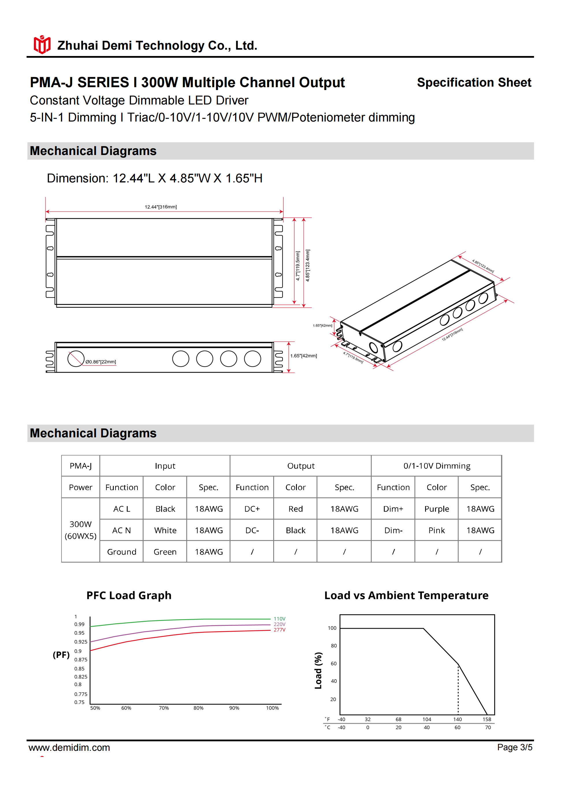 Item number: PMA-12300J,PMA-24300J,PMA-48300J, Type: Constant Voltage Dim: Triac/0-10V/1-10V/10V PWM / Potentiometer Output Method: PWM Input Voltage: 110-277V Output Voltage: 12V/24V/48V PF: ≥0.9 Efficiency: ≥91% Warranty: 5 years. Protection: short circuit,overload,over-temperature, Certificate: UL list Brand: DEMI