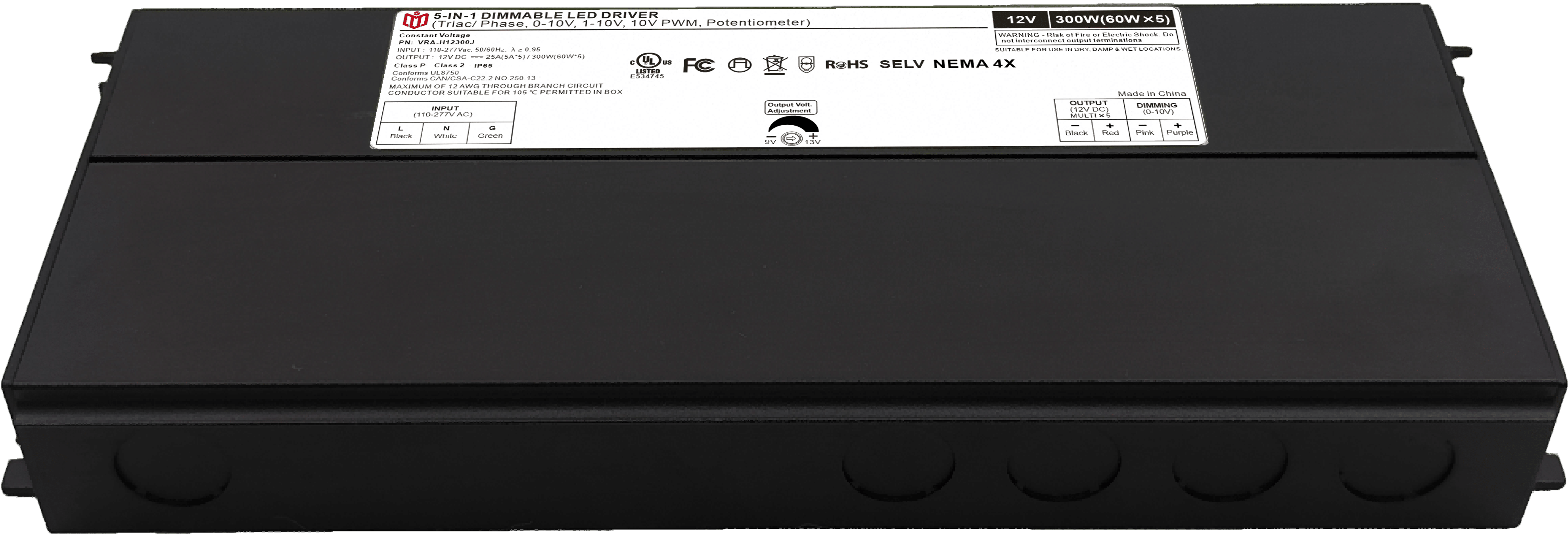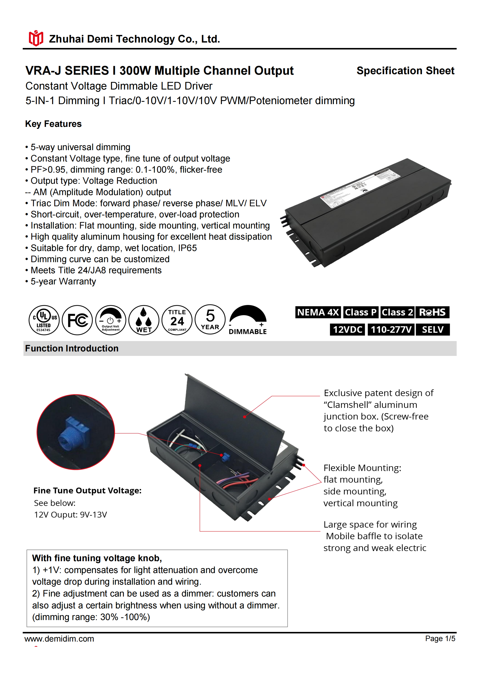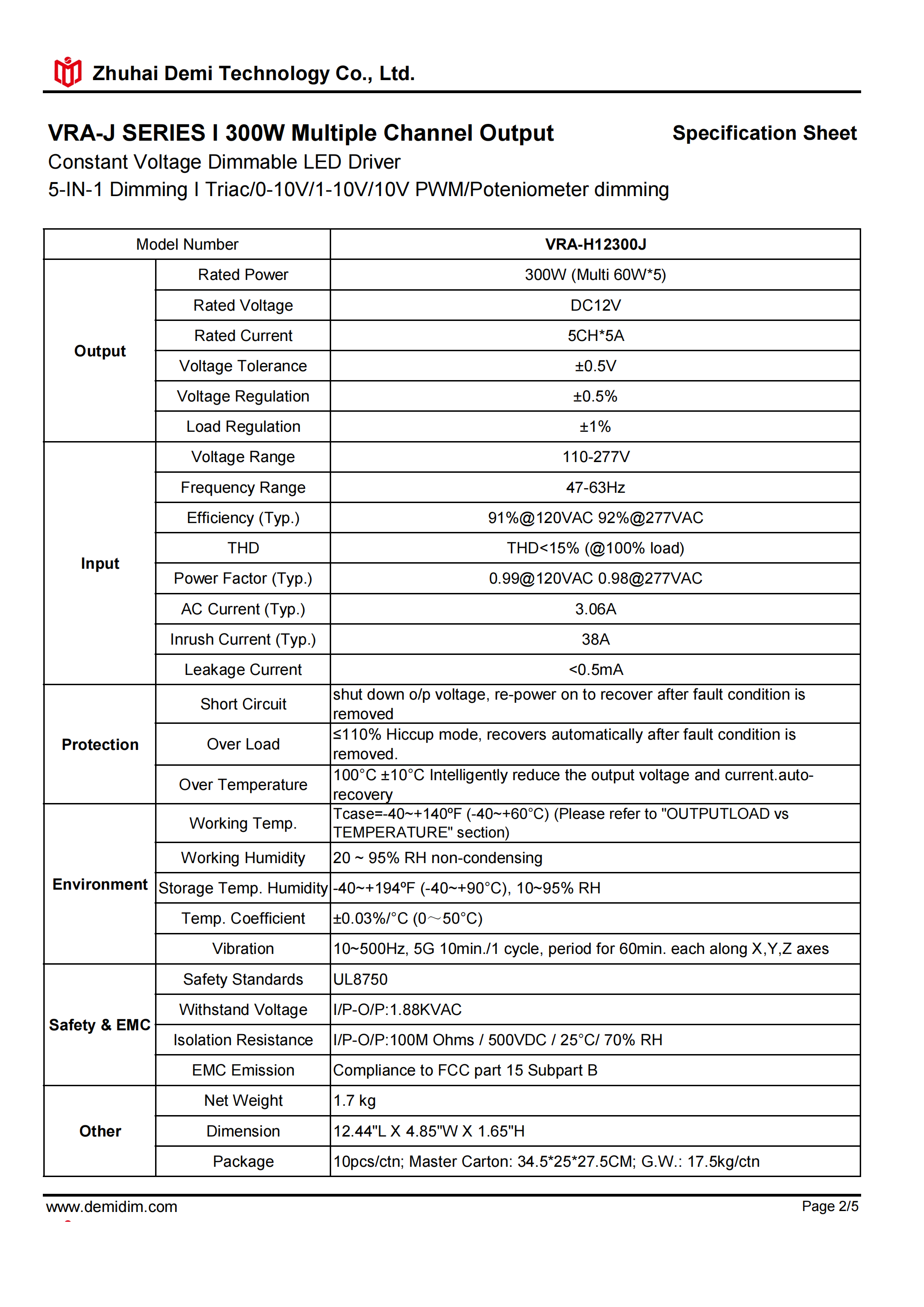 Item number: VRA-12300J,VRA-24300J,VRA-48300J, Type : Constant voltage Dimming Mode: Triac/0-10V/1-10V/10V PWM / Potentiometer Output Method: Amplitude Modulation Input Voltage: 110-277V Output Voltage: 12V/24V/48V PF: ≥0.9 Efficiency: ≥91% Warranty: 5 years. Protection: short circuit,overload,over-temperature, Certificate: UL list Brand: DEMI