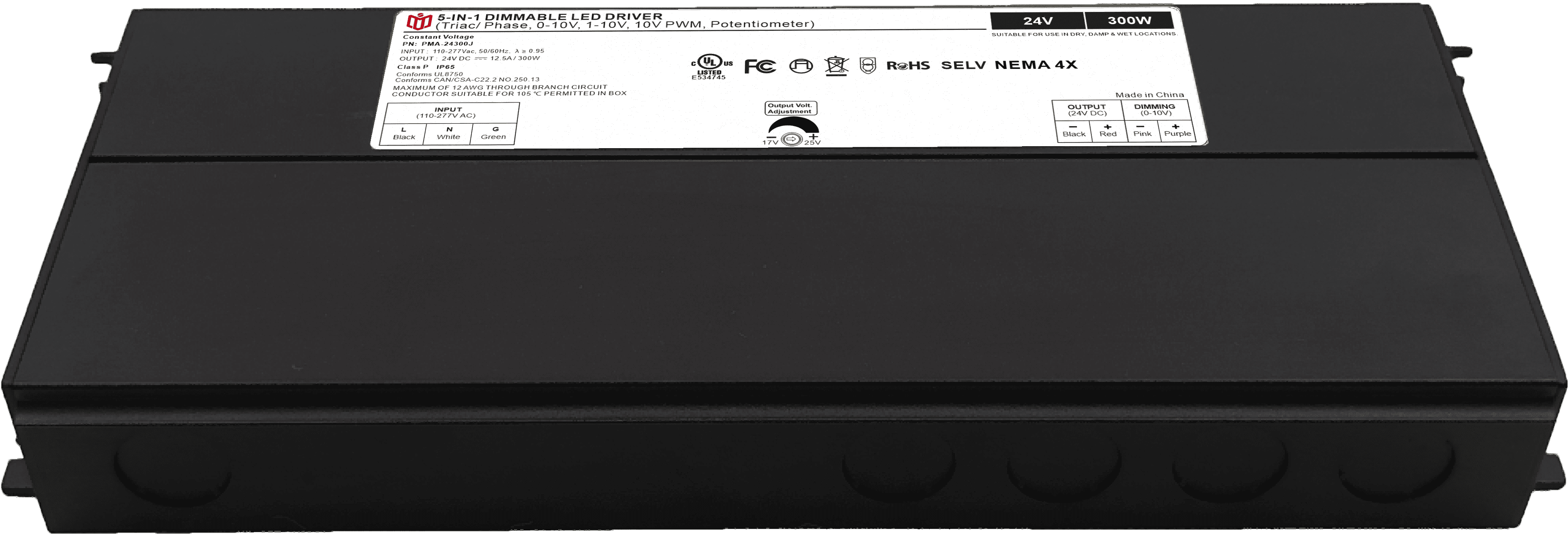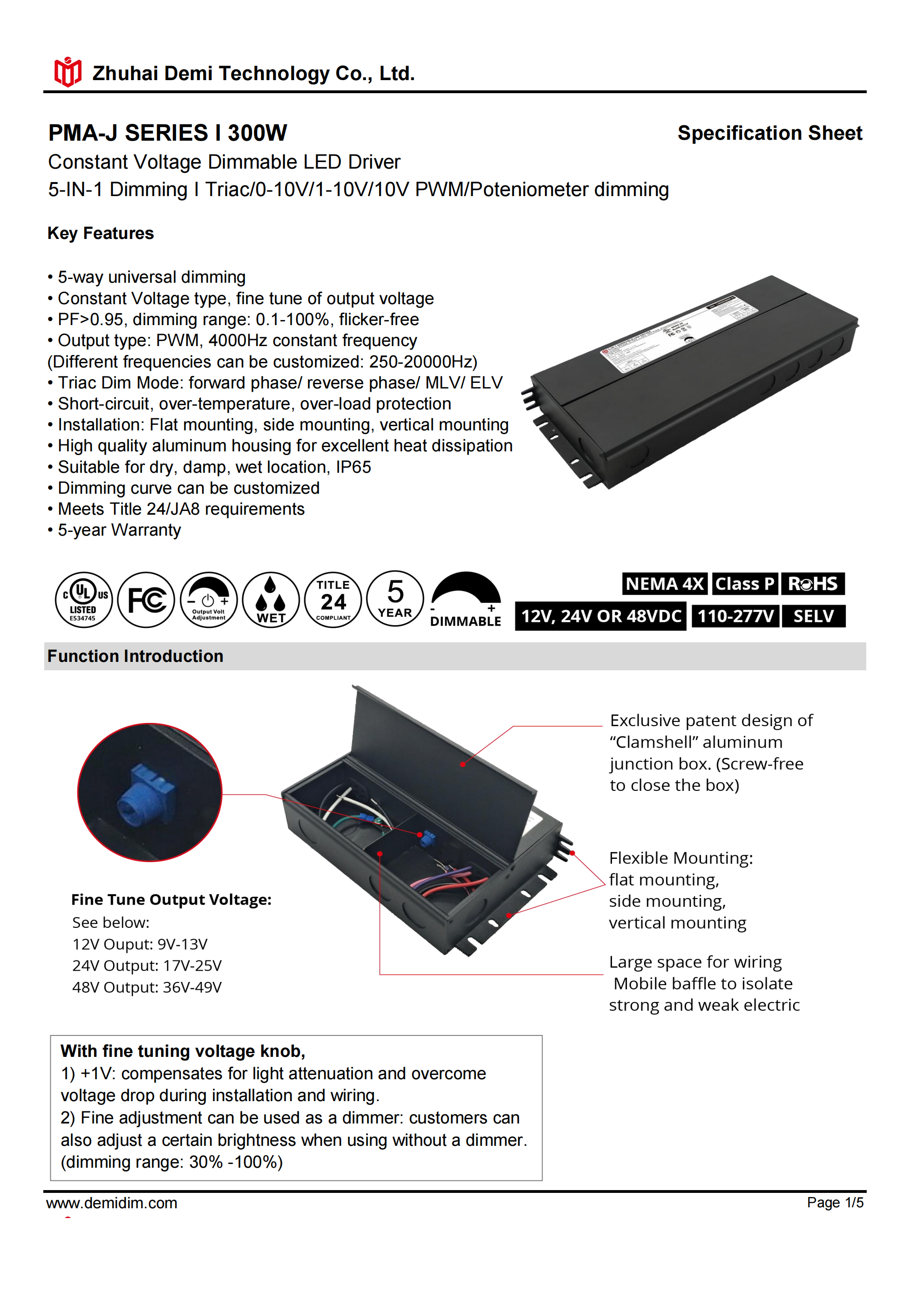 Item number: PMA-12300J,PMA-24300J,PMA-48300J, Type: Constant Voltage Dim: Triac/0-10V/1-10V/10V PWM / Potentiometer Output Method: PWM Input Voltage: 110-277V Output Voltage: 12V/24V/48V PF: ≥0.9 Efficiency: ≥91% Warranty: 5 years. Protection: short circuit,overload,over-temperature, Certificate: UL list Brand: DEMI