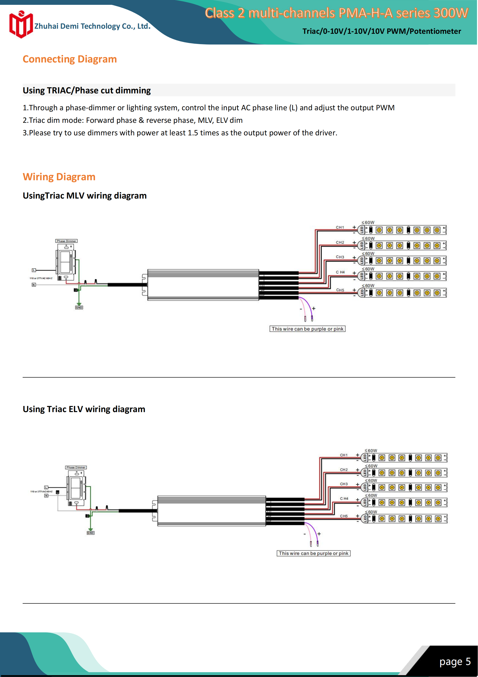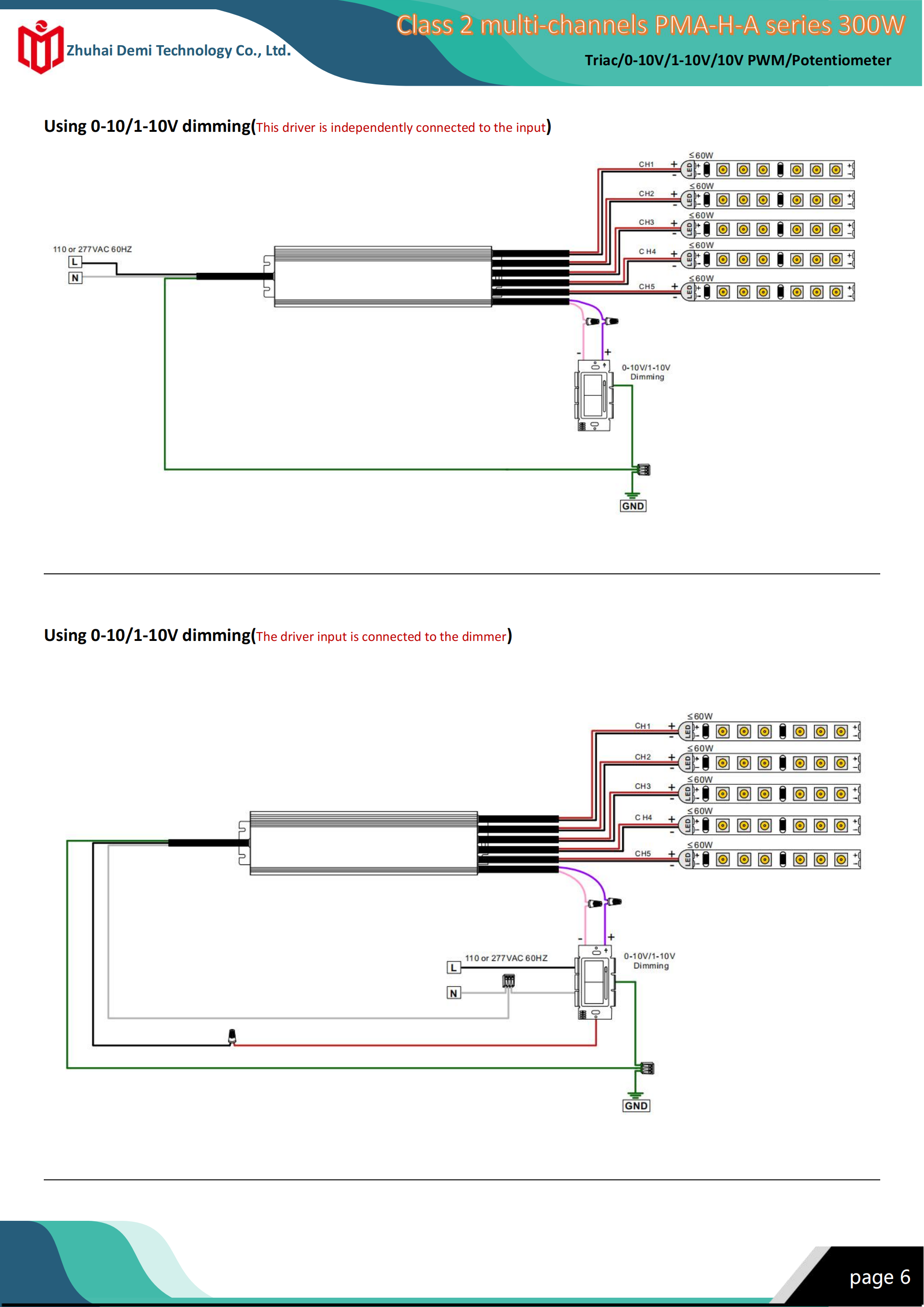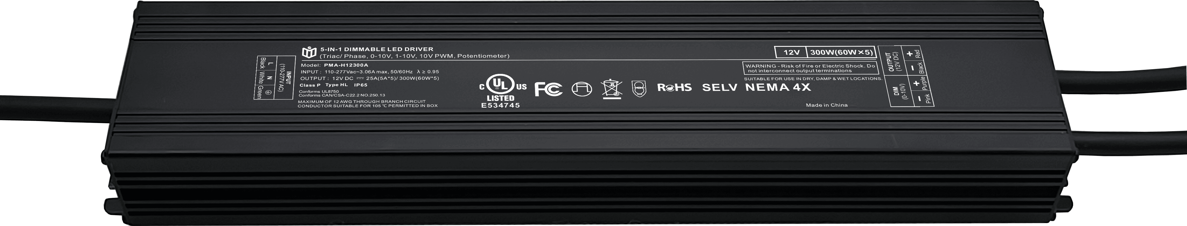 Item number:PMA-H12300A Dim: Triac/0-10V/1-10V/10V PWM / Potentiometer Output Method: PWM Input Voltage: 110-277V Output Voltage: 12V PF: ≥0.9 Efficiency: ≥85% Warranty: 5 years. Protection: short circuit,overload,over-temperature, Certificate: UL list Brand: DEMI
