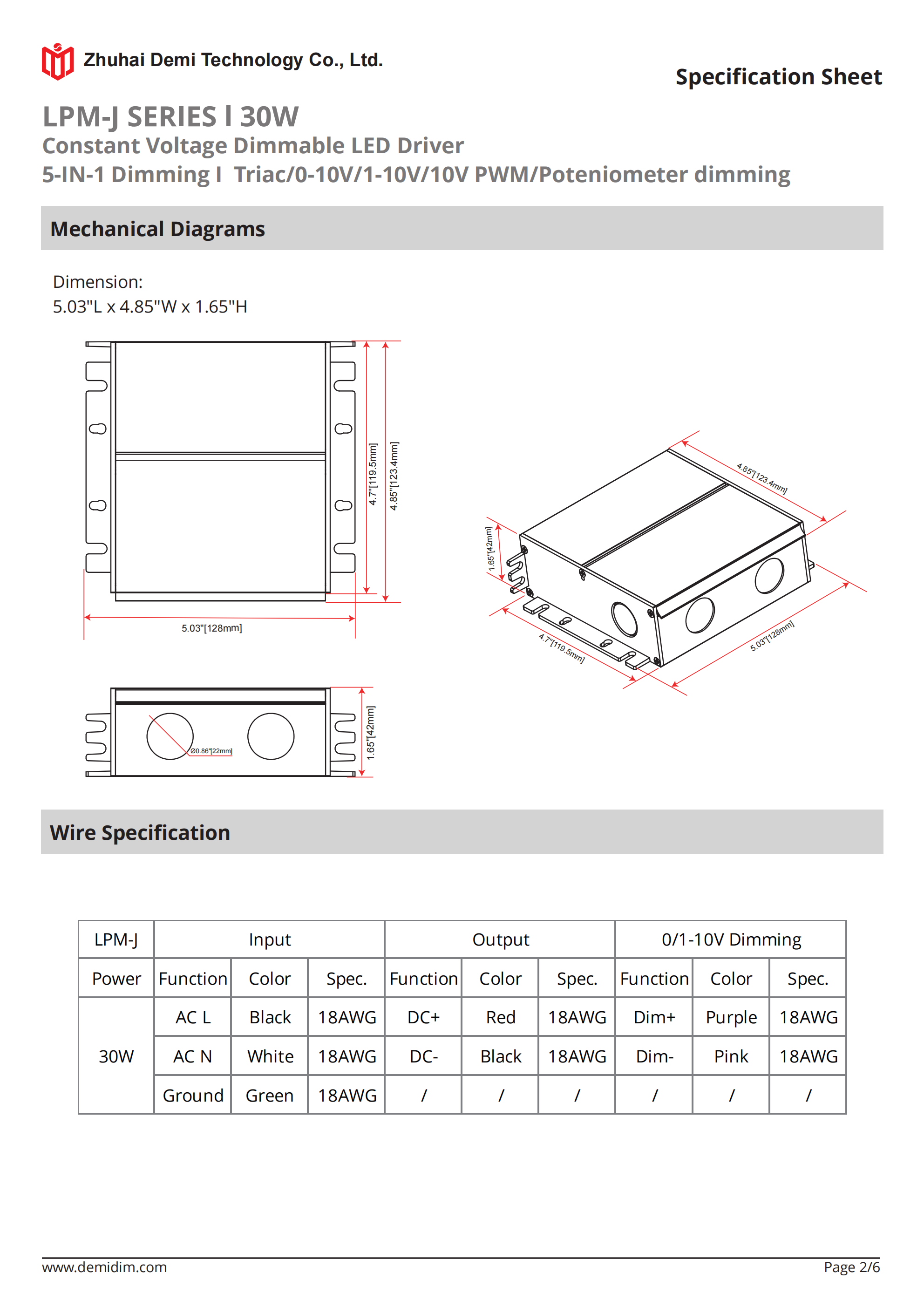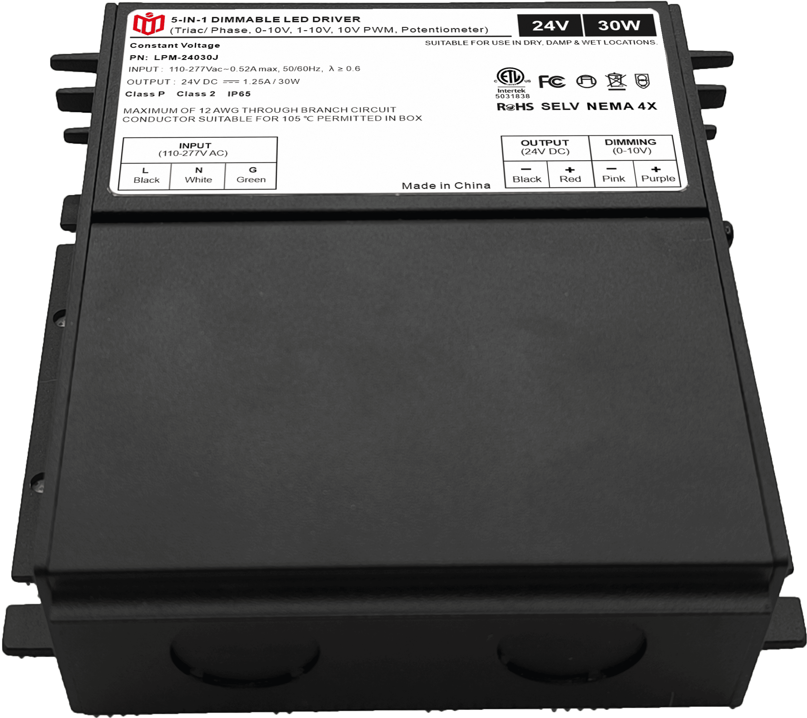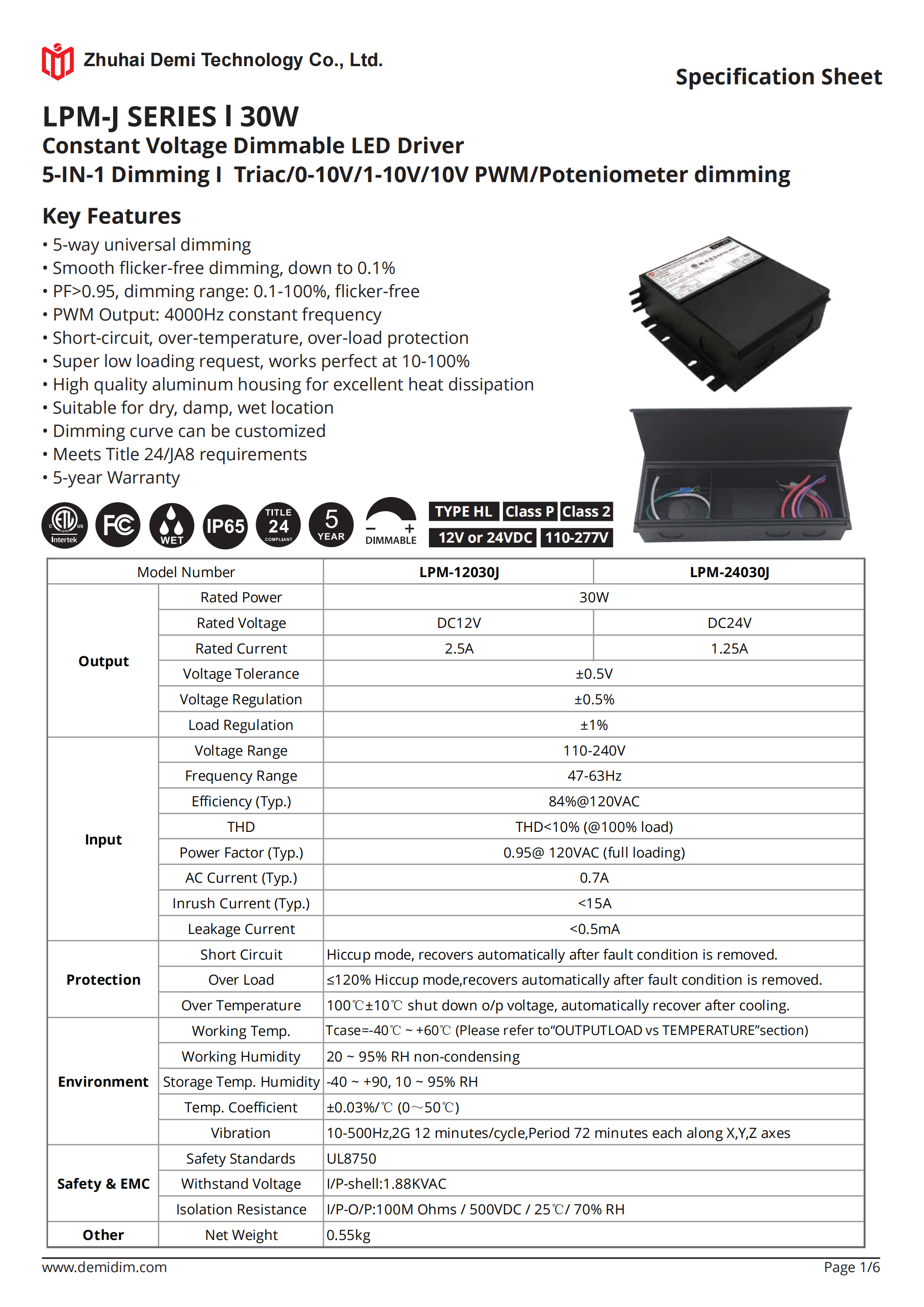 Item number: LPM-12030J,LPM-24030J Dim: Triac/0-10V/1-10V/10V PWM / Potentiometer Dimming method: PWM Input Voltage: 110-277V Output Voltage: 12V/24V PF: ≥0.9 Efficiency: ≥84% Warranty: 5 years. Protection: short circuit,overload,over-temperature, Certificate: ETL list Brand: DEMI